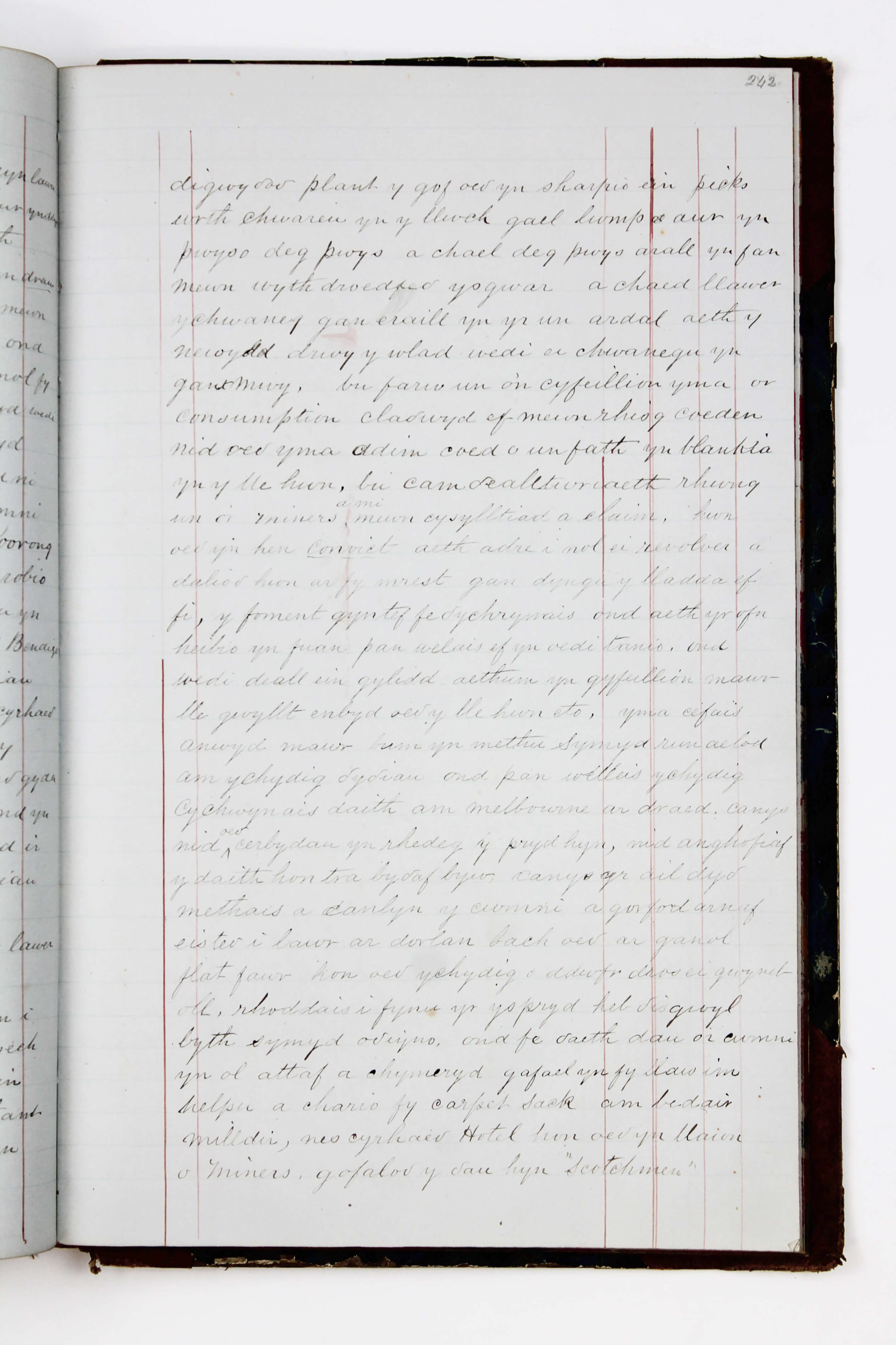 The journal features Owen’s extensive autobiography, composed in California in 1885, recording his life in Wales and Australia. The author recounts his early education in Amlwch, his brief training as a sea captain, and his eventual career as a carpenter. Especially interesting is Owen’s eight-page account of the Victorian Gold Rush, mentioning the most common route from Amlwch to Melbourne (via ship “Falcon” from Liverpool), the city’s overcrowded housing, and rising rent prices. He recalls moving between various mining districts (Forest Creek, Bendigo, McIvor, and Ballarat) with fellow Welshmen in search of new goldfields, enduring lice-infested shanties, and the constant threat of robbers. Importantly, Owen also discusses the religious life of Welsh miners and notes his efforts to establish a Welsh Sunday School at McIvor and a formal chapel in Ballarat. Towards the end, the author provides a detailed account of the Eureka Rebellion (the historic 1854 revolt of gold miners against the British colonial administration), describing the collapse of his mining shaft and the grim sight of dead bodies at the barricades. The autobiography concludes with Owen’s description of his journey home and his subsequent years operating foundry and shop businesses in Amlwch Port. This section of the journal is supplemented by an eight-page handwritten English translation of part of the autobiography, written on the versos of official Hotel Vance letterhead from Eureka, California.