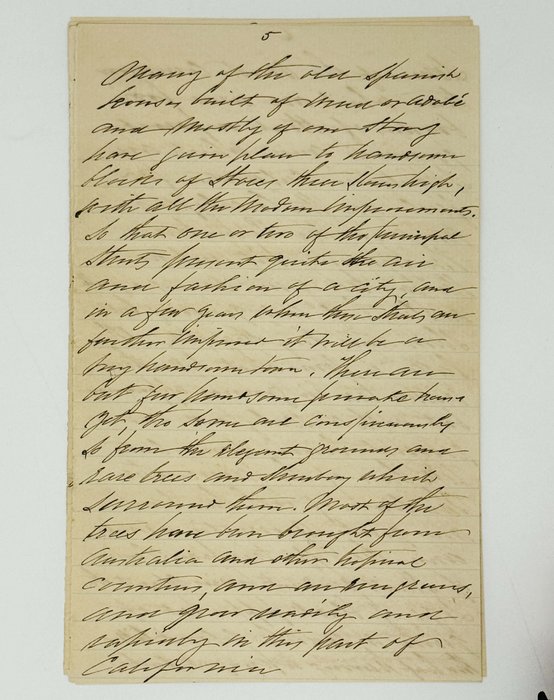 A great change however has taken place in the town within eight or ten years and such improvements have been made many of the old Spanish houses built of mud or adobe and mostly of one story have given way to handsome blocks of stores three stories high, with all the modern improvements. So that one or two of the principal streets present quite air and fashion of a city, and in a few years when – streets further improve it will be a – handsome town. There are but few handsome private houses yet, tho some are conspicuously so from the elegant grounds and rare trees and shrubbery which surround them. Most of the trees have been brought from Australia and other tropical countries, and are evergreens and grow easily and rapidly in this part of California.