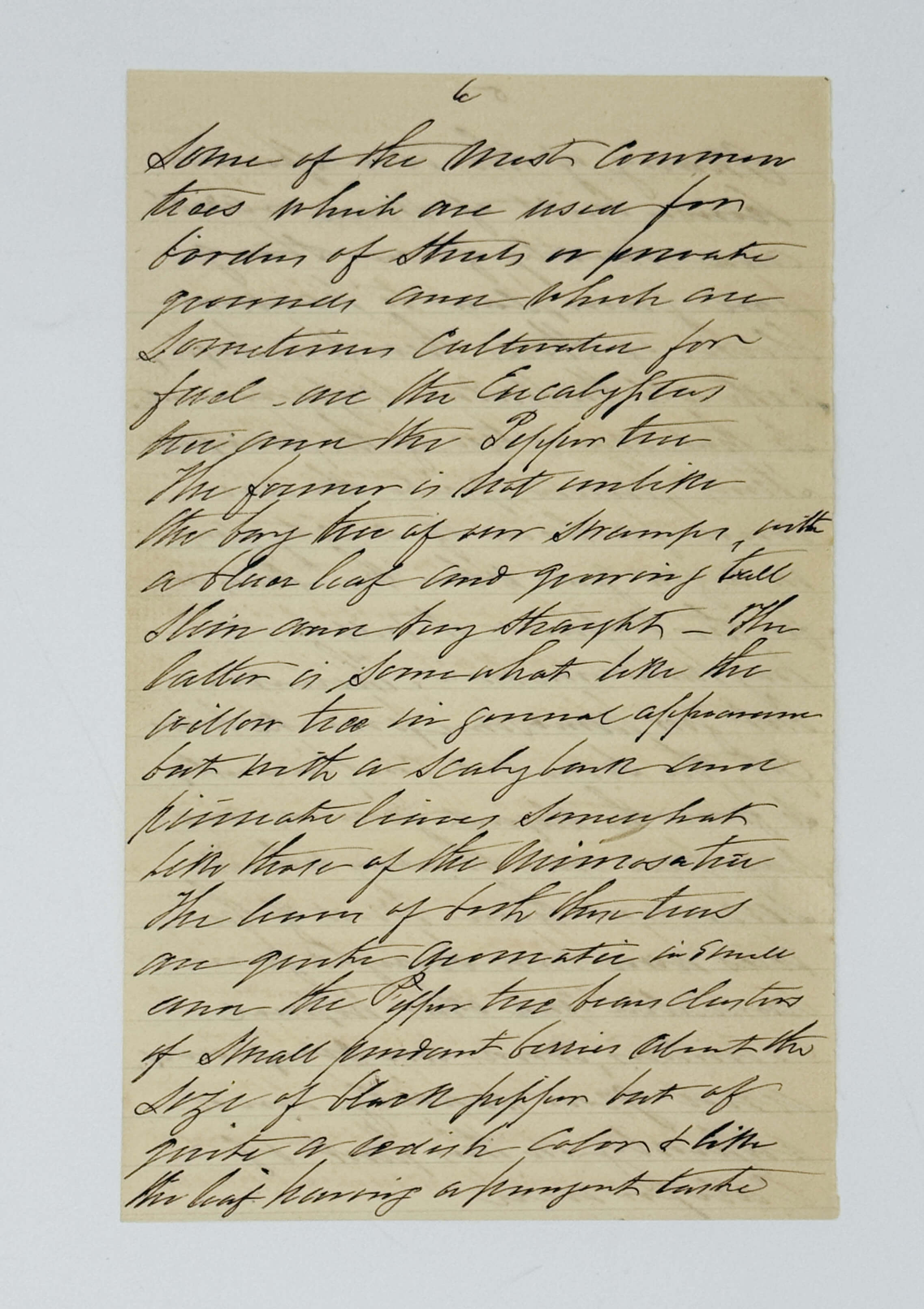 Some of the most common trees which are used for borders of streets or private grounds and which are sometimes cultivated for food are the Eucalyptus tree and the Pepper tree. The former is not unlike the bay tree of our swamps, with a bluer leaf and growing tall slim and busy straight. The latter is somewhat like the willow tree in general appearance but with a scaly bark and pinnate leaves somewhat like that of the mimosa tree. The leaves of both these trees are quite aromatic in smell and the Pepper tree bears clusters of small pendant berries about the size of black pepper but of quite a redish color + like the leaf having a pungent taste.