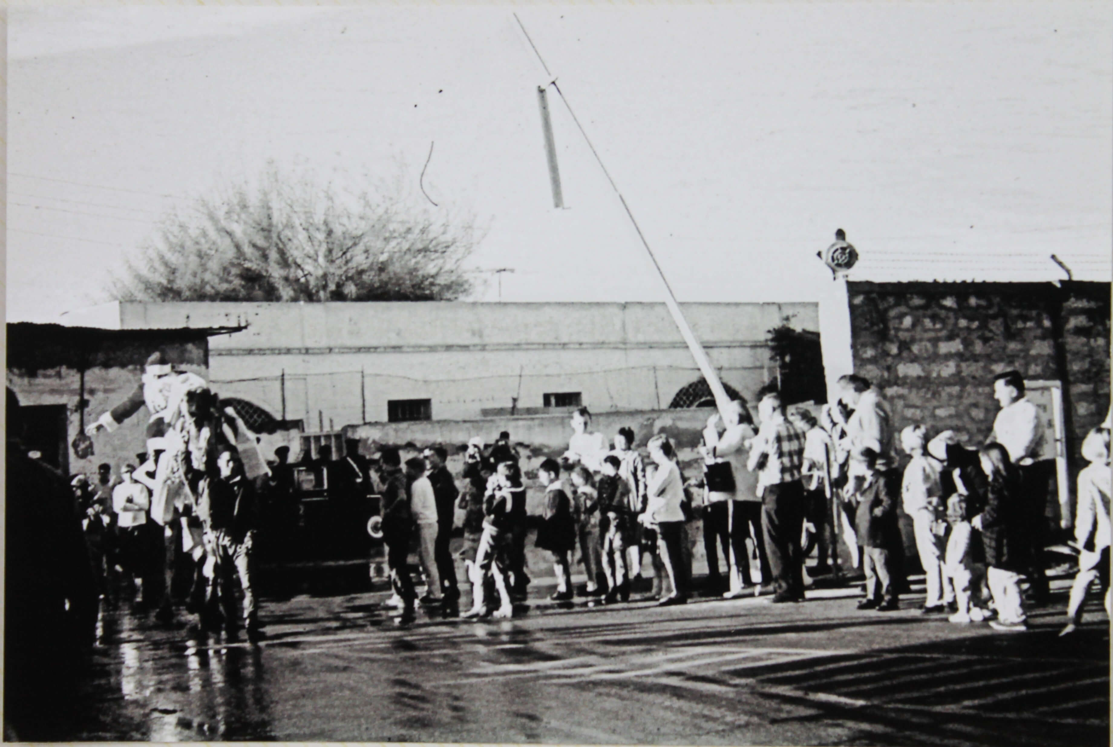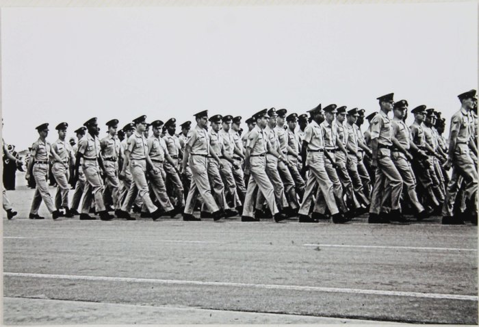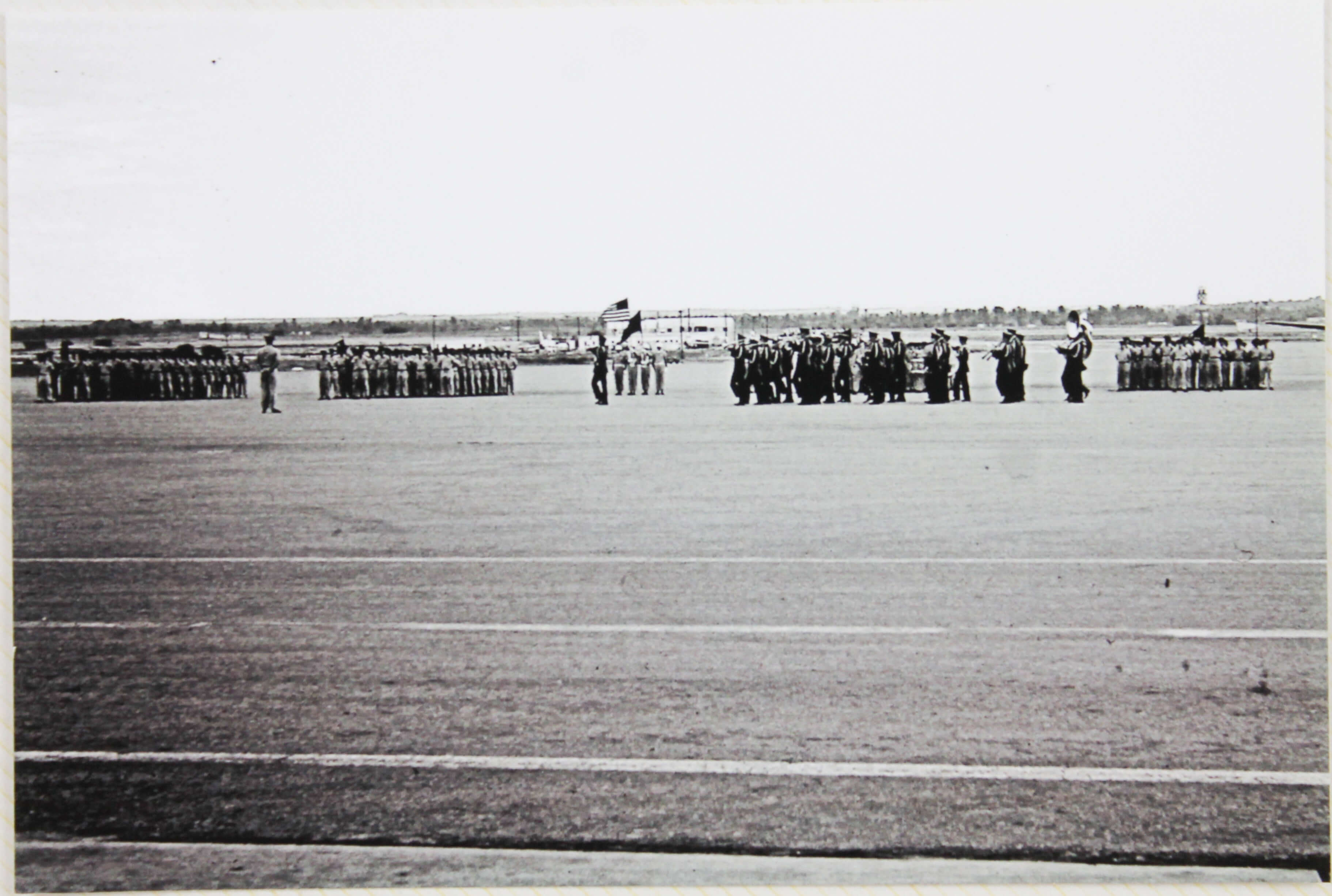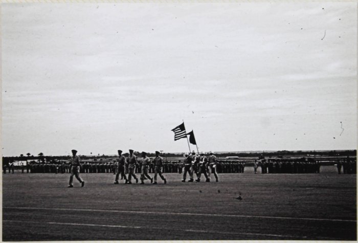 About twenty-five well-executed photos depict the grounds of Wheelus Air Base in the mid-1960s, including views of the memorial to the 7272nd Fighter Training Wing, the NCO Open Mess Club, Wheelus Television station, the base exchange, Pan American aircraft at a refueling point, and various U.S. Army and Air Force planes & machines. Several images document a military parade with soldiers marching in uniform, waving American and what appears to be Libyan flags, and accompanied by a military orchestra.
