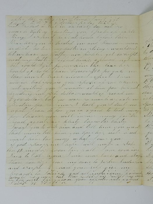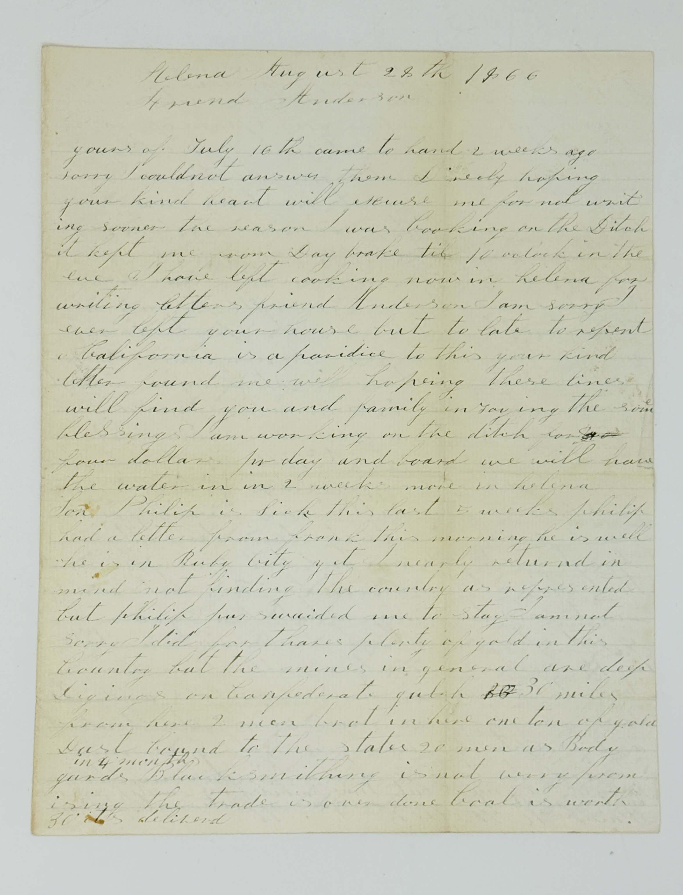 Excerpts from the first letter: “I am working on the ditch for four dollars per day and board. We will have the water in in 2 weeks more in Helena. Son Philip is sick this last five weeks Philip had a letter from frank this morning he is well he is in Ruby City yet I nearly returnd in mind not finding the country as represented but Philip purswaided me to stay. I am not sorry I did for thares plenty of gold in this Country but the mines in general are deep digings on Confederate gulch 30 miles from here 2 men brot in here one ton of gold dust bound to the state 20 men as Body gards. Blacksmithing is not verry promising the trade is one done boat is worth 30 its delivered. I offered him a pound not any bit could I get from him the Coaches could af sold their liquors $12 pr gal no thay must have more expect them now in California. You spoke of son Charles not writing you I wonder at him for his not sending me fifty dollars would saved me $100 dollars but no never so much as rate me Brother for so I must Call you I don’t know what I can do for you in regard to that money for chance none will insure money for the Road agents are plenty threw the Country. I want you to write him and tell him you have his note and must have the money what I owe you. If God shares me I hope I will make a stake in 18 months from this fall. I am coming back to Cal again.”
