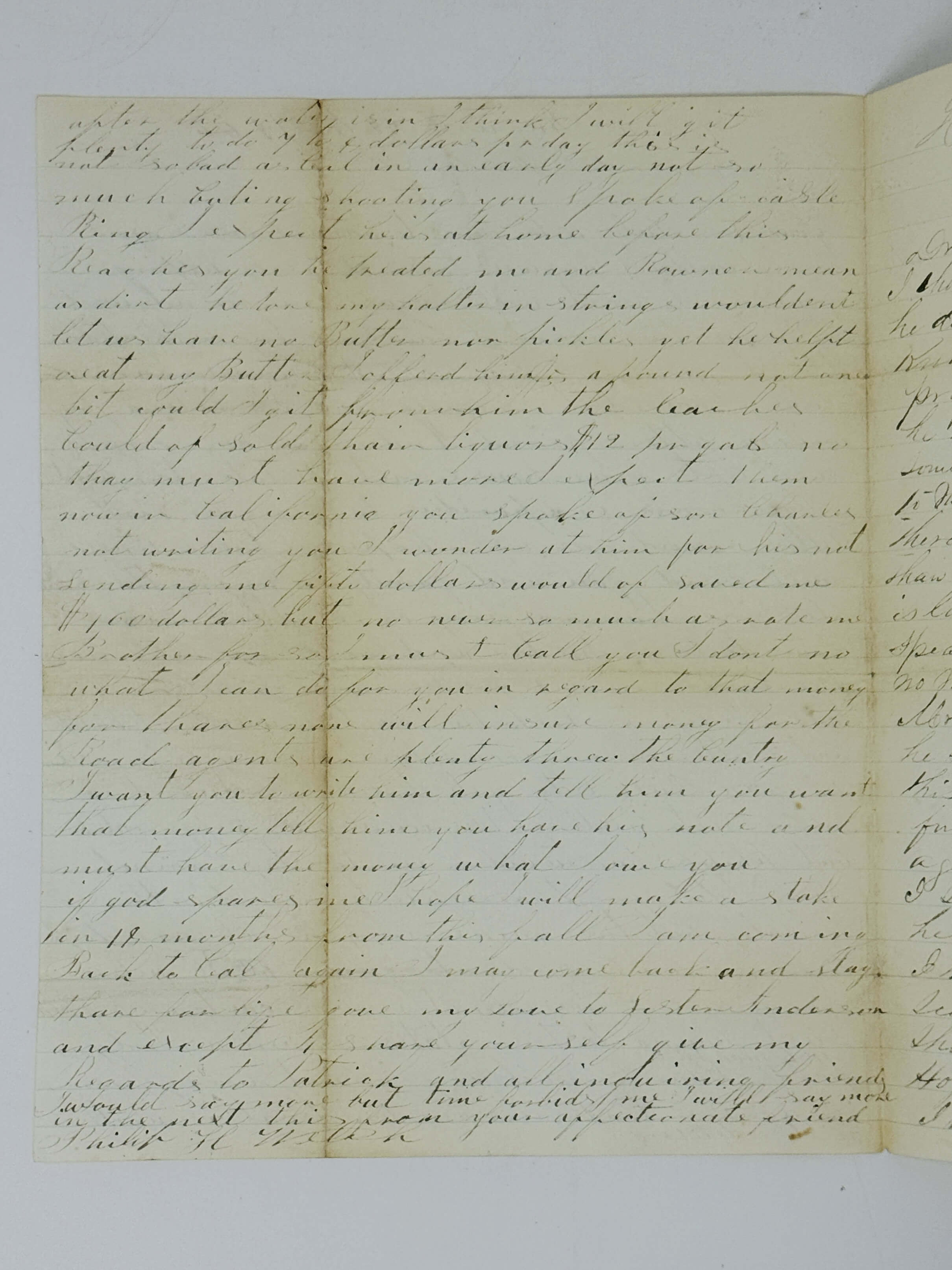 Excerpts from the second letter: “Dear Sir Father has written you and I thought I would say a few words as he does not speak with a perfect knowledge of some things that I profess to understand. In the first place, he has found, after remaining here for some time that this is a much better country to make money than Cal at the present. There is a prospect to find something better than can be found in Cal today. The Country is large and the mines are good general speaking. The difficulty is that there is no means of working there to adavantage. Mr Caseling is some where on the River, he seams to have a good opinion of the Country and says he is going to find something before he goes to Cal again he seems to think it is home. I saw him back a few days ago he was in a good health and spirits. I think this Country better than any I have seen since I first left Cal and I shuld try and persuade.”