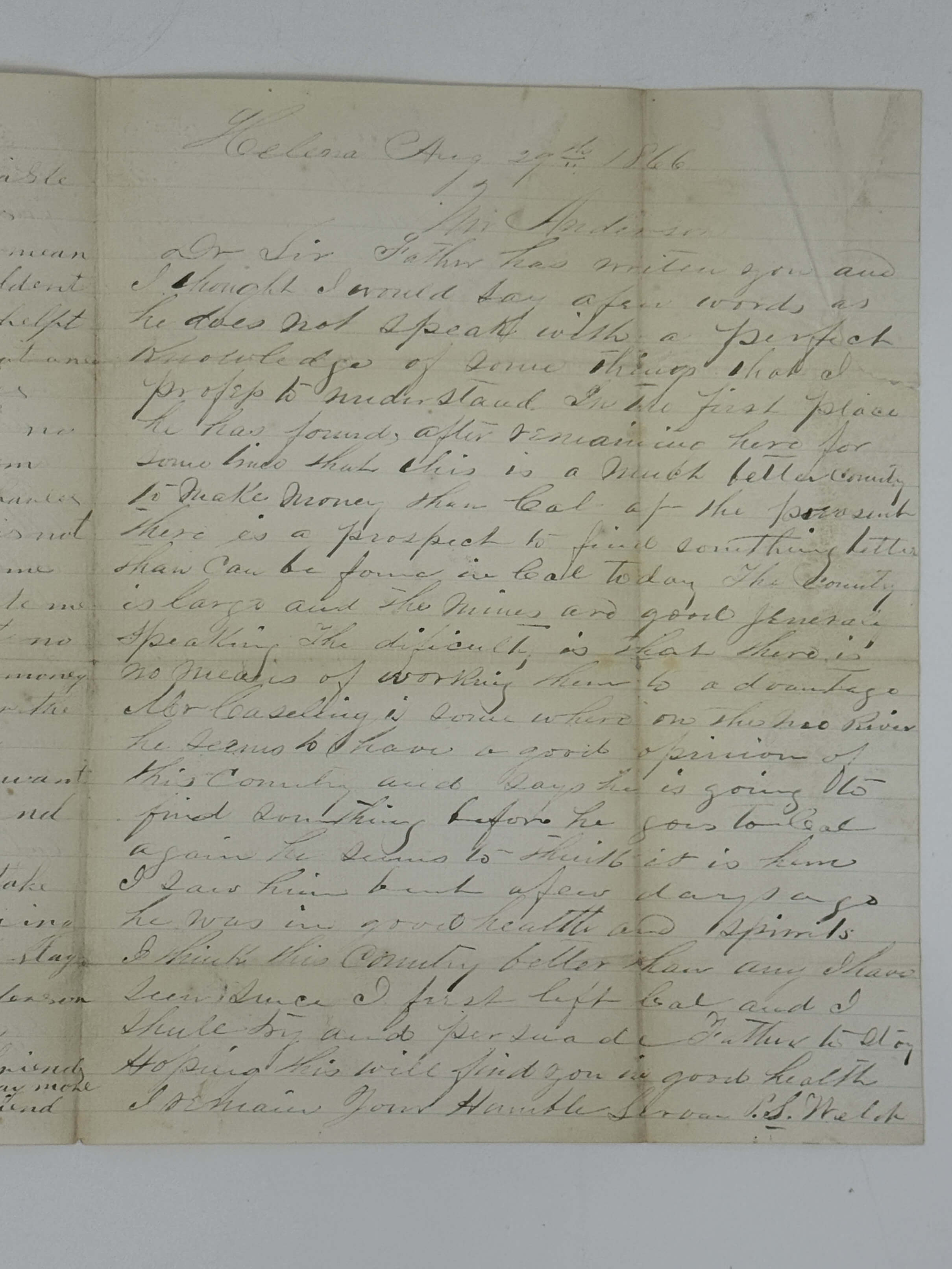 The letters were written by father and son, Philip H. Welch, who had previously lived in California before relocating to Helena, Montana Territory, in the mid-1860s. In correspondence with “Friend Anderson,” the Welches describe their work on mining ditches, typical wages, and the high levels of crime. They compare Montana’s mining opportunities to those in California, emphasizing the region’s abundant gold in the deep diggings of nearby Confederate Gulch. Especially interesting is their account of an extraordinary shipment of a ton of gold dust bound for the state and escorted by twenty armed guards. In the rest of the letters, the authors discuss the challenges of frontier mining, including scarce equipment, high prices, lawless camps with numerous road agents and no possibility of insuring money, and the expected rise in wages once water reached the Helena claims.