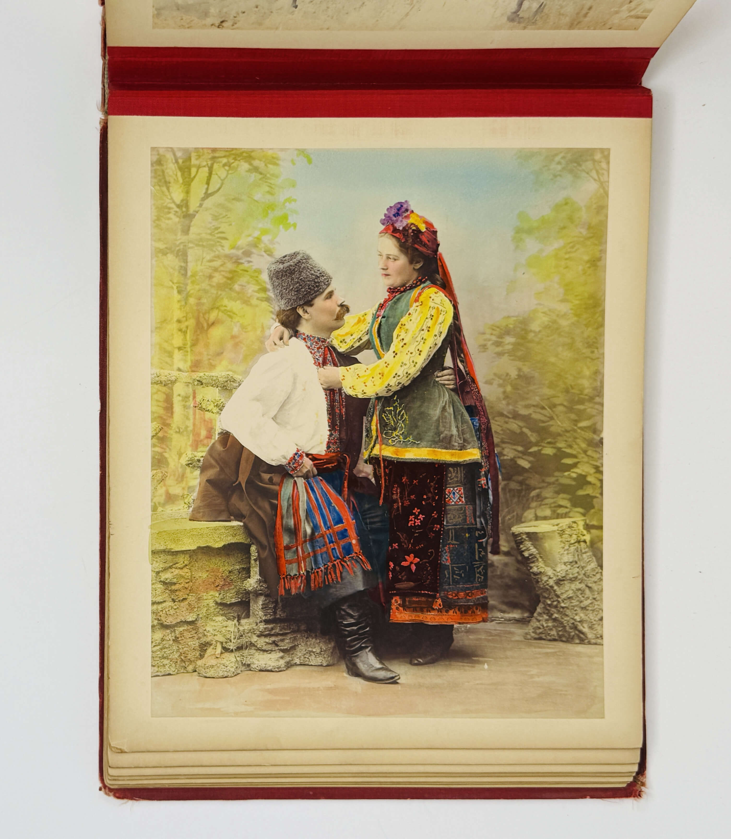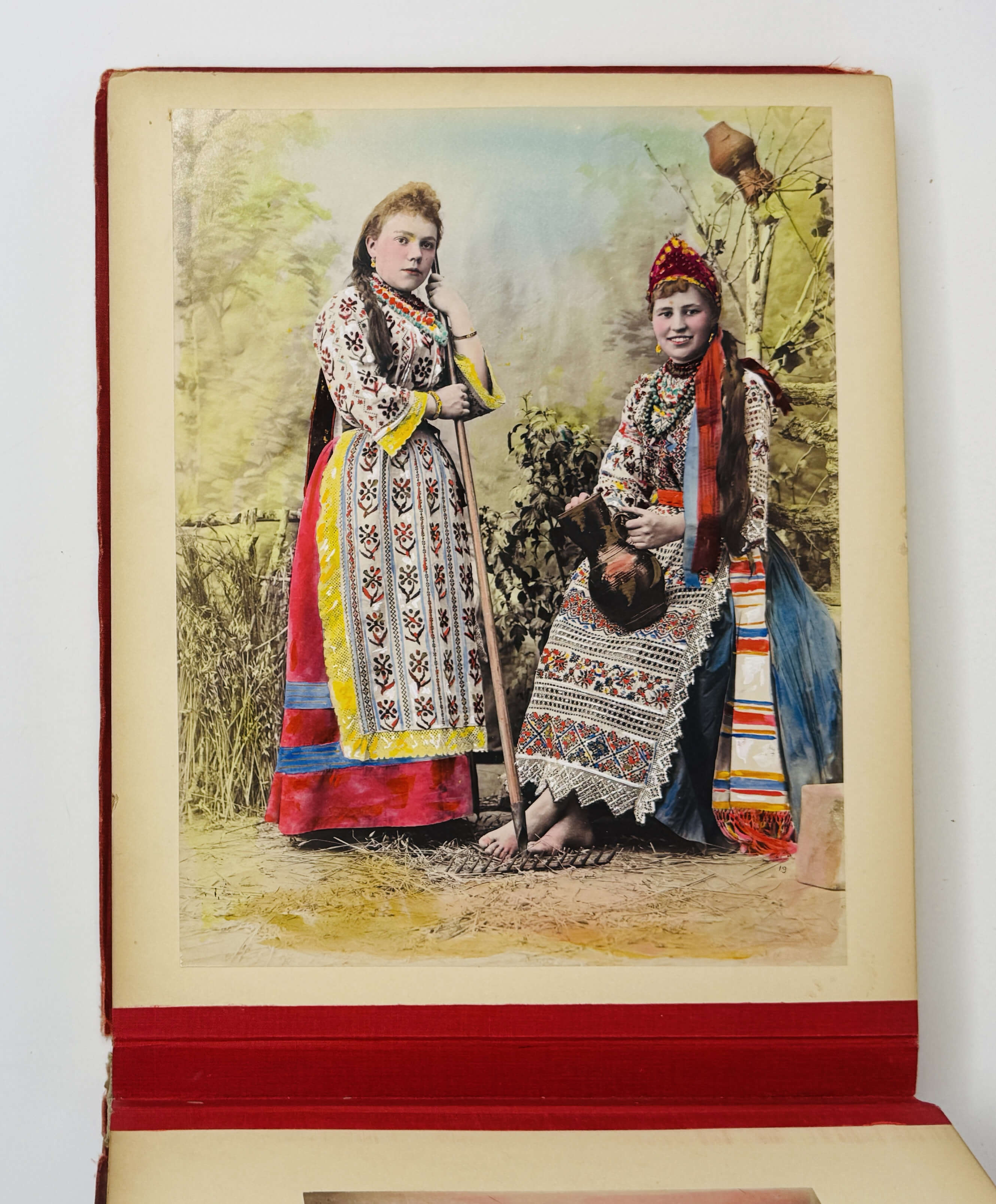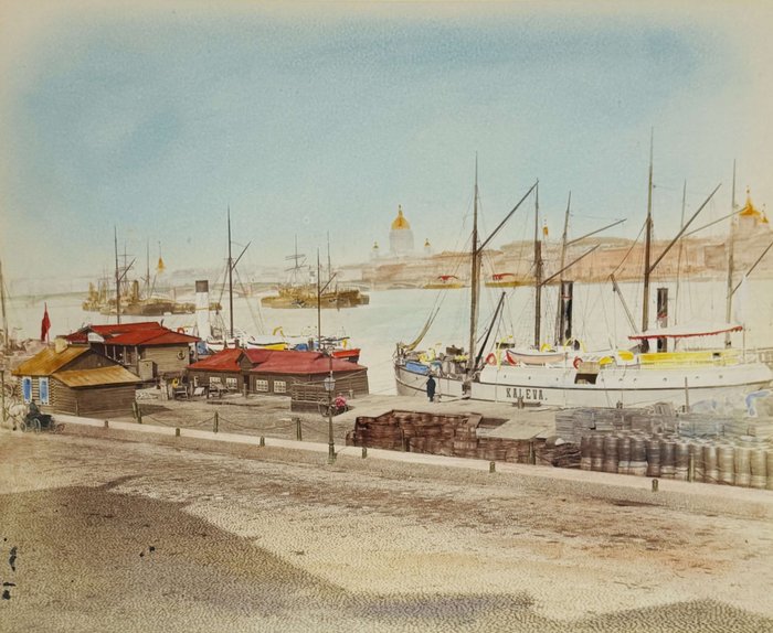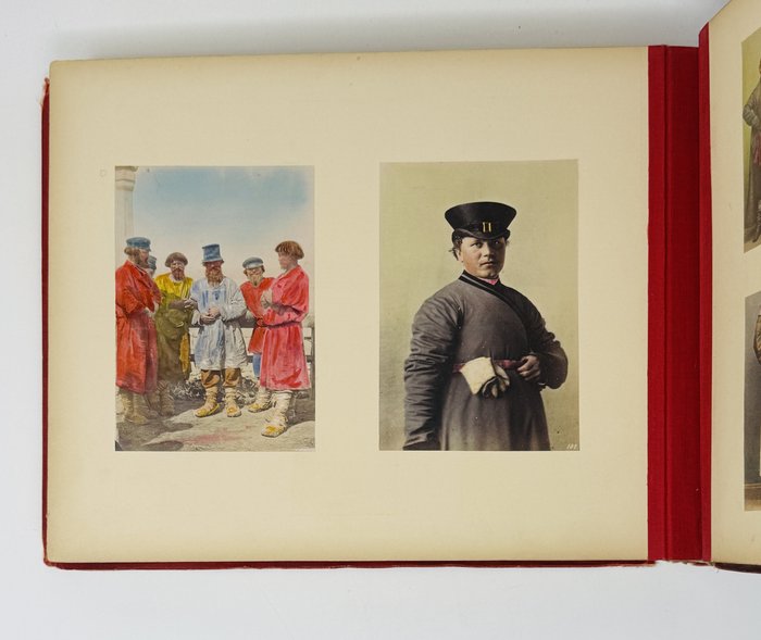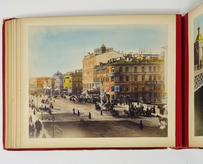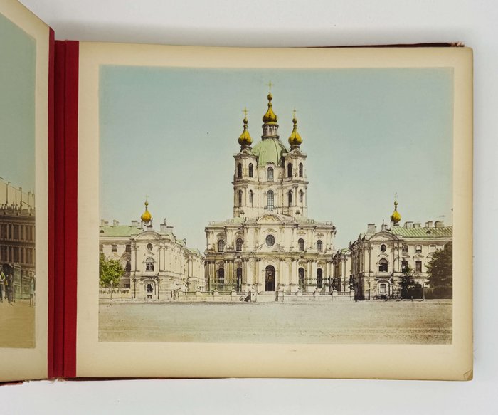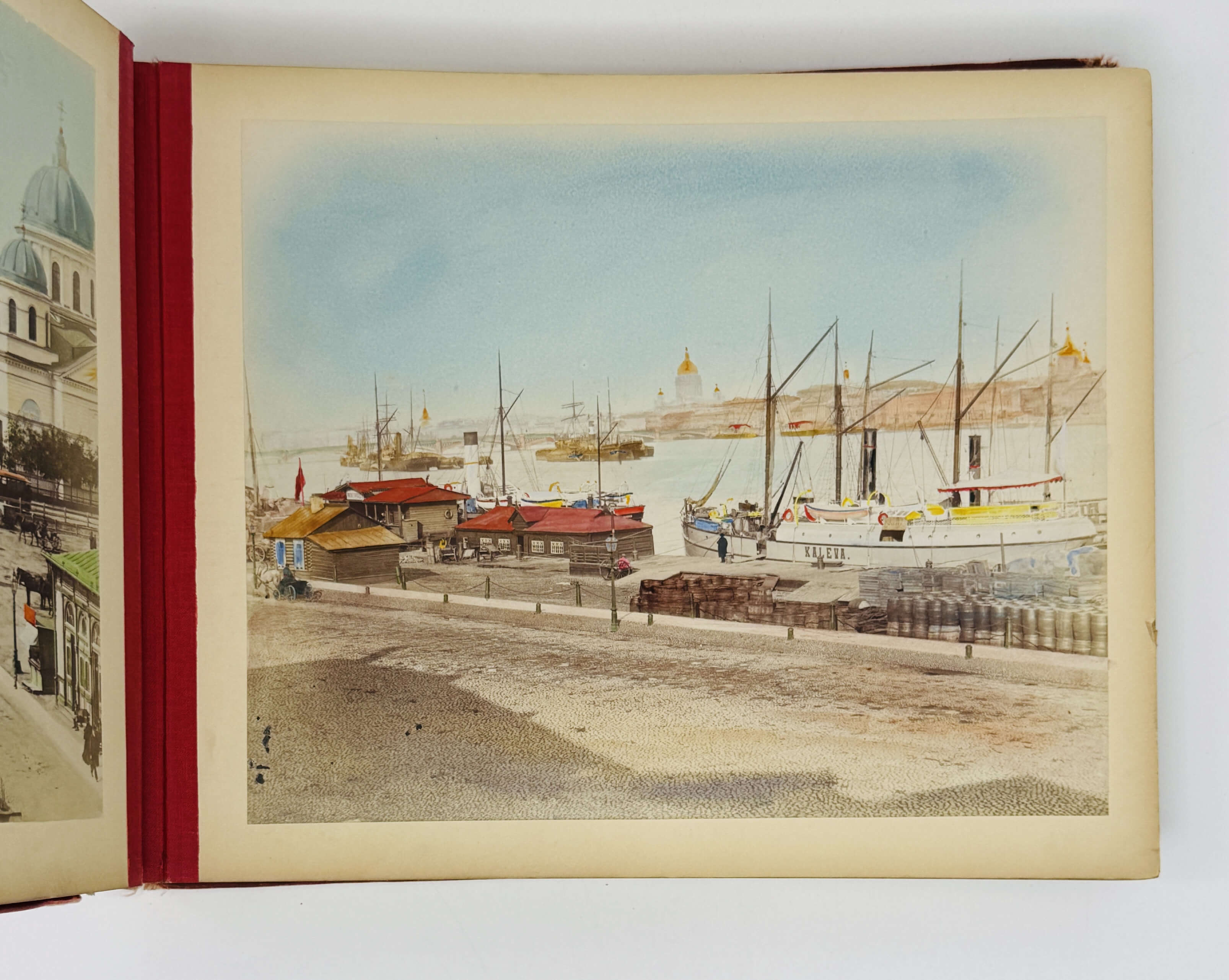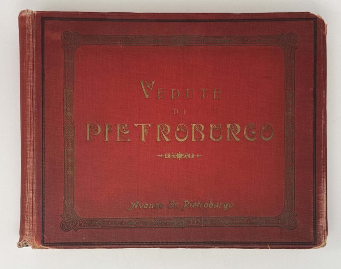 Oblong Folio album (ca. 34x40,5 cm or 13 ¼ x 16 in). 20 card stock leaves. With 61 mounted original gelatin silver and albumen photos, including thirty-three photos ca. 20x26 cm (10 ¼ x 8 in), twelve photos ca. 9,3x13,5 cm (3 ½ x 5 ¼ in), and six smaller photos at the rear ca. 5x9 cm (2 x 3 ½ in). Most of the photos are numbered in negative. Period full cloth album with gilt-tooled ornaments on the front board and the spine, as well as the title “Vedette di Pietroburgo. Acanzo St. Peietroburgo” on the cover; decorative endpapers; all edges gilt. Binding slightly bumped with minor loss of cloth on the corners of the boards, mild foxing on the mounts, but otherwise a very good album of large, well-preserved studio photographs in period coloring.