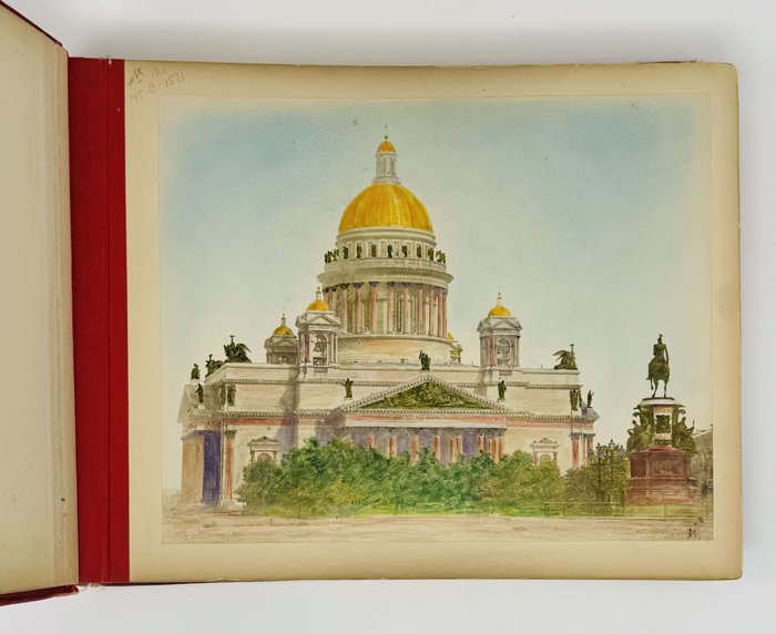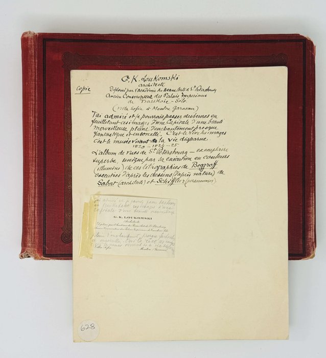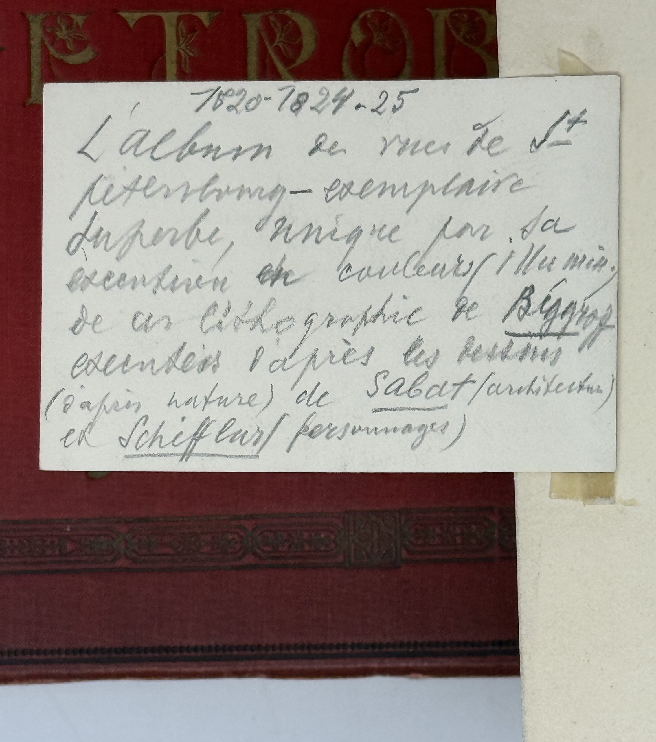Together with a carte de visite by Lukomski from the 1930s, featuring his extensive pencil note in French. In the note, Lukomski praises the album as a "superb example" depicting a "capital now gone" and compares it to the prestigious lithographic editions by famous publishers of the 1820s. He writes: “L’album de vis de st Petersburg exemplaire superbe unique par son exécution en couleurs (illuminées) de ces lithographies de Beggroff exécutées d’après les dessins (d’après nature) de Sabat (architecte) et Schiffer (l’album de vues).”