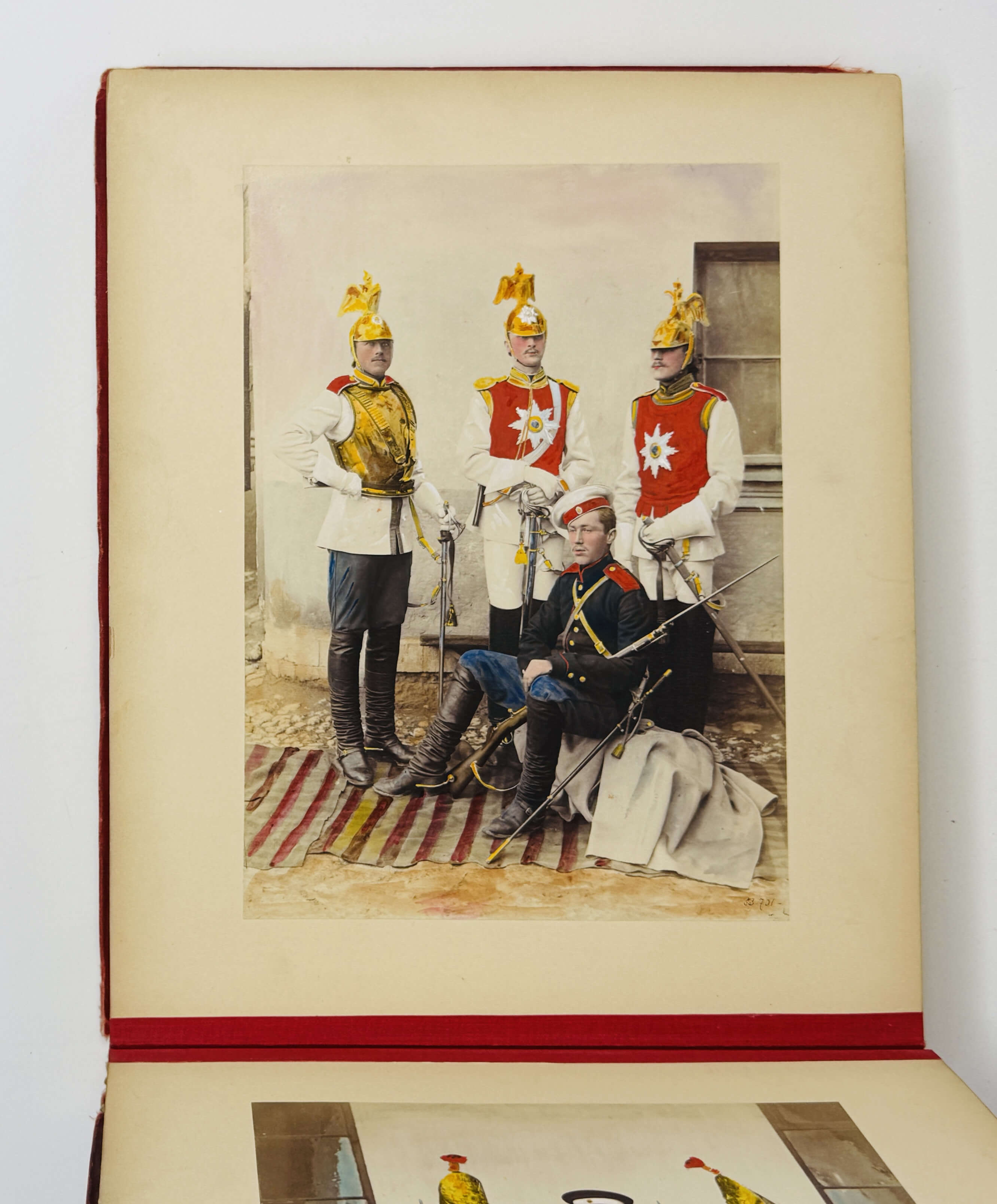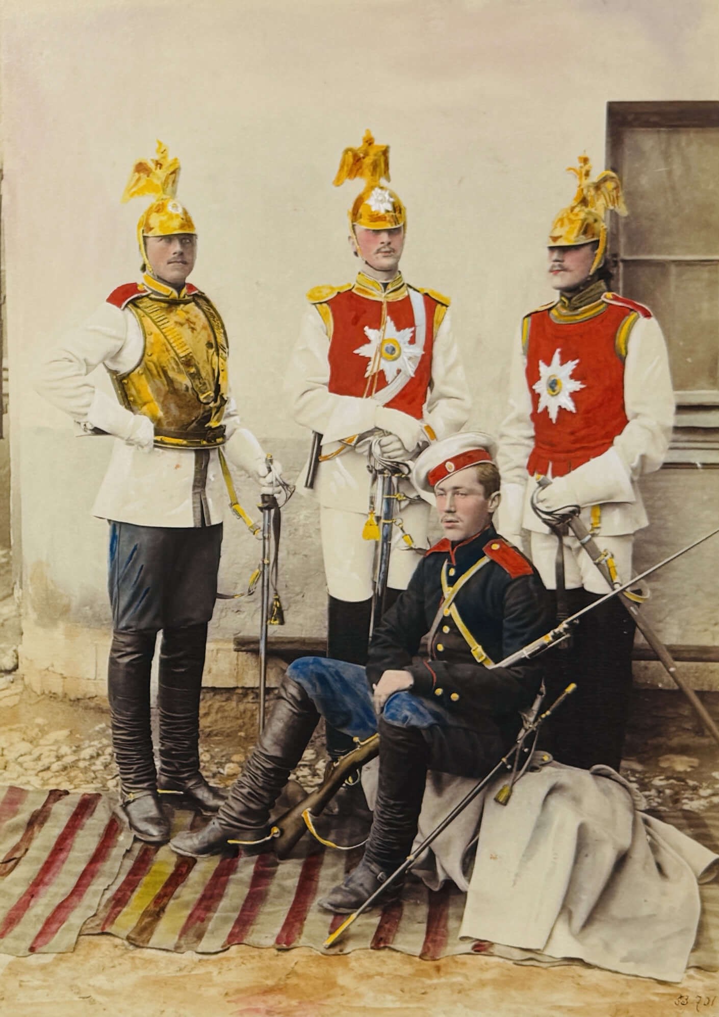 The album concludes with three well-executed military photographs depicting the Chevalier Guards of the Regiment of Empress Maria Feodorovna, a group portrait of the Pavlovskiy Regiment, and a study of Russian gunners positioned around an artillery piece. Importantly, the photograph of the Chevalier Guards features a young Carl Gustaf Mannerheim (seated), the future founder of independent Finland.