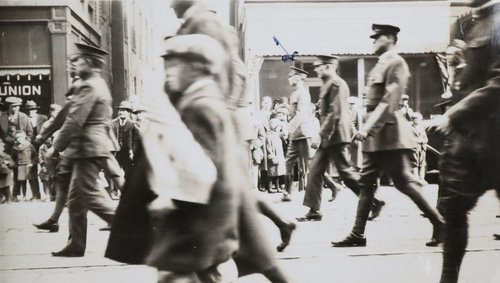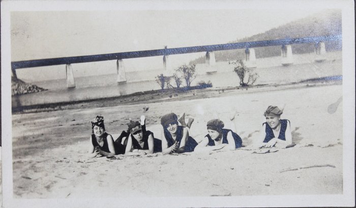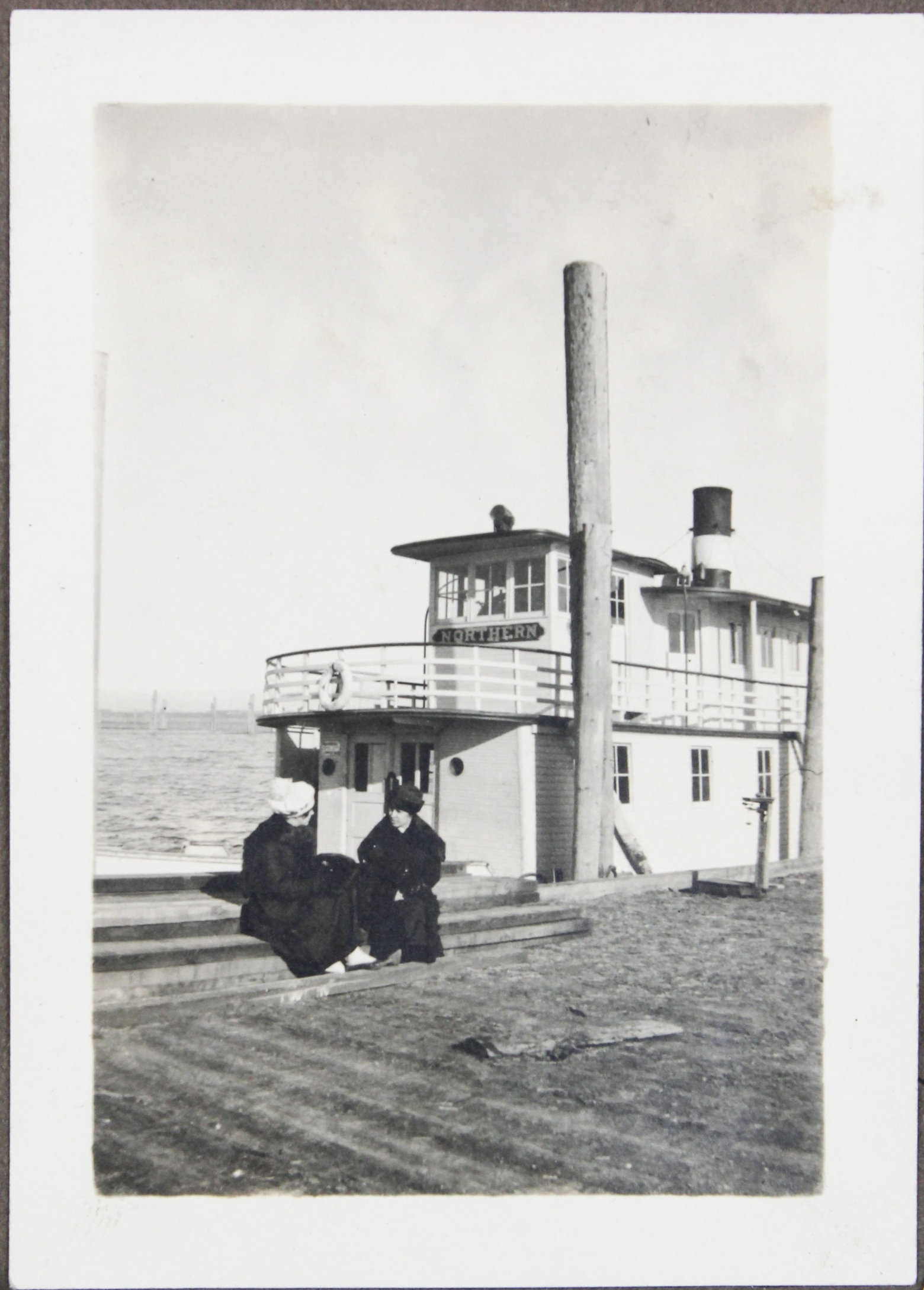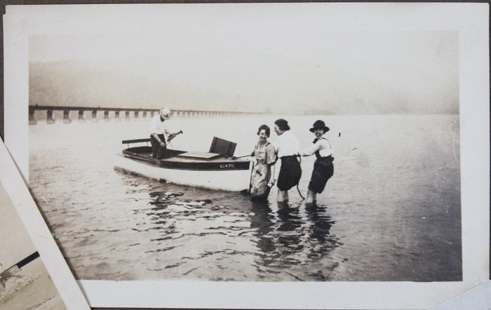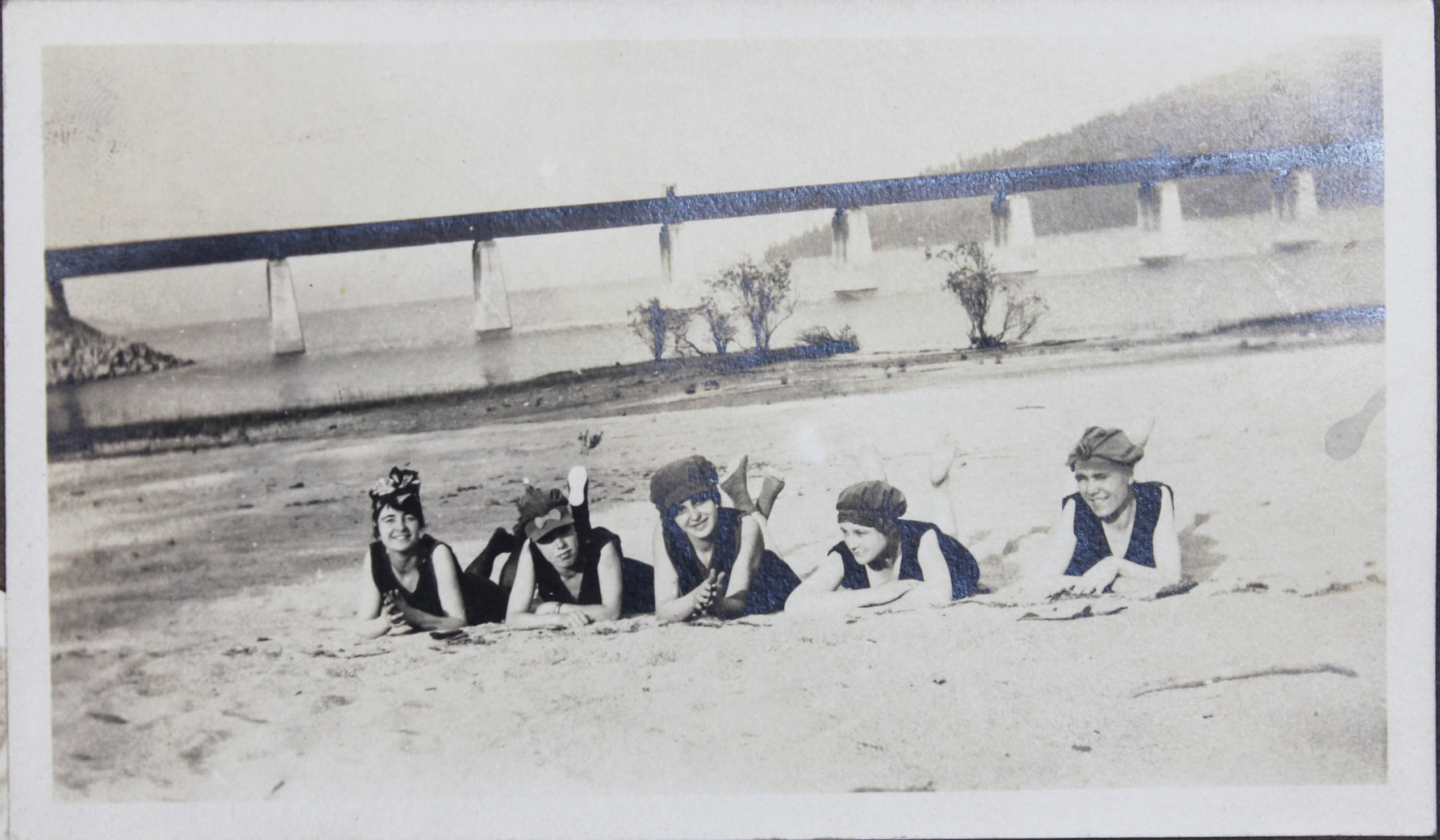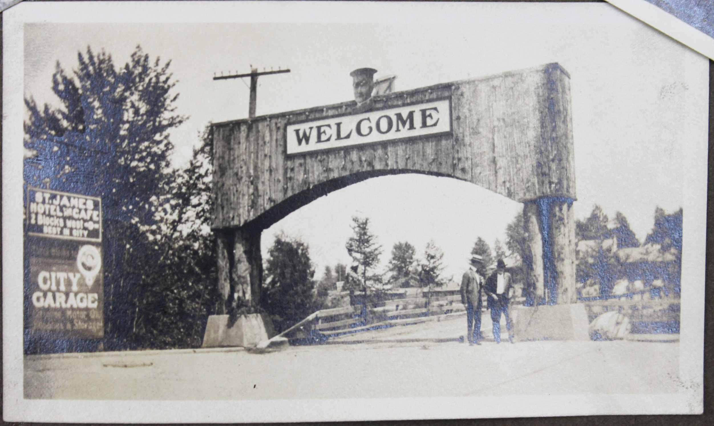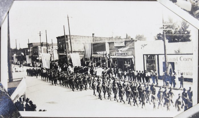 Over ninety candid urban scenes, mostly taken in the 1910s, show the compiler and her family members tanning at Newman Lake, swimming, playing checkers, posing by cars, and standing on the Sandpoint Railroad Bridge. There is also a lively photograph of a patriotic parade of soldiers marching with American flags down the center of a street in Sandpoint, Idaho, with spectators on the sidewalks and shop signs in the background (“Baths,” “Giant Cords / Firestone,” etc.).