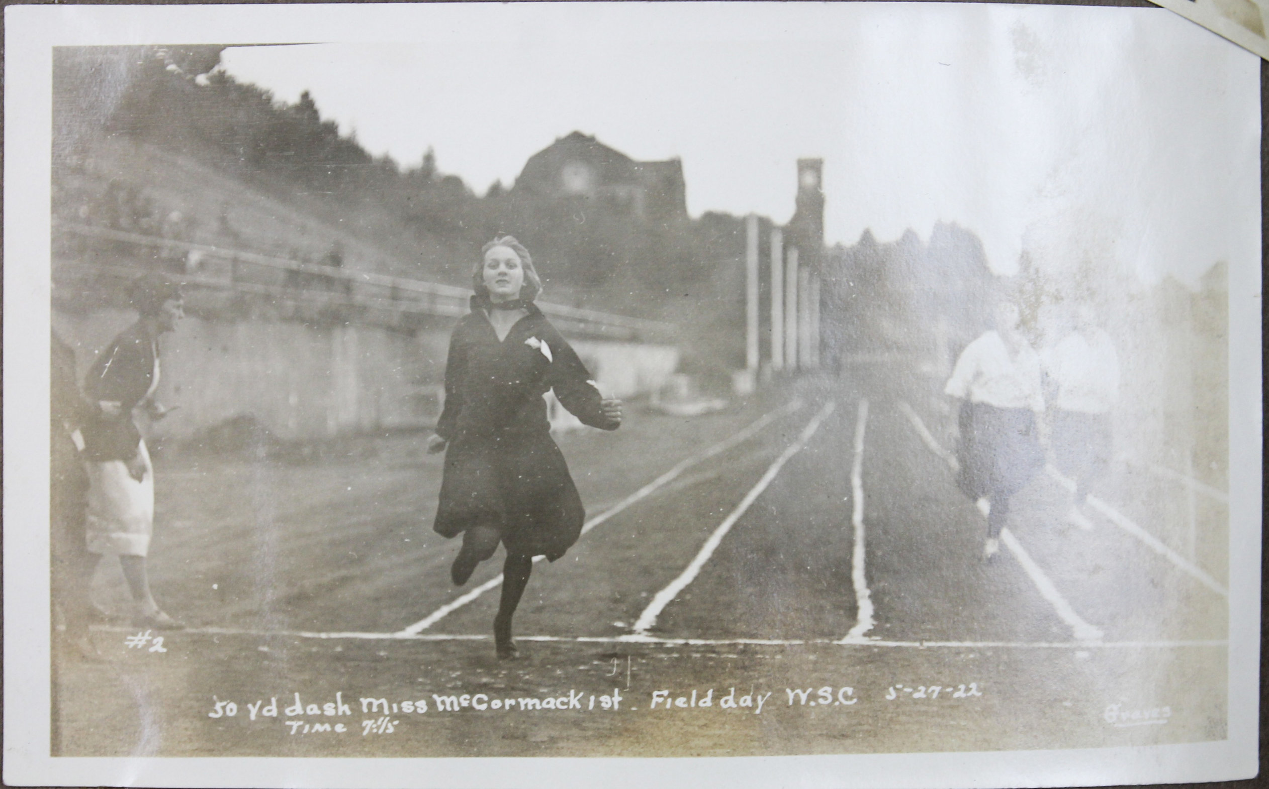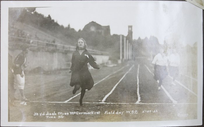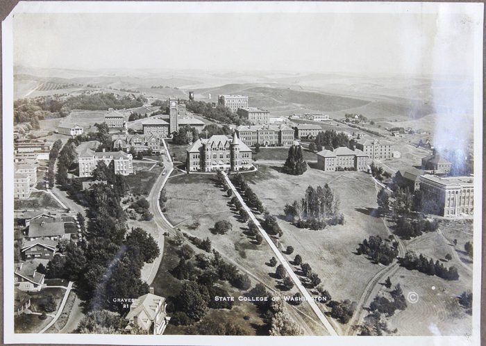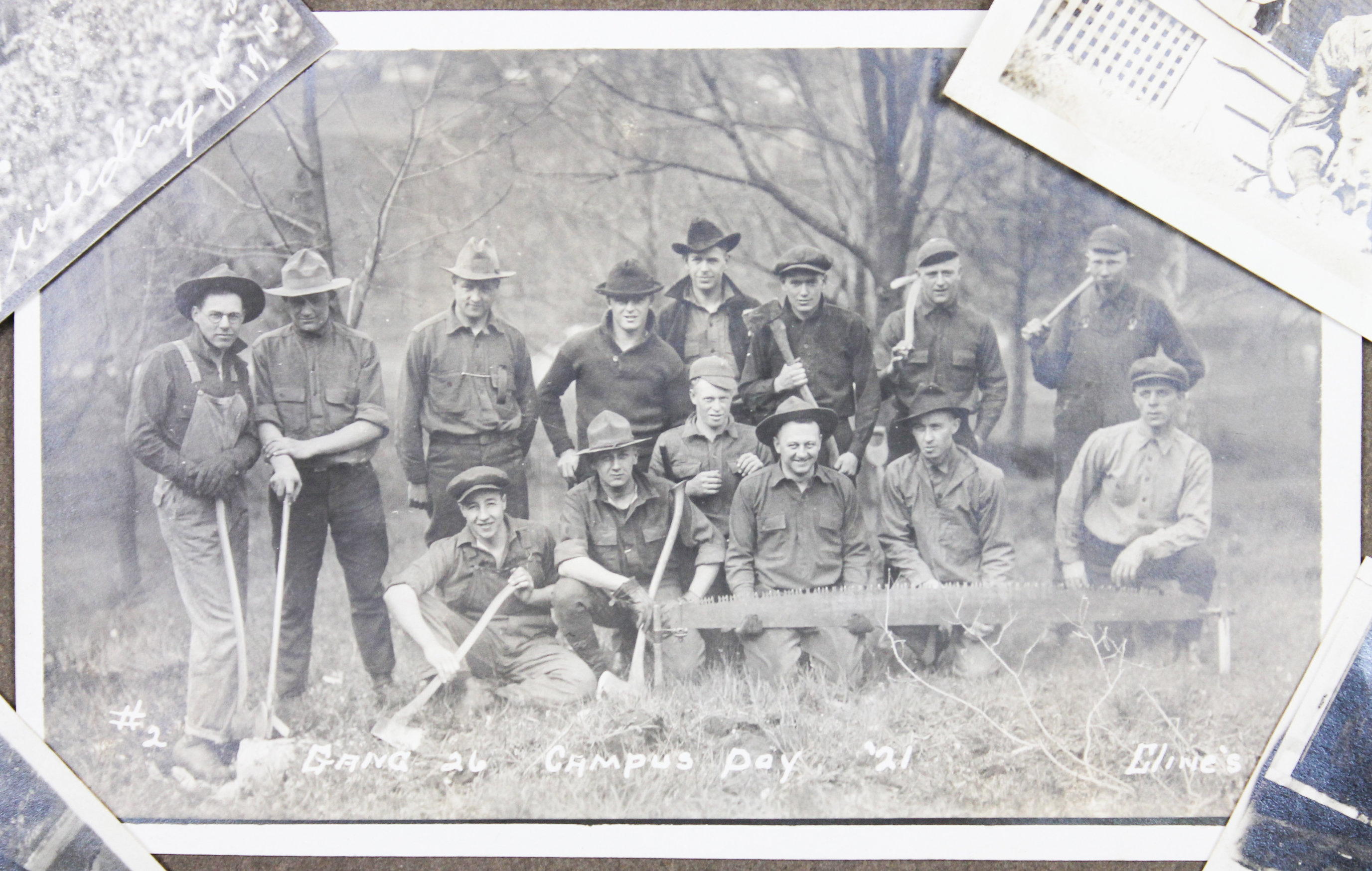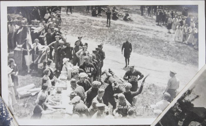 The album contains about 200 lively vernacular photos, mostly taken at the grounds of the State College of Washington in 1921-1922. The photos portray the compiler and her friends (including Ardis Putnam, Gladis Brody, Dorris Perkins, and Frank Reed, among those identified) posing on the steps of the college library, picnicking, and enjoying leisure time. Especially interesting are about ten photographs of Campus Day in 1921–1922, showing male and female students with rakes and hoes in a wooded area, standing in a bread line, crossing the finish line on a track, and serving food from trays. There is also an excellent large-size photograph of the Washington State College campus and three real photo postcards of the President’s Mansion, newly built McCroskey Hall, and the now-destroyed Ferry Hall.