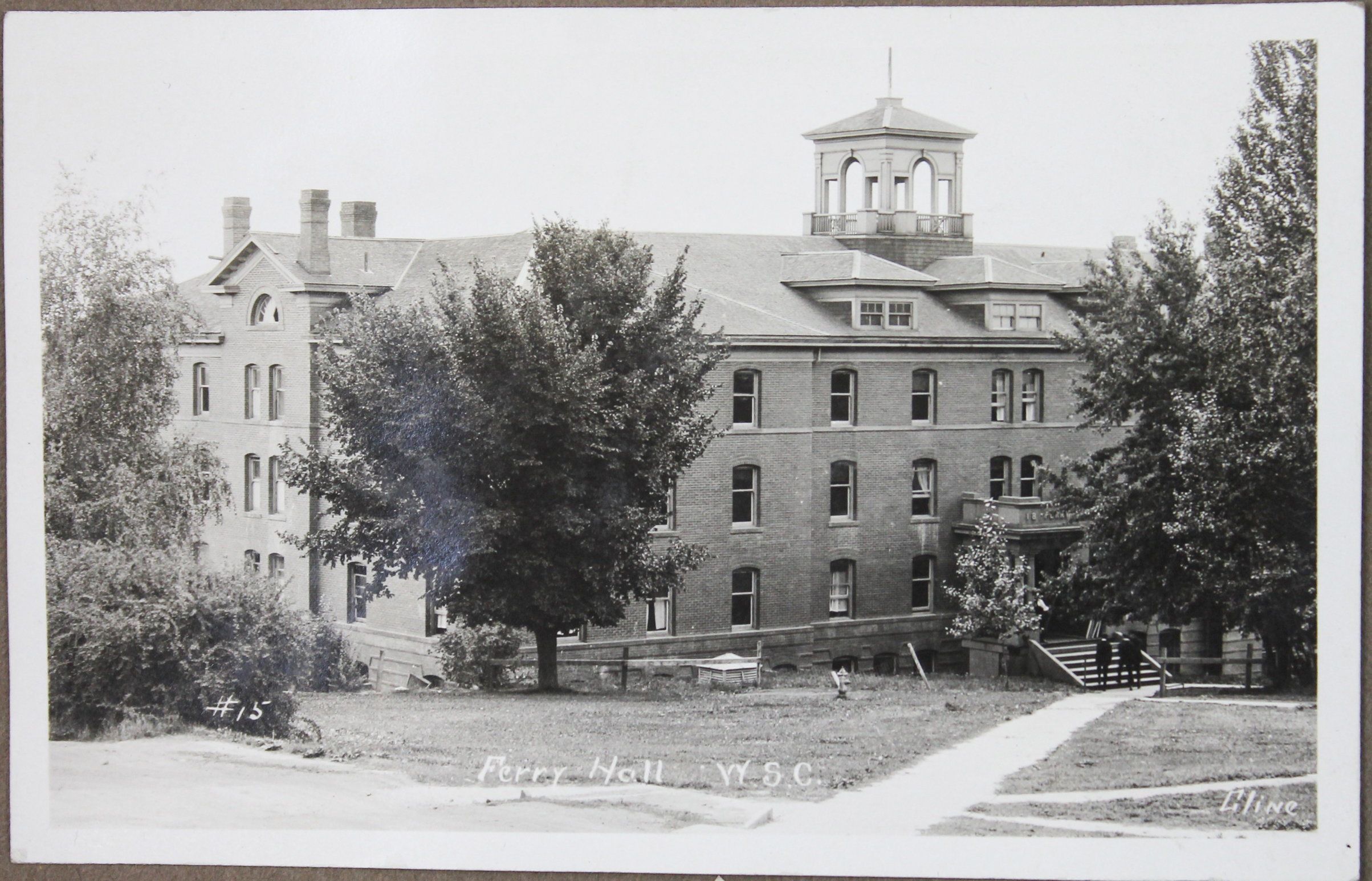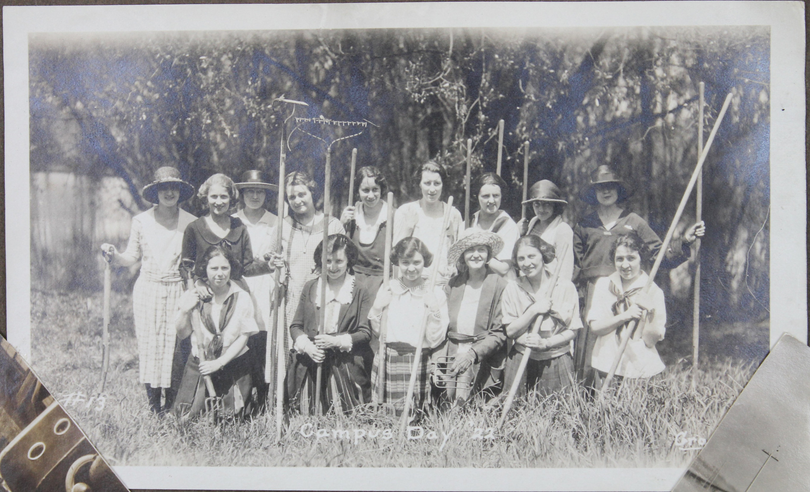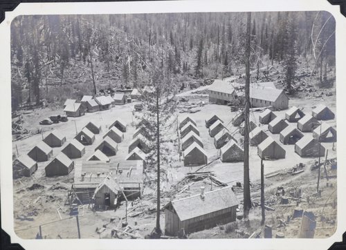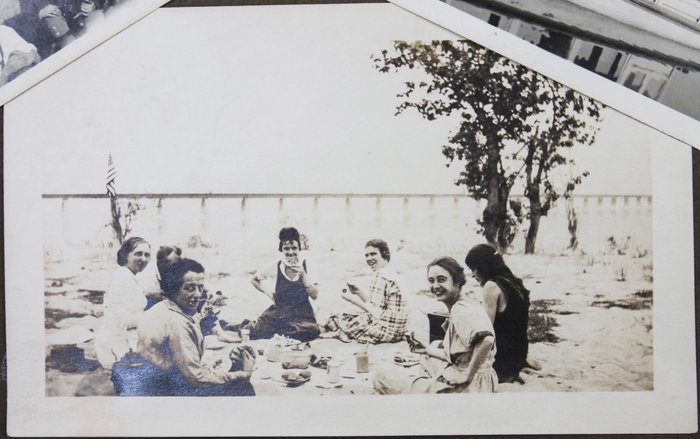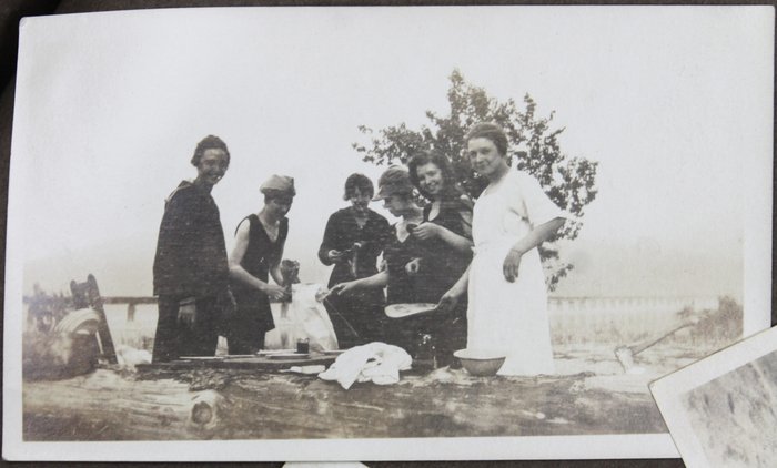 The album contains about 200 lively vernacular photos, mostly taken at the grounds of the State College of Washington in 1921-1922. The photos portray the compiler and her friends (including Ardis Putnam, Gladis Brody, Dorris Perkins, and Frank Reed, among those identified) posing on the steps of the college library, picnicking, and enjoying leisure time. Especially interesting are about ten photographs of Campus Day in 1921–1922, showing male and female students with rakes and hoes in a wooded area, standing in a bread line, crossing the finish line on a track, and serving food from trays. There is also an excellent large-size photograph of the Washington State College campus and three real photo postcards of the President’s Mansion, newly built McCroskey Hall, and the now-destroyed Ferry Hall.