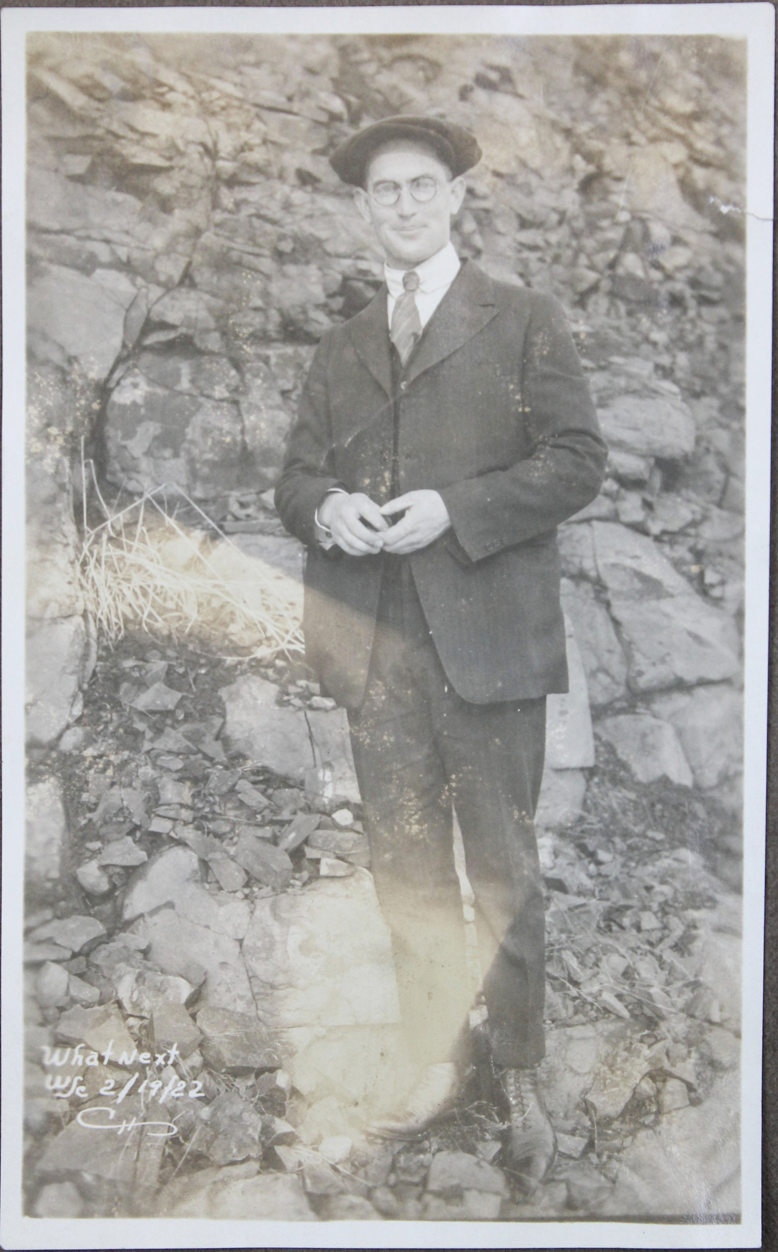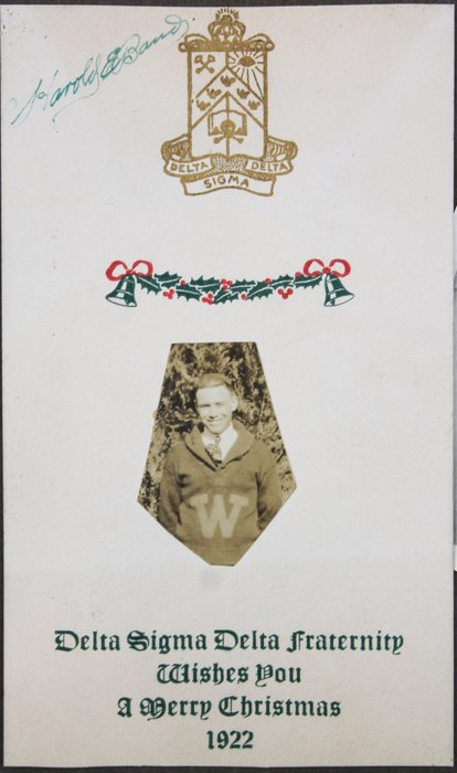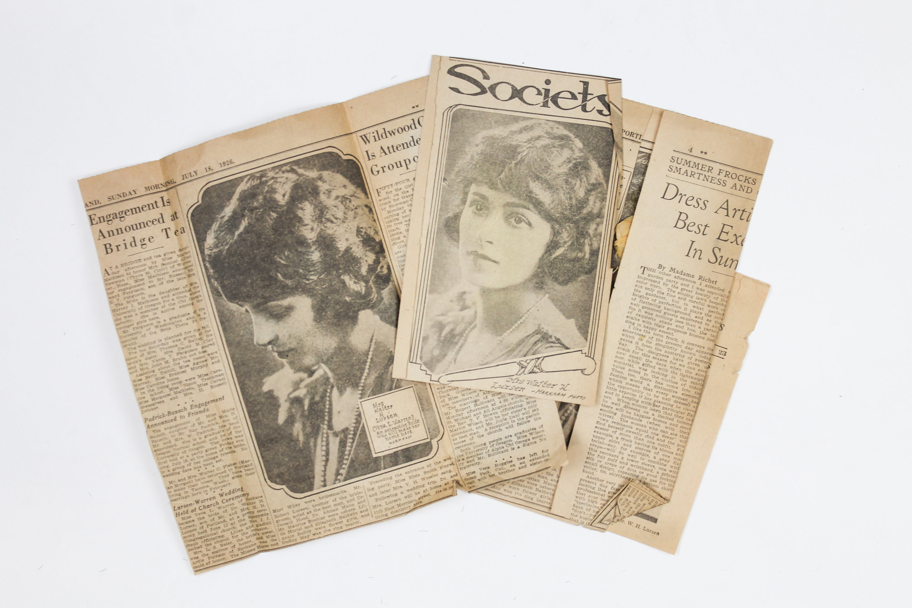 The collection is supplemented by three period newspaper clippings, including an article from The Oregon Sunday Journal (Portland) about Veva’s wedding to Walter; a small dried bouquet of flowers (possibly from the wedding); a hat-shaped card with a program from the Freshman All-College Dance in 1921; a fraternity Christmas greeting for 1922; and an invitation to the play “The Milky Way” at the Columbia River Yacht Club in 1955.