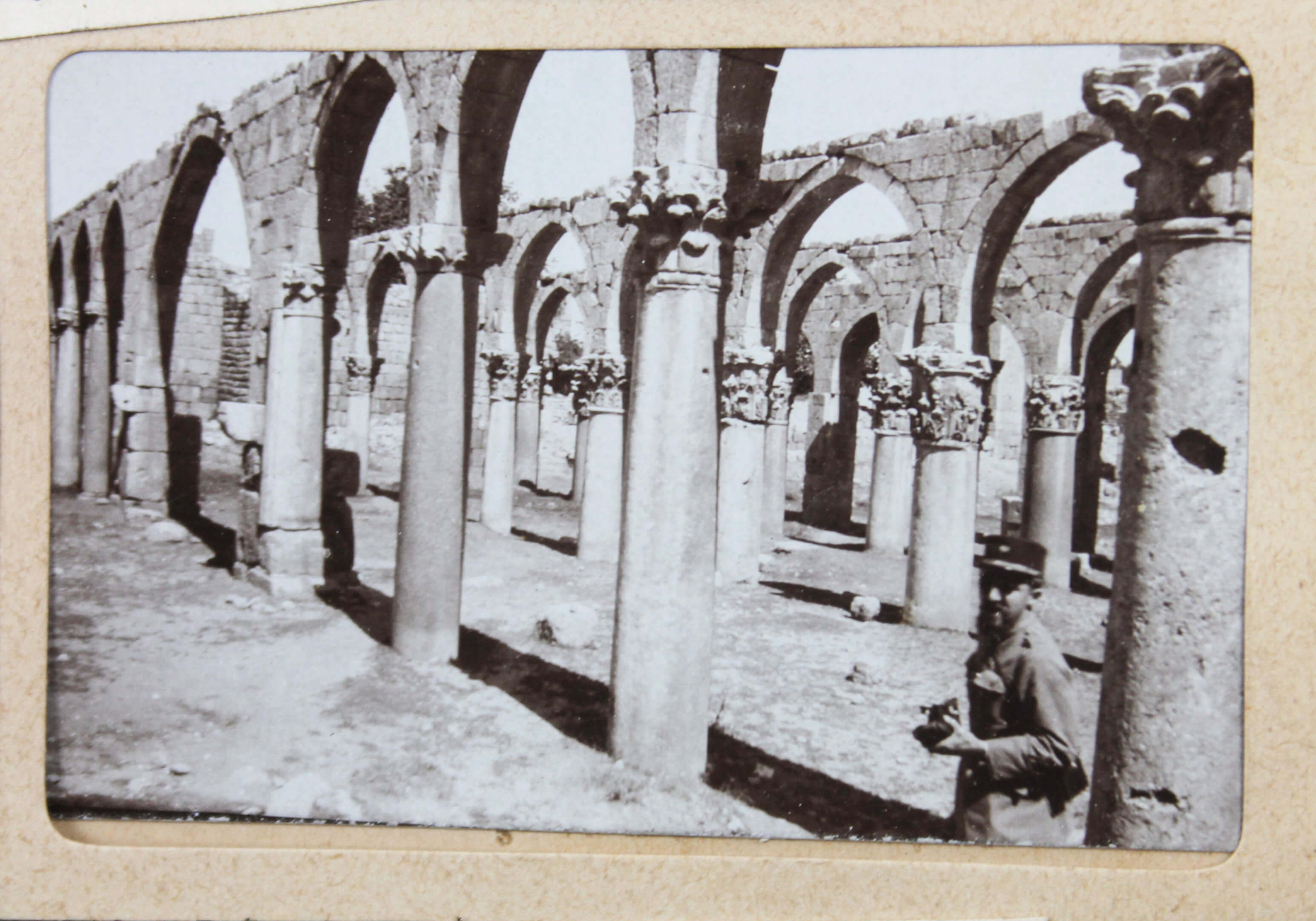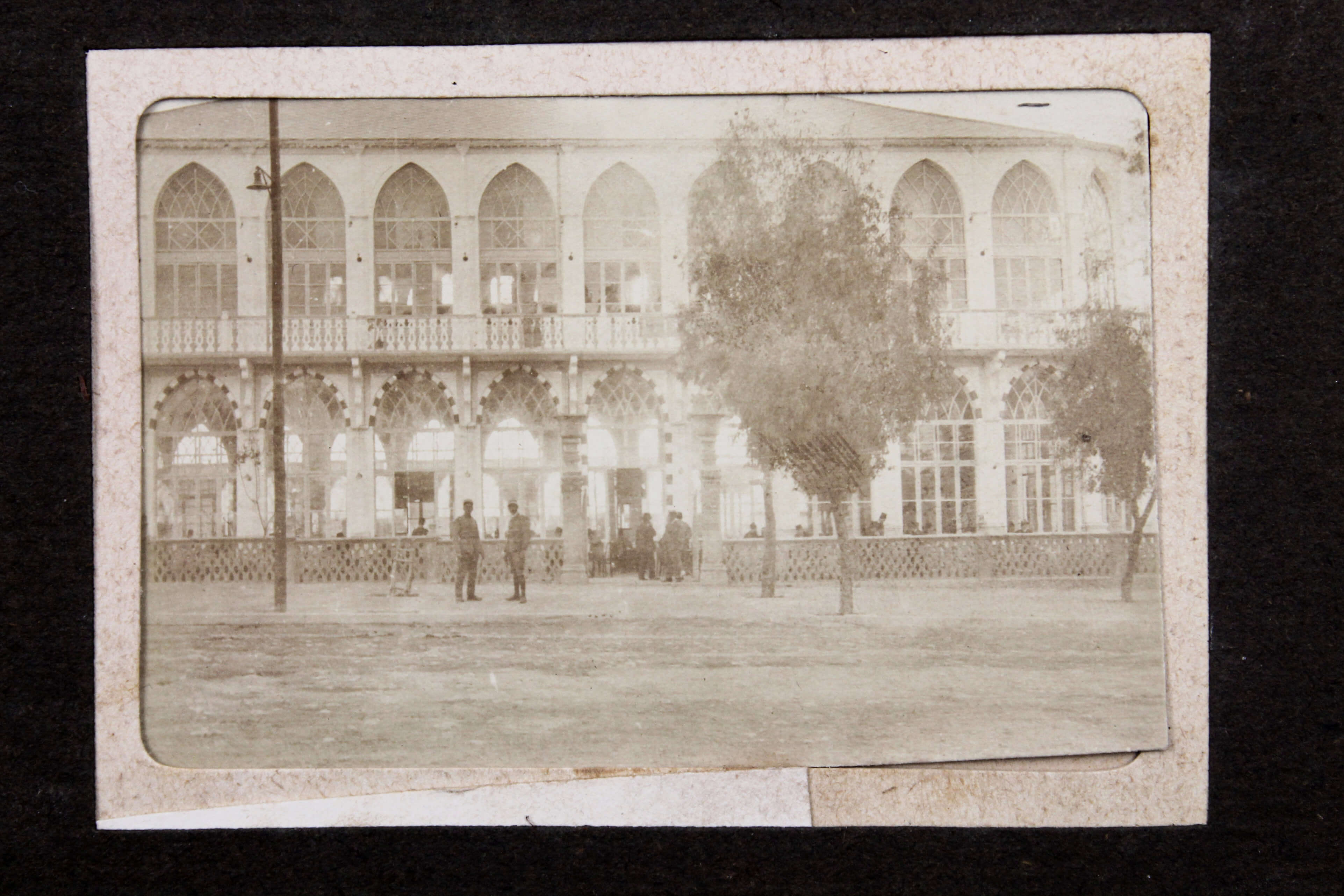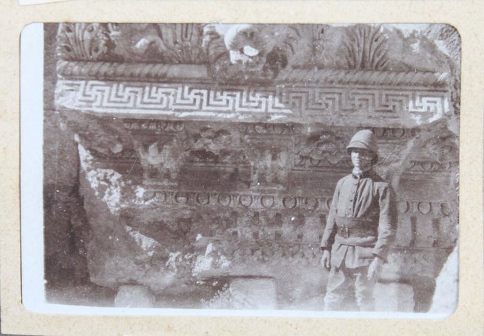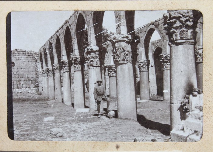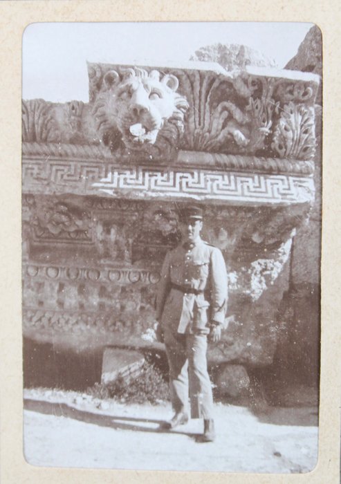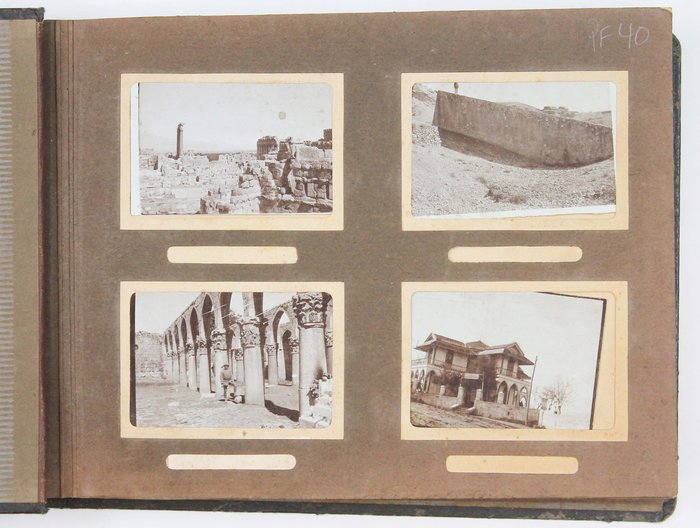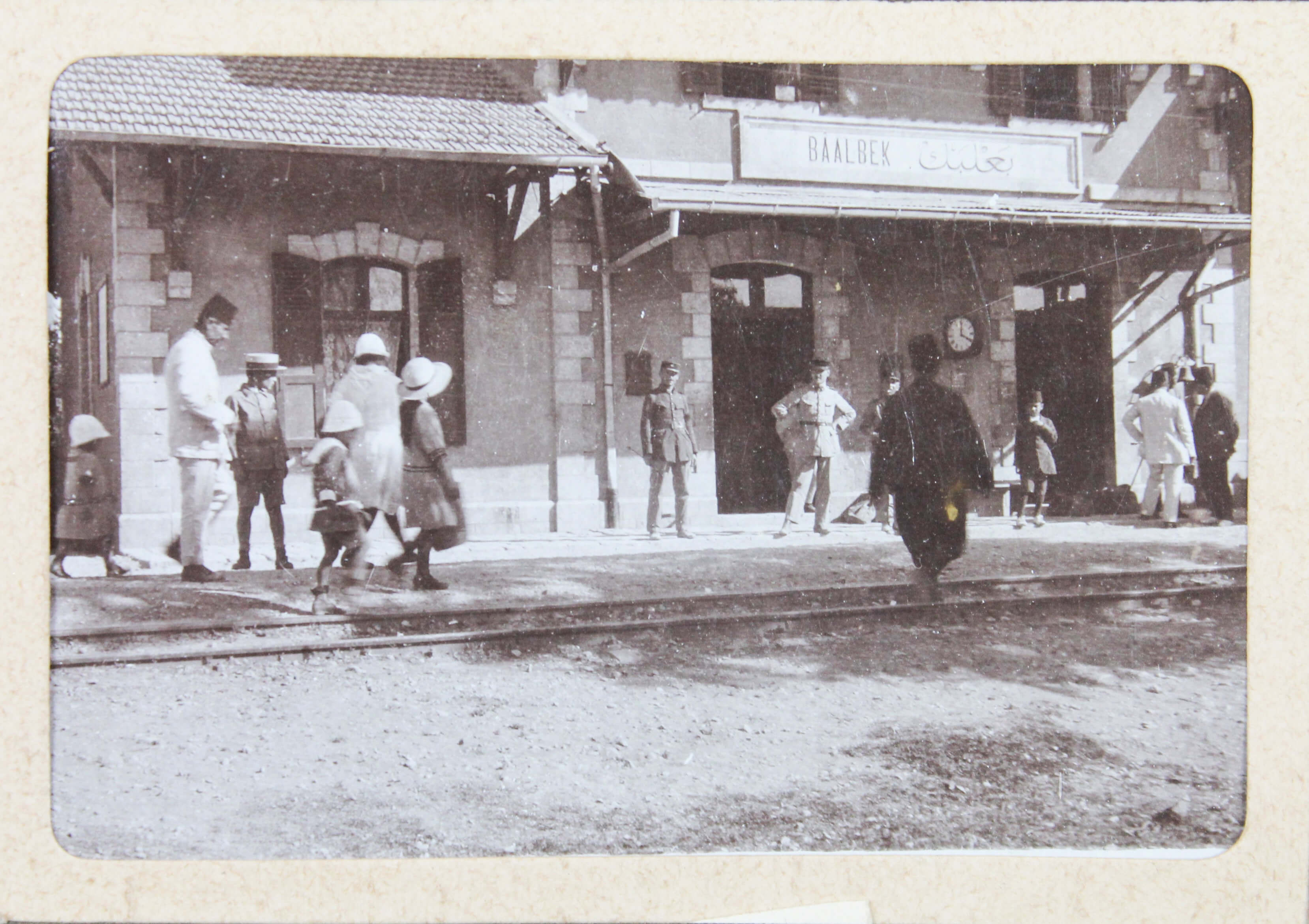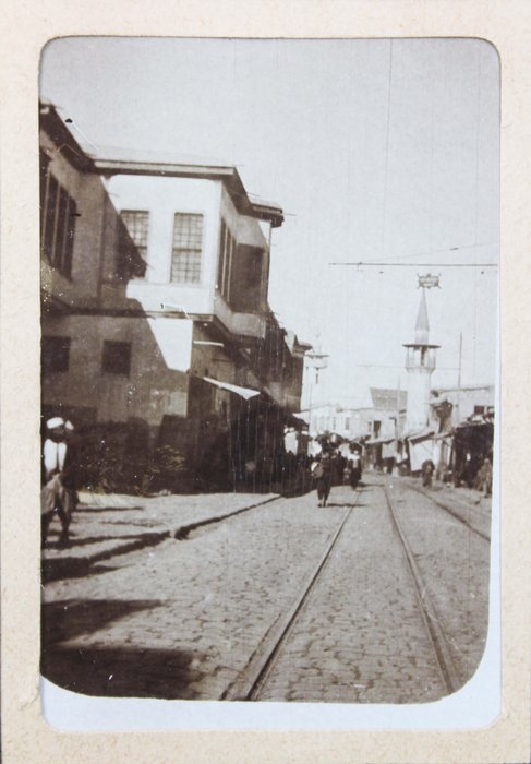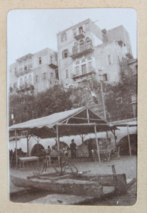 The album features eighty-four rare amateur photographs of the western Arab World, with most images showing early twentieth-century Lebanon. About twenty photos of Baalbek portray local landmarks (Temple of Jupiter, Hajar al-Hibla, Roman Ruins, Roman Temple of Bacchus, etc.), ethnographic views (with a clearly visible Lebanese flag waving atop a local dwelling), and lively shots of the compiler and his military comrades posing at ancient sites. Especially interesting is a candid urban scene showing locals in European costume and traditional attire standing on the platform or walking along the tracks at Baalbek Railway Station, with French police maintaining order. The Lebanon series concludes with a photograph of the iconic Pine Residence in Beirut and well-executed views of the city’s waterfront.