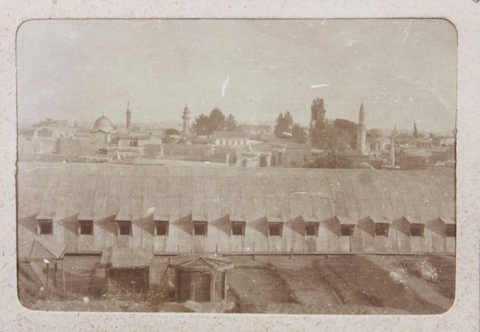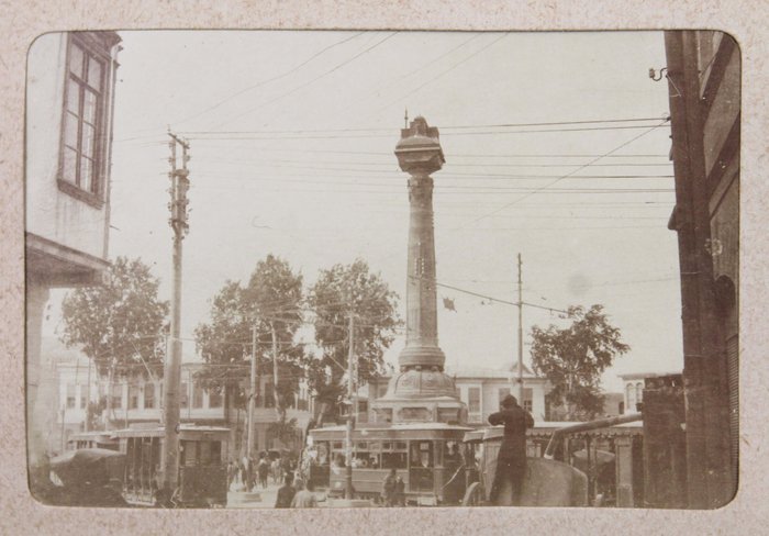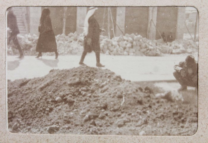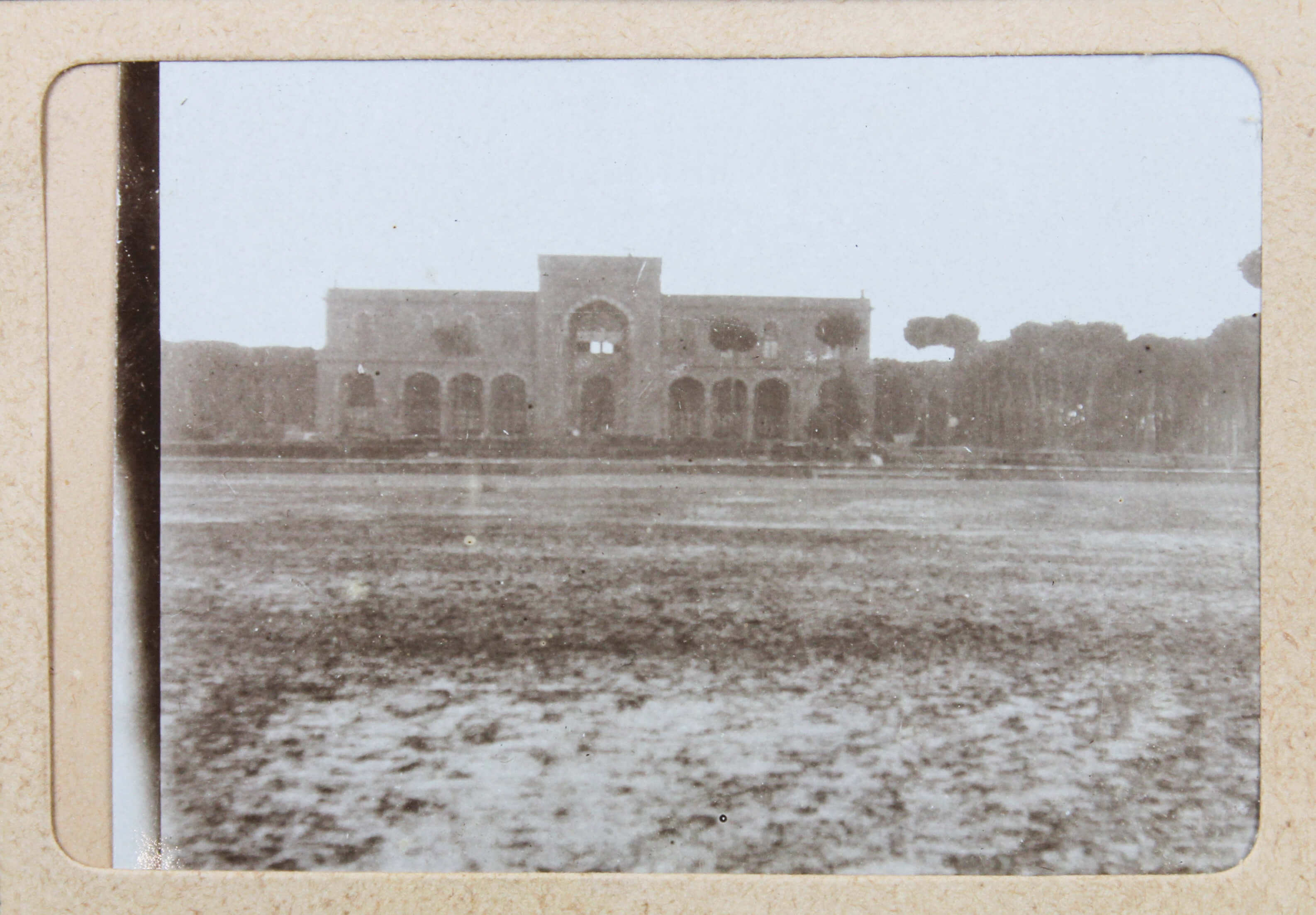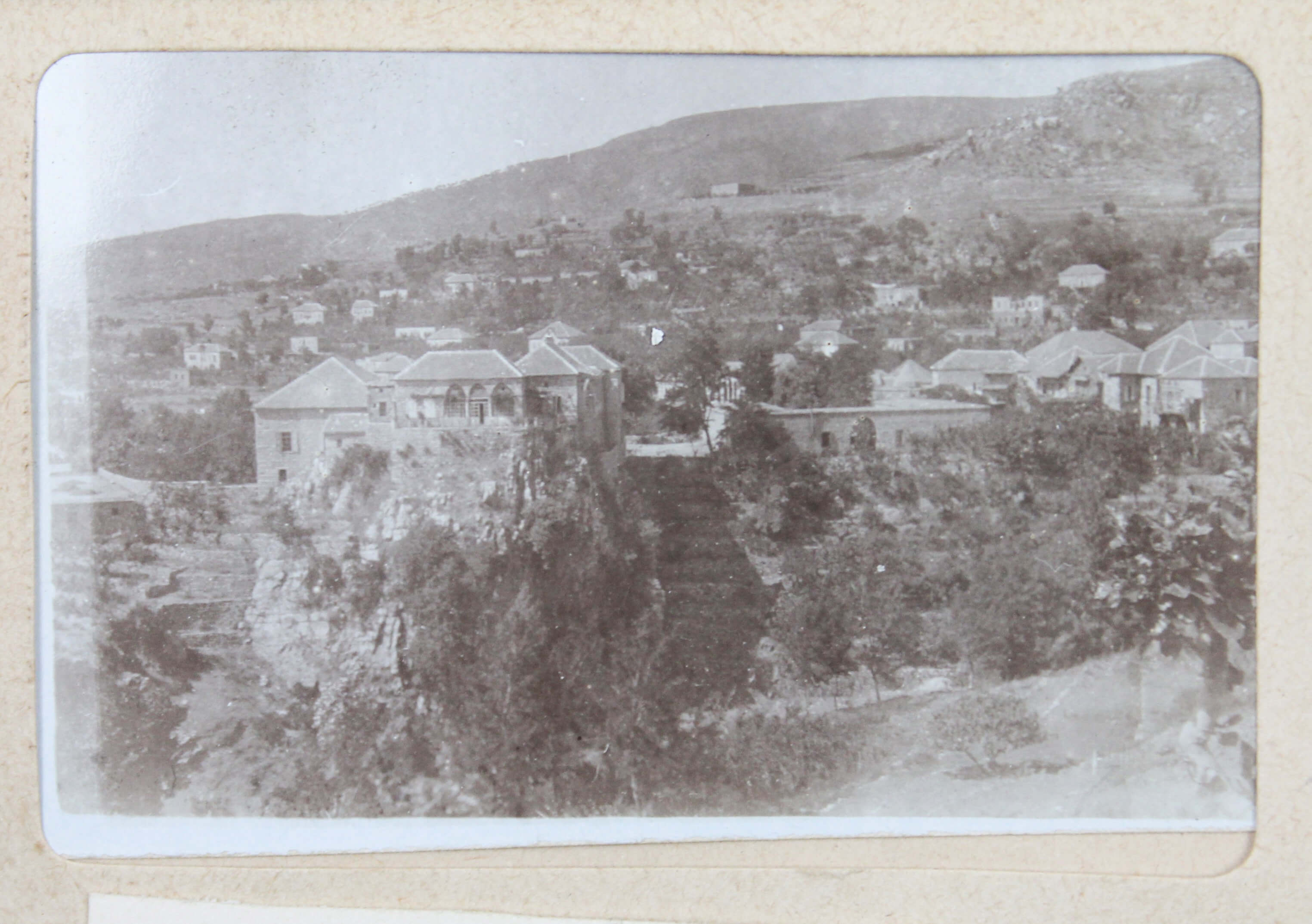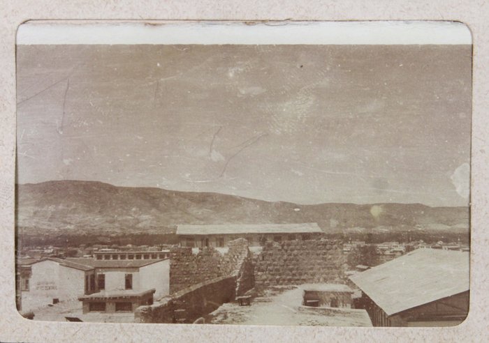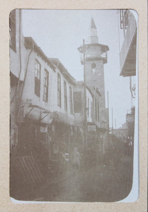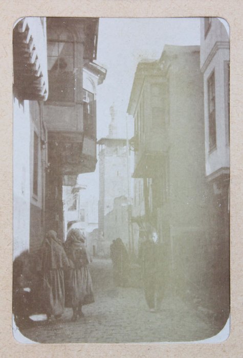 The album features eighty-four rare amateur photographs of the western Arab World, with most images showing early twentieth-century Lebanon. About twenty photos of Baalbek portray local landmarks (Temple of Jupiter, Hajar al-Hibla, Roman Ruins, Roman Temple of Bacchus, etc.), ethnographic views (with a clearly visible Lebanese flag waving atop a local dwelling), and lively shots of the compiler and his military comrades posing at ancient sites. Especially interesting is a candid urban scene showing locals in European costume and traditional attire standing on the platform or walking along the tracks at Baalbek Railway Station, with French police maintaining order. The Lebanon series concludes with a photograph of the iconic Pine Residence in Beirut and well-executed views of the city’s waterfront.