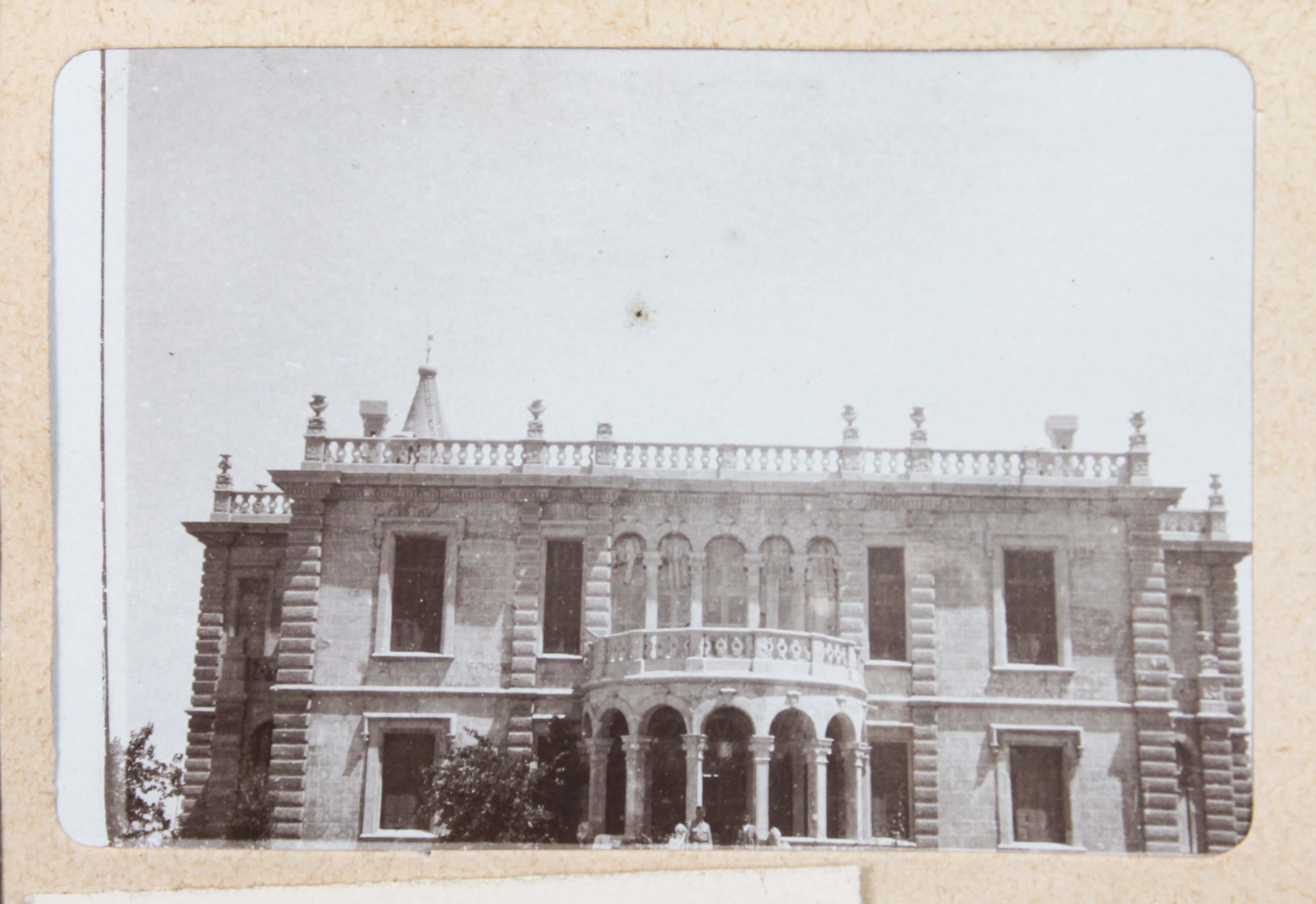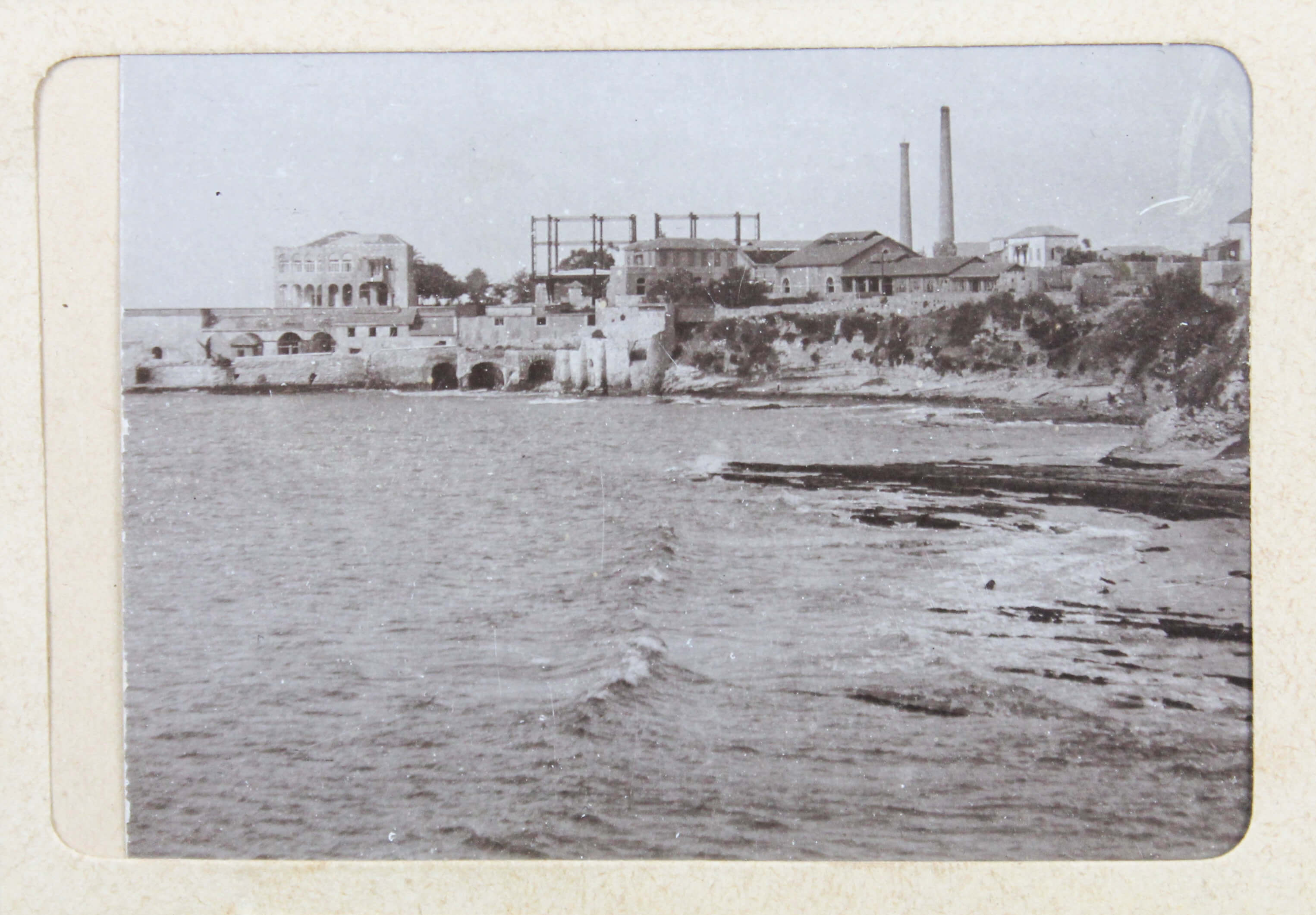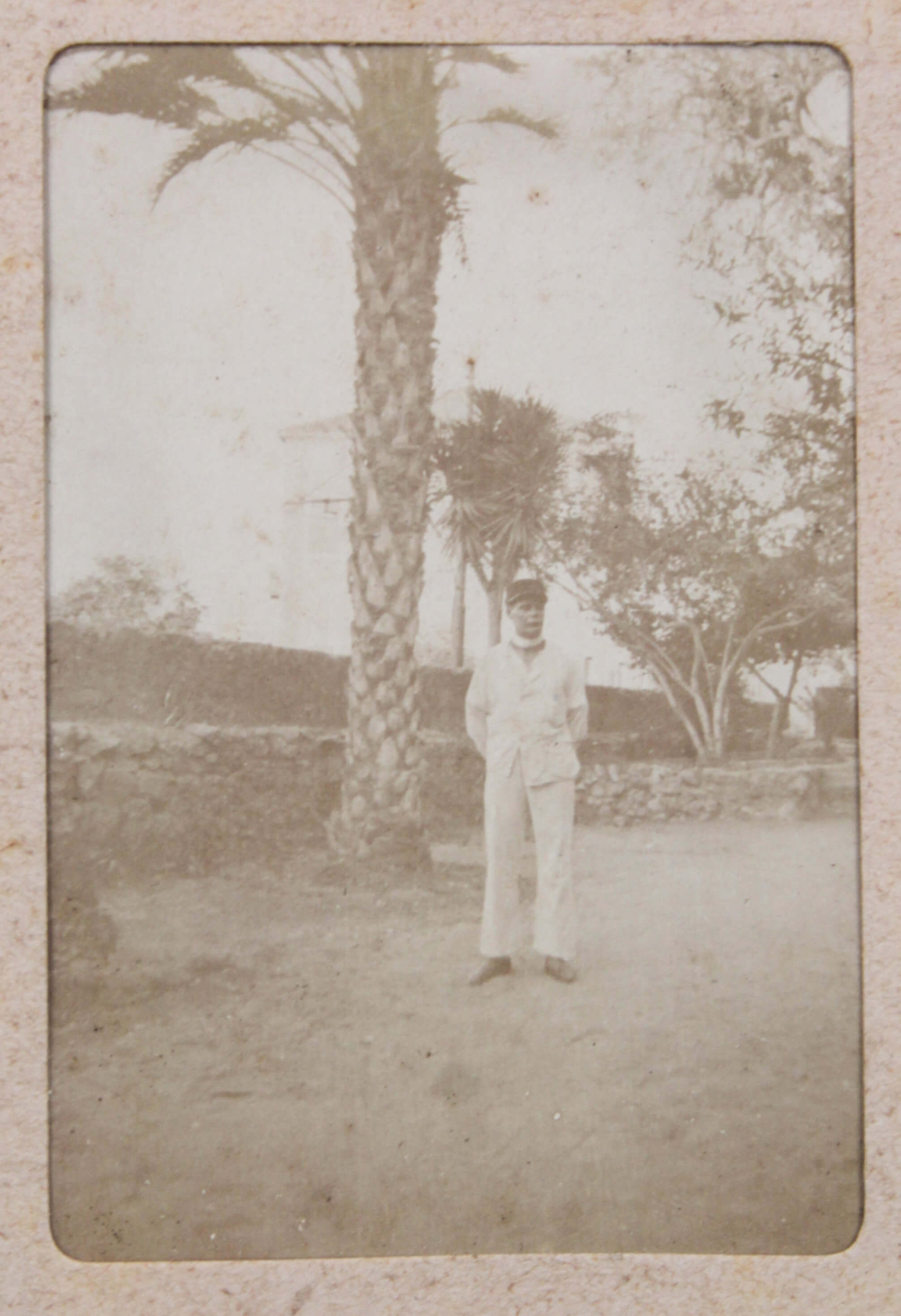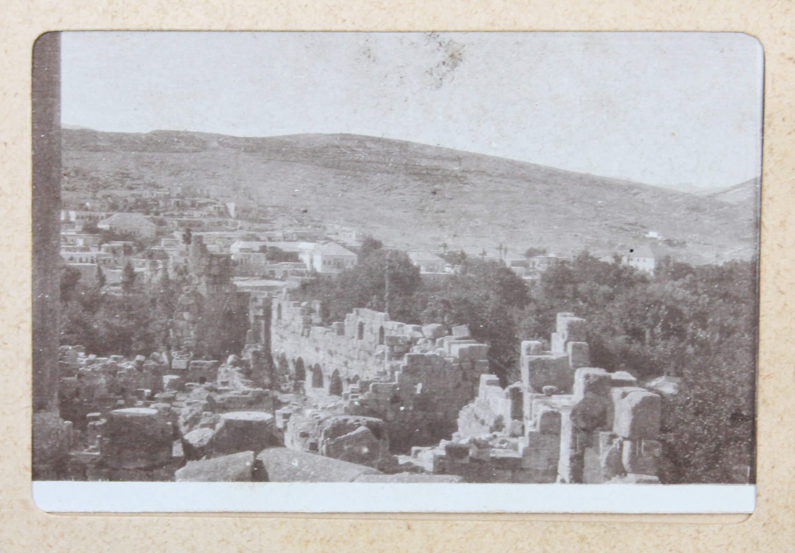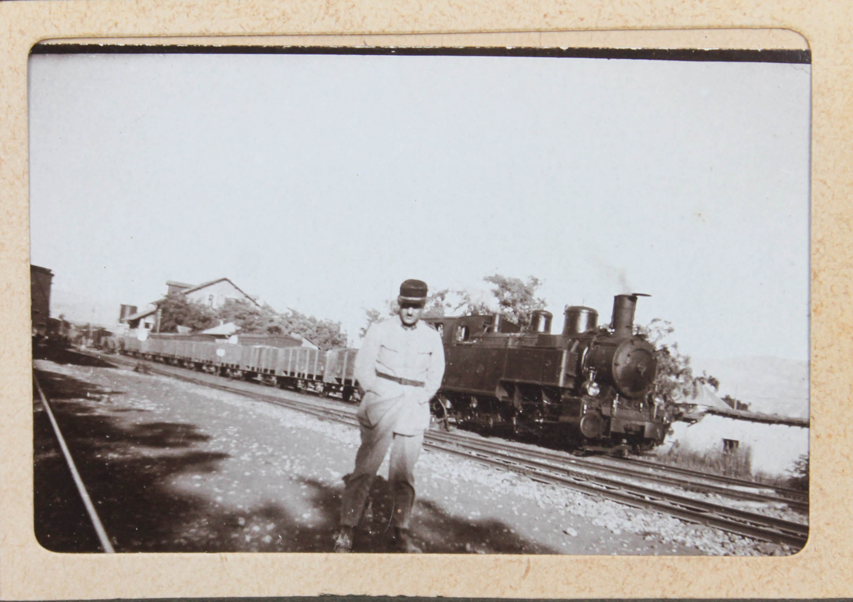 The album features eighty-four rare amateur photographs of the western Arab World, with most images showing early twentieth-century Lebanon. About twenty photos of Baalbek portray local landmarks (Temple of Jupiter, Hajar al-Hibla, Roman Ruins, Roman Temple of Bacchus, etc.), ethnographic views (with a clearly visible Lebanese flag waving atop a local dwelling), and lively shots of the compiler and his military comrades posing at ancient sites. Especially interesting is a candid urban scene showing locals in European costume and traditional attire standing on the platform or walking along the tracks at Baalbek Railway Station, with French police maintaining order. The Lebanon series concludes with a photograph of the iconic Pine Residence in Beirut and well-executed views of the city’s waterfront.