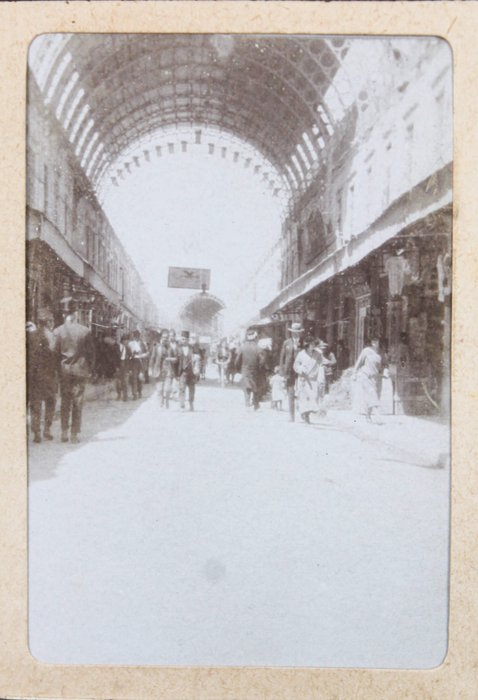 Identified photos from Syria mostly show the Grand Café Moderne, the entrance to the at-Taynabiyya mausoleum mosque, the Umayyad Mosque, Bab Tauma, and a busy Al Marjeh Square (with clearly visible telegraph column, trams, and horse carts) in Damascus. One lively vernacular photograph taken at the historic Midhat Pasha Souh shows dozens of locals busily navigating a dense corridor of marketplace stalls. The other images primarily depict sweeping aerial views of the city, residential architecture, street reconstruction works, and diverse urban scenes.