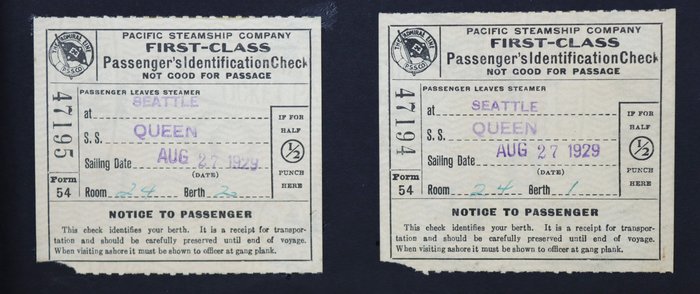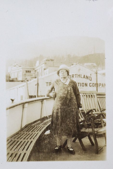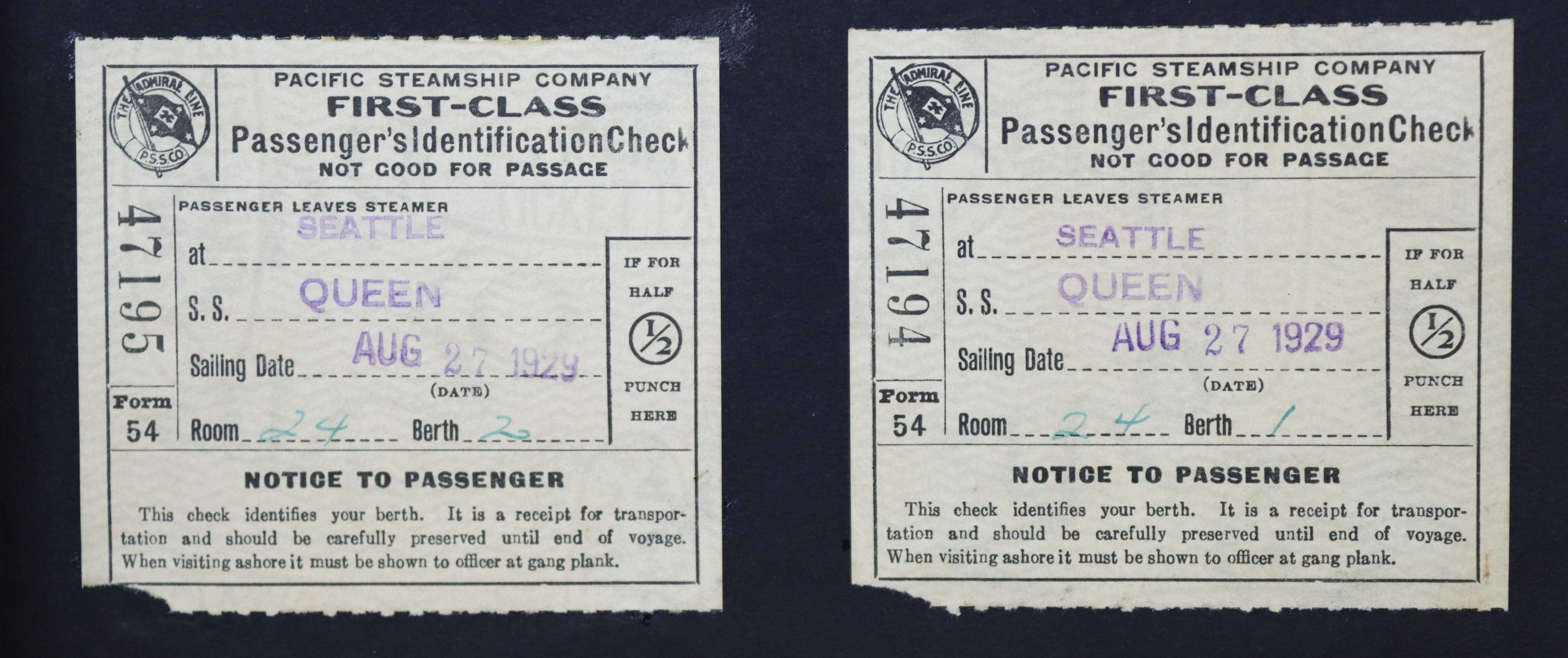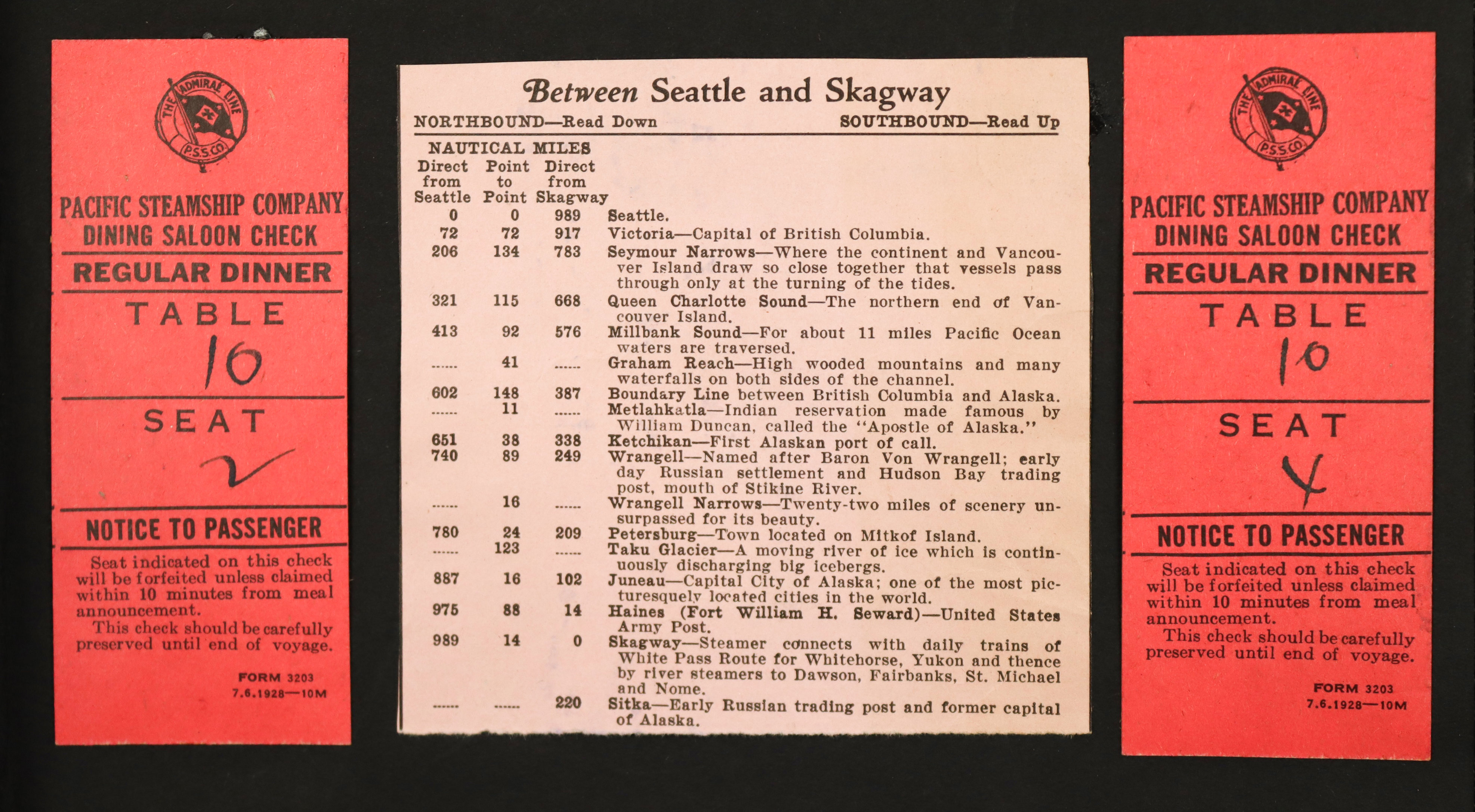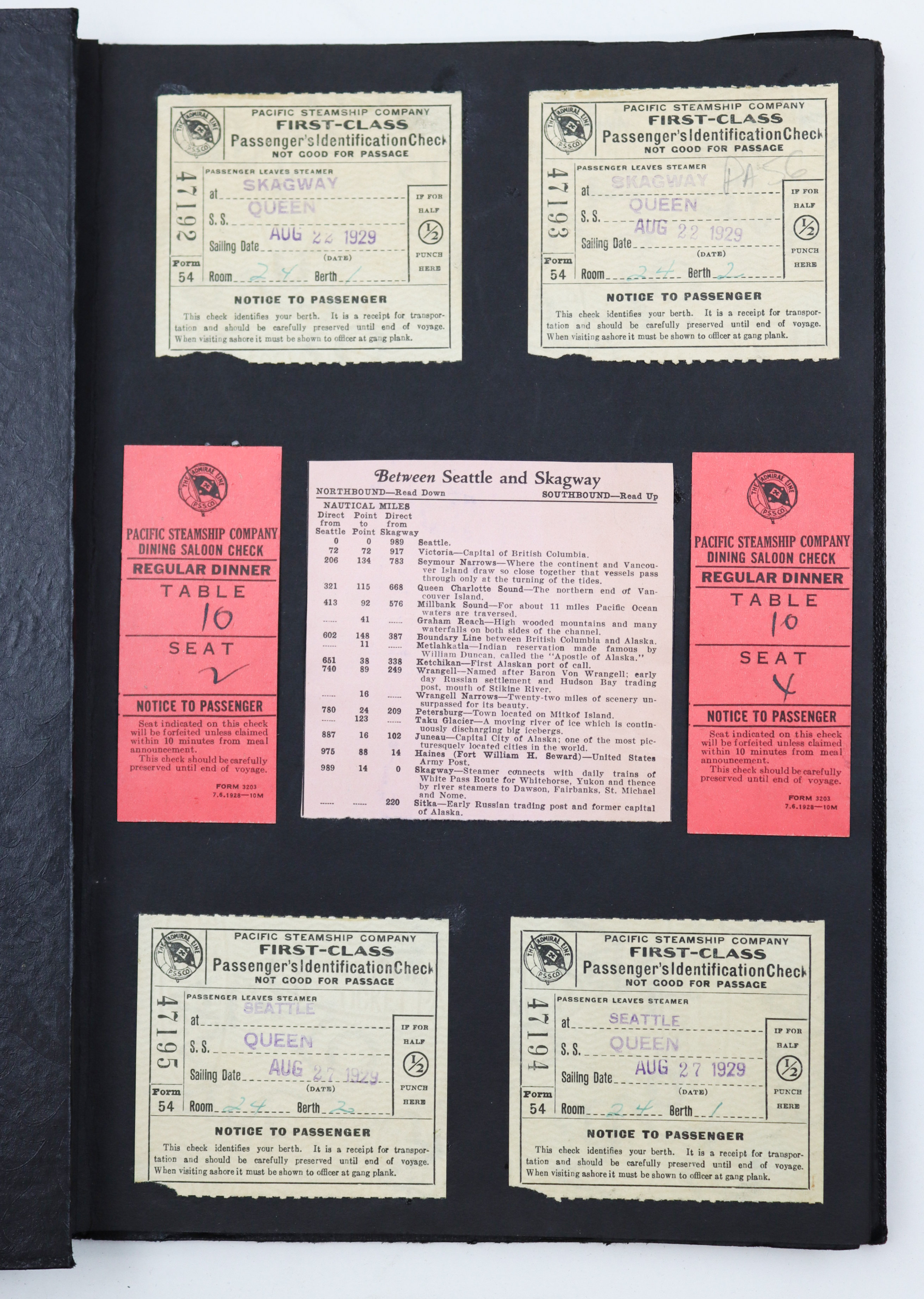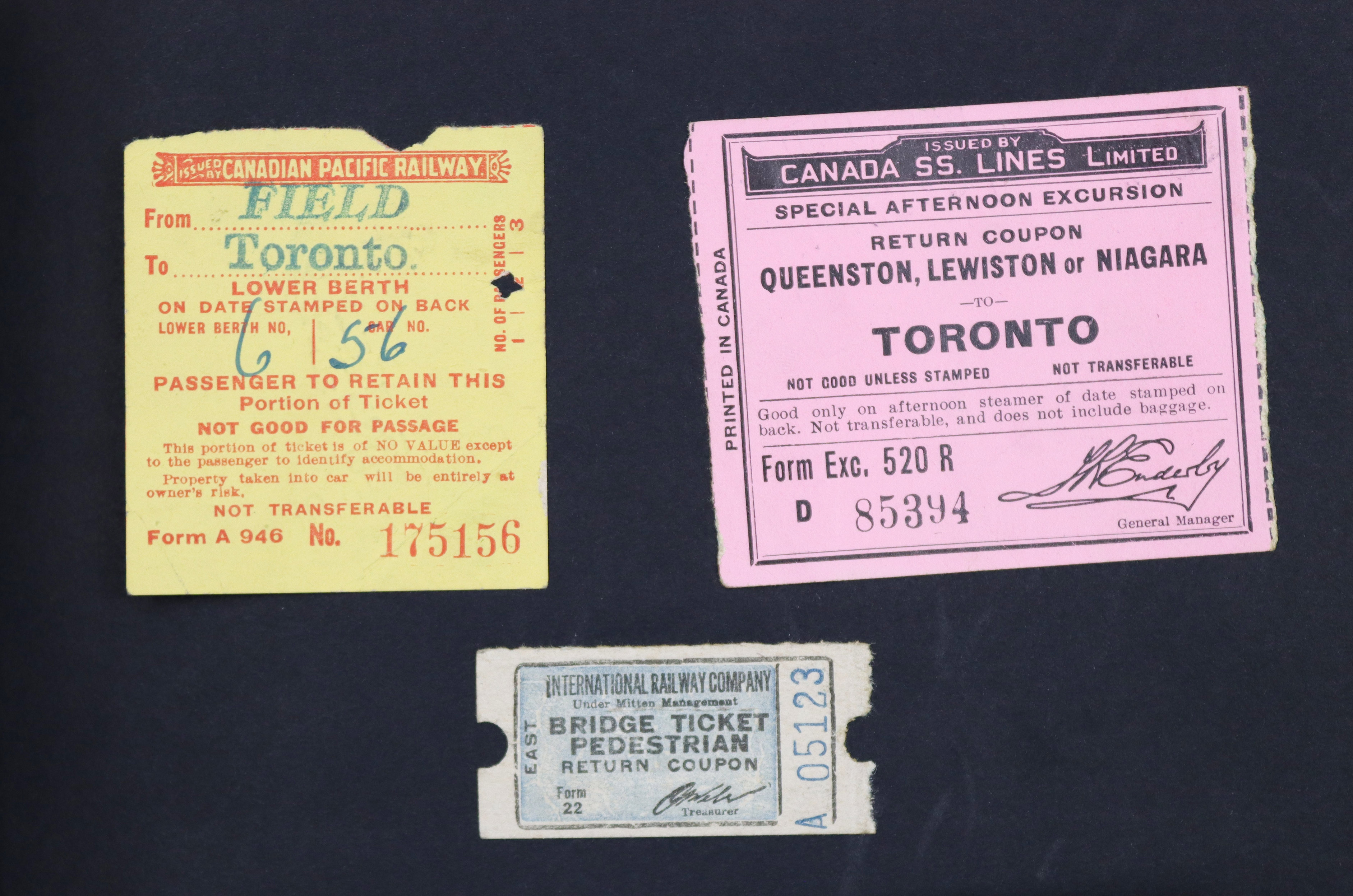 The collection is supplemented with ca. ten pieces of printed ephemera, including a ticket for the SS Queen (Skagway–Seattle), a Pacific Steamship Company dining saloon check, a Canadian Pacific Railway ticket (Field–Toronto), a Canada Steamship Lines coupon for an excursion across Lake Ontario, and an International Railway Company pedestrian bridge ticket for crossing the U.S.–Canada border at Niagara.