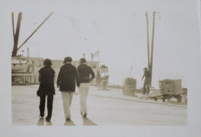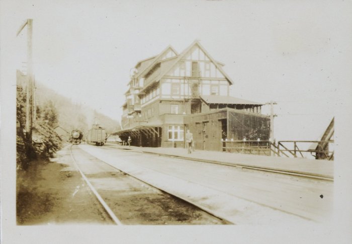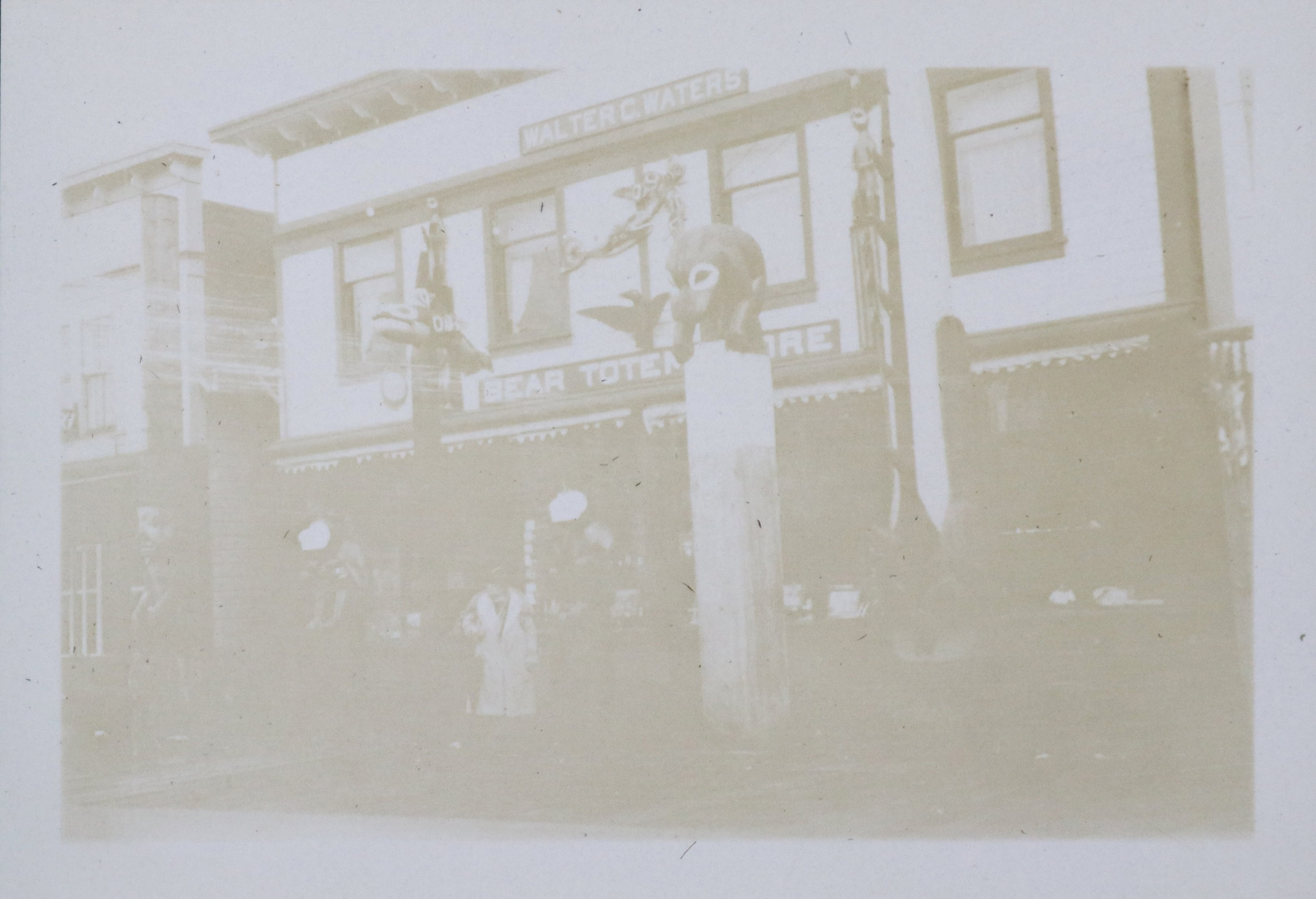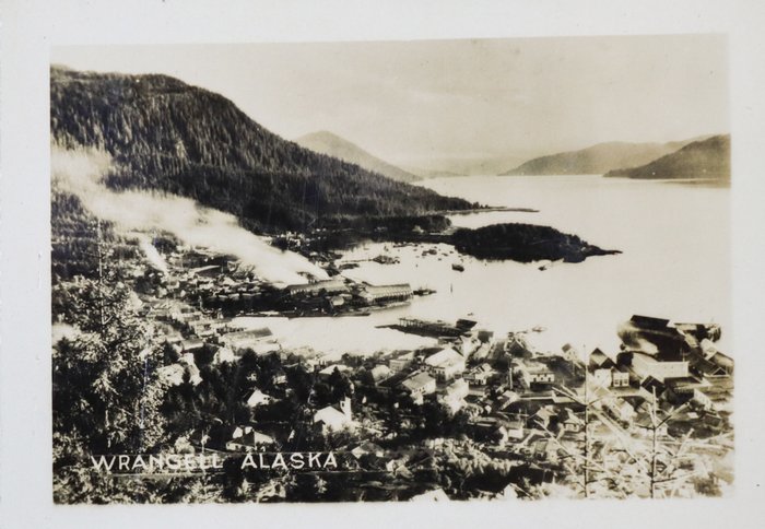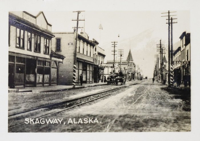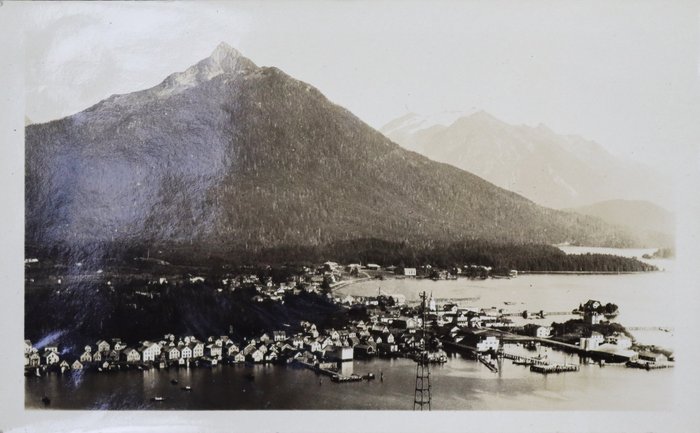 The album contains eighty-one well-preserved photographs and real photo postcards with most images documenting the Alaska voyage. About ten excellent photos of Ketchikan show general views of the waterfront, Ketchikan Creek, and a cityscape with clearly visible signs “US Cable Landing” and “Northland Transportation Company.” Seven photographs from Wrangell capture the waterfront (including the steamer Yukon), Indigenous girls walking along the harbor, and a classical Raven Totem. Especially interesting are two early street views with taxis parked along the sidewalks and signs for “Alaska Café” and “Walter C. Waters (authority on antiquities).” Five photographs from Petersburg focus on harbor scenes, with fishing boats and steamers alongside buildings lining the waterfront. Interesting scenes from Juneau include landscapes (Auk Lake, Mendenhall Glacier), the harbor, and a street view with visible “Kodaks” and “Studio Portraits” advertisements. The collection also contains about eight photographs taken in Skagway, depicting the White Pass & Yukon Route Railroad, Skagway Canyon, and the International Boundary sign. Especially important is a view along Broadway toward the mountains, with railway tracks in the foreground and a swastika symbol in the background (used prior to its appropriation by the Nazi Party as a sign of hospitality among Indigenous peoples of the Americas). The Alaska series concludes with several photographs from Sitka, showing Lovers Lane, Mount Verstovia, and the waterfront.