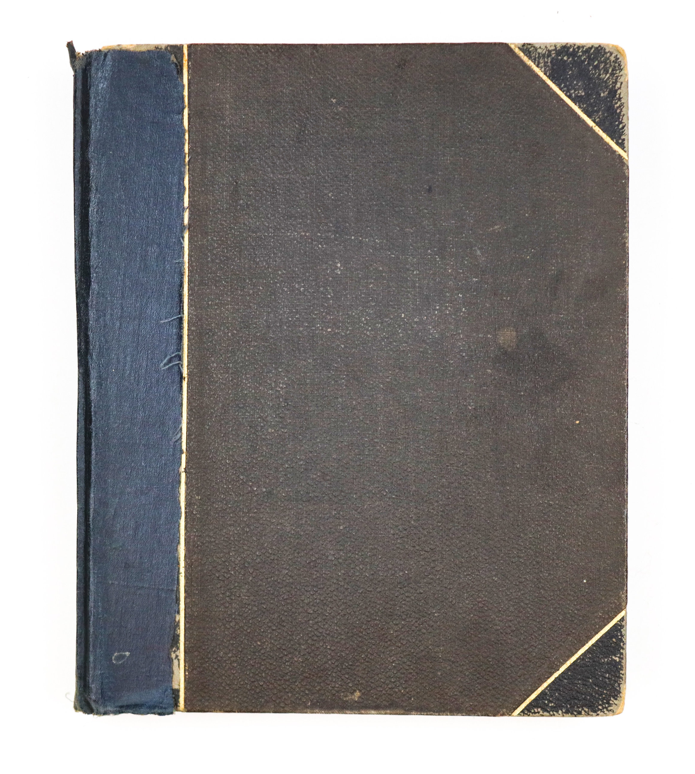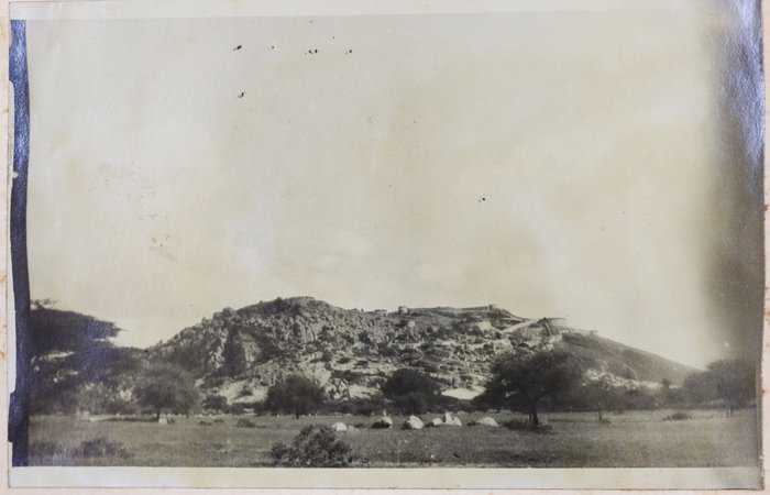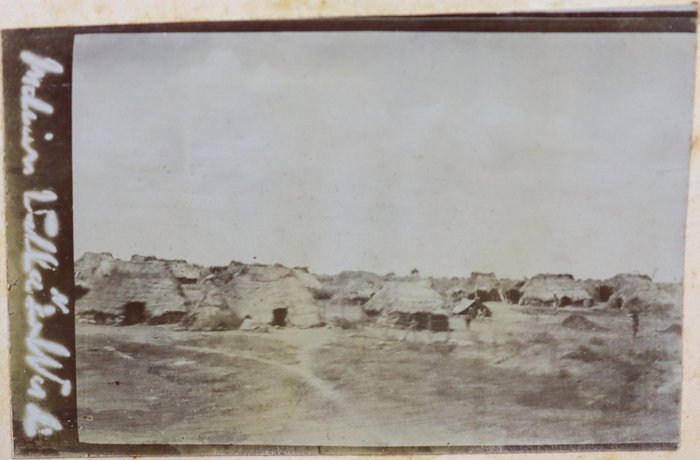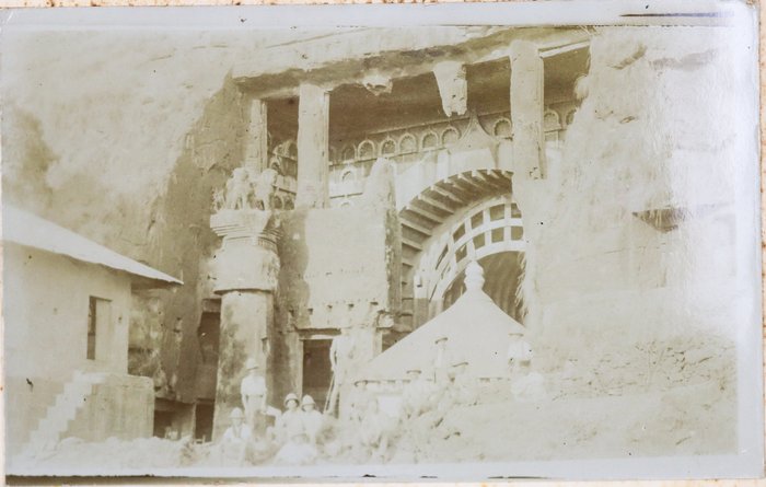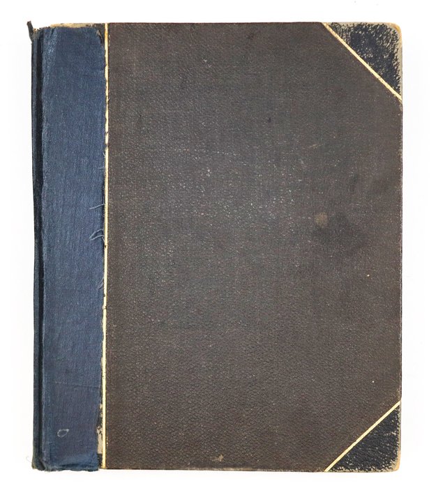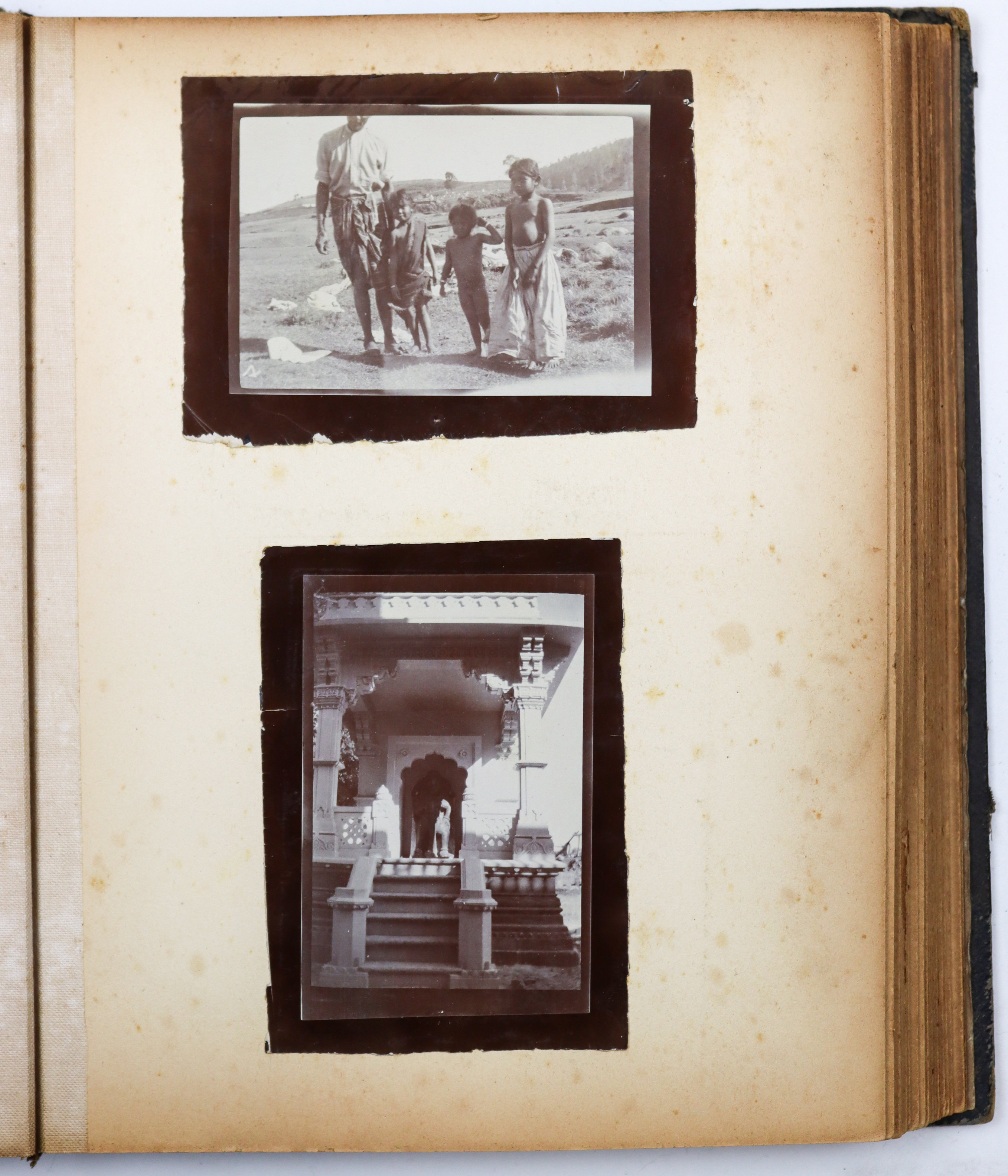 Quarto album ca. 24,9x20,5 cm (9 ¾ x 8 in). 24 card stock leaves. (including 4 blank) With 69 mounted original gelatin silver photographs from ca. 8,7x13,9 cm (3 ½ x 5 ½ in) to ca. 2,9x5,6 cm (1 x 2 ¼ in). Most photos with period English captions either on the mounts or in negative; at least one photo dated; with ca. 10 period printed postcards ca. 8,4x13 cm (3 ¼ x 5 in); two greeting cards (one signed by “Herb” from Poona, India, in 1914); and a souvenir fold-out set of 10 postcards, each ca. 3,4x6,8 cm (1 ¼ x 2 ¾ in). Half-leather binding with a cloth glued on the spine. Binding worn and rubbed, first page is detached from the main block, at least one photo missing, age-toning, but otherwise a very good album with strong photos.