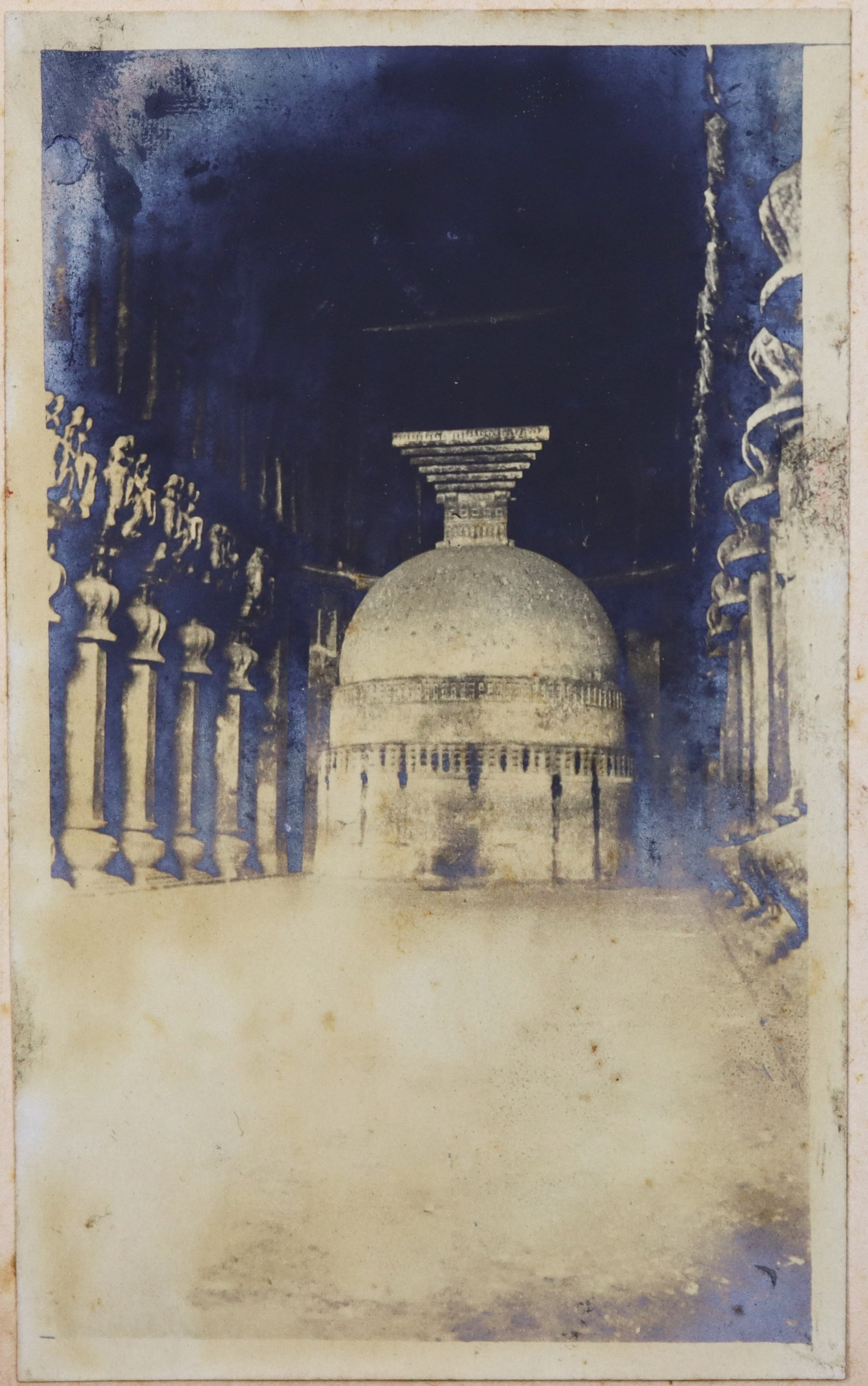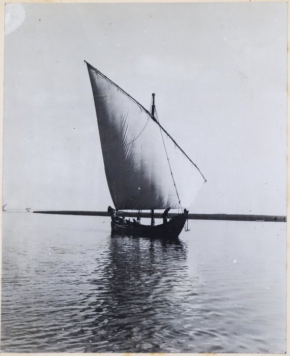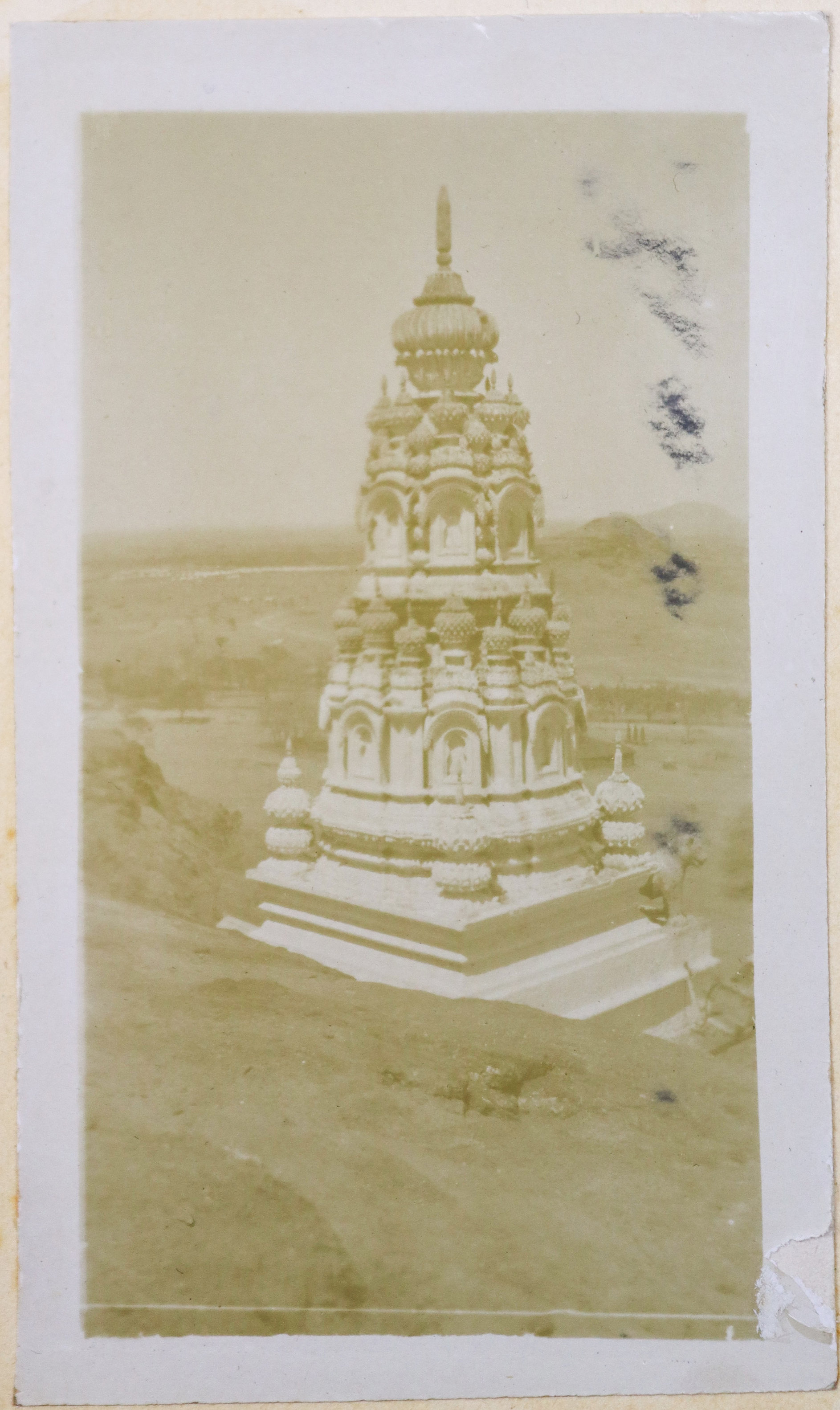 Quarto album ca. 24,9x20,5 cm (9 ¾ x 8 in). 24 card stock leaves. (including 4 blank) With 69 mounted original gelatin silver photographs from ca. 8,7x13,9 cm (3 ½ x 5 ½ in) to ca. 2,9x5,6 cm (1 x 2 ¼ in). Most photos with period English captions either on the mounts or in negative; at least one photo dated; with ca. 10 period printed postcards ca. 8,4x13 cm (3 ¼ x 5 in); two greeting cards (one signed by “Herb” from Poona, India, in 1914); and a souvenir fold-out set of 10 postcards, each ca. 3,4x6,8 cm (1 ¼ x 2 ¾ in). Half-leather binding with a cloth glued on the spine. Binding worn and rubbed, first page is detached from the main block, at least one photo missing, age-toning, but otherwise a very good album with strong photos.