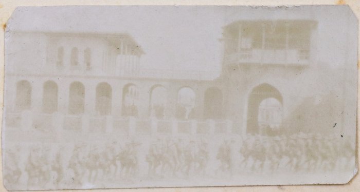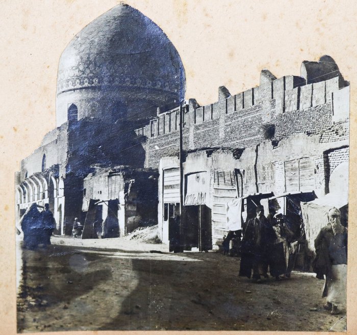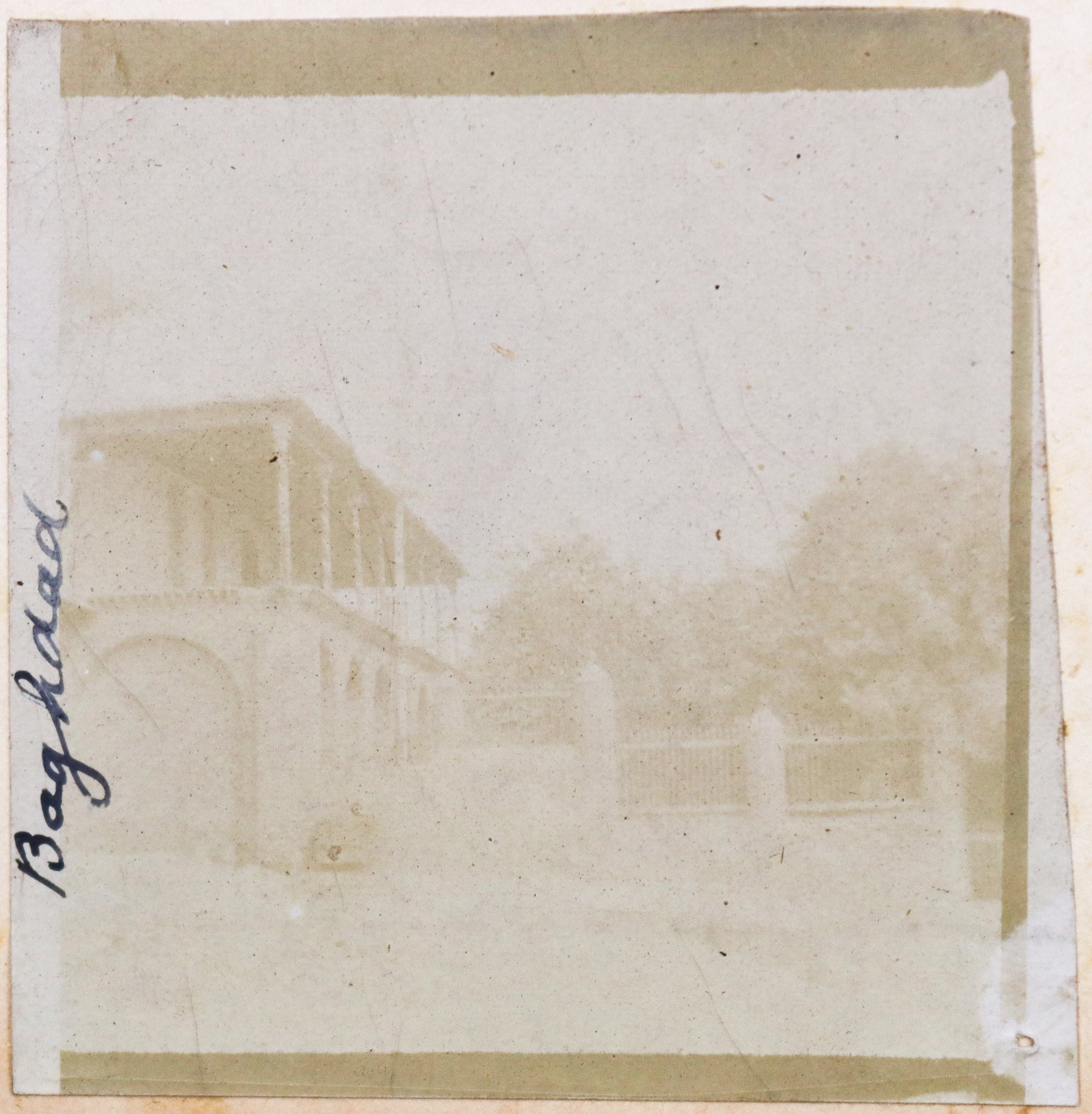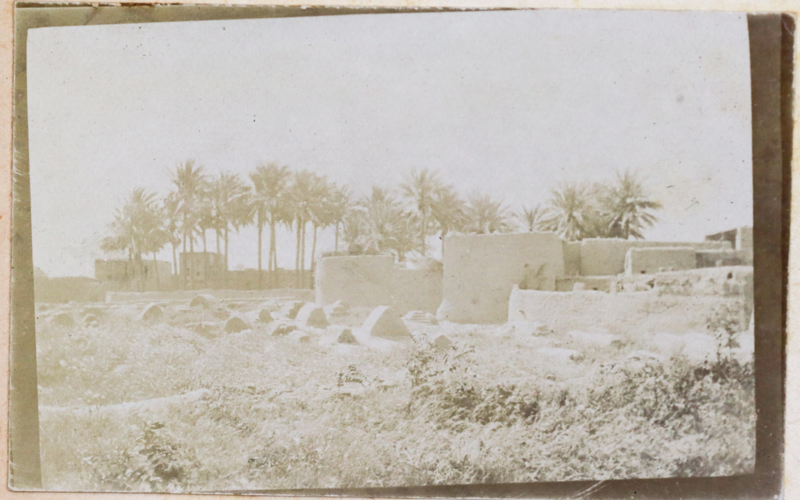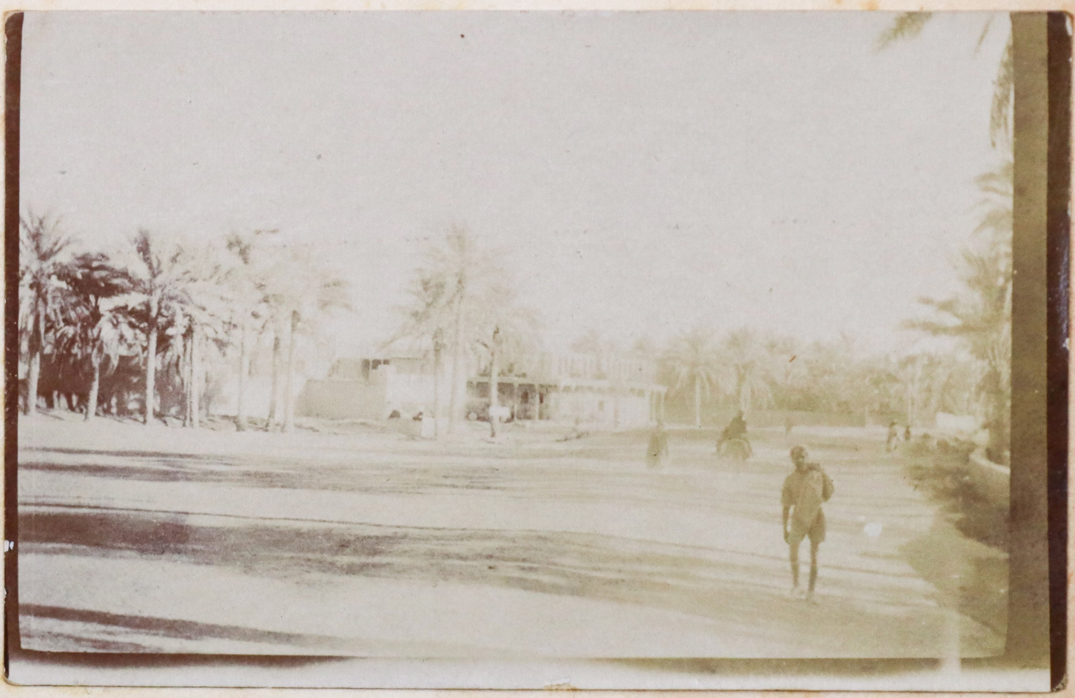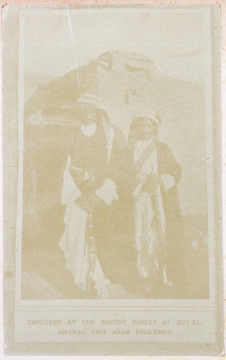 The album contains ca. 69 early amateur photographs, with most images taken in Mesopotamia (today’s Iraq) in the mid-1910s. Especially interesting are about five rare photographs of Baghdad captured shortly after the British occupation of the city. The images show Khalil Pasha Road or New Street (with the clearly visible Haydar Khana Mosque), a railway goods yard, the outskirts of the city photographed from an airplane, and the iconic ceremonial entry of the 1/4th Battalion, Hampshire Regiment, watched by locals lining the street. The last scene was apparently staged, with the battalion marching from a camp outside the city specifically for propaganda purposes. Other lively vernacular photographs from Mesopotamia include two heavily armed Arab policemen posing for a cameraman in Kut Al Amara, officers of the 1/4th Battalion, Hampshire Regiment, joyfully playing football in Tal Afar, and an apparent compiler posing with local children. The rest of the Mesopotamian series mostly shows local landmarks and architecture in Al-ʻUzair (Ezra’s Tomb), Al-Qurnah (the traditional site of the Garden of Eden), Kirkuk (main street view with English shop signs, factory barracks, and government house), Tal Afar (motor convoy), and Baqubah (a double pontoon bridge crossing the Diyala River, ambulance cars at the railroad, etc.)
