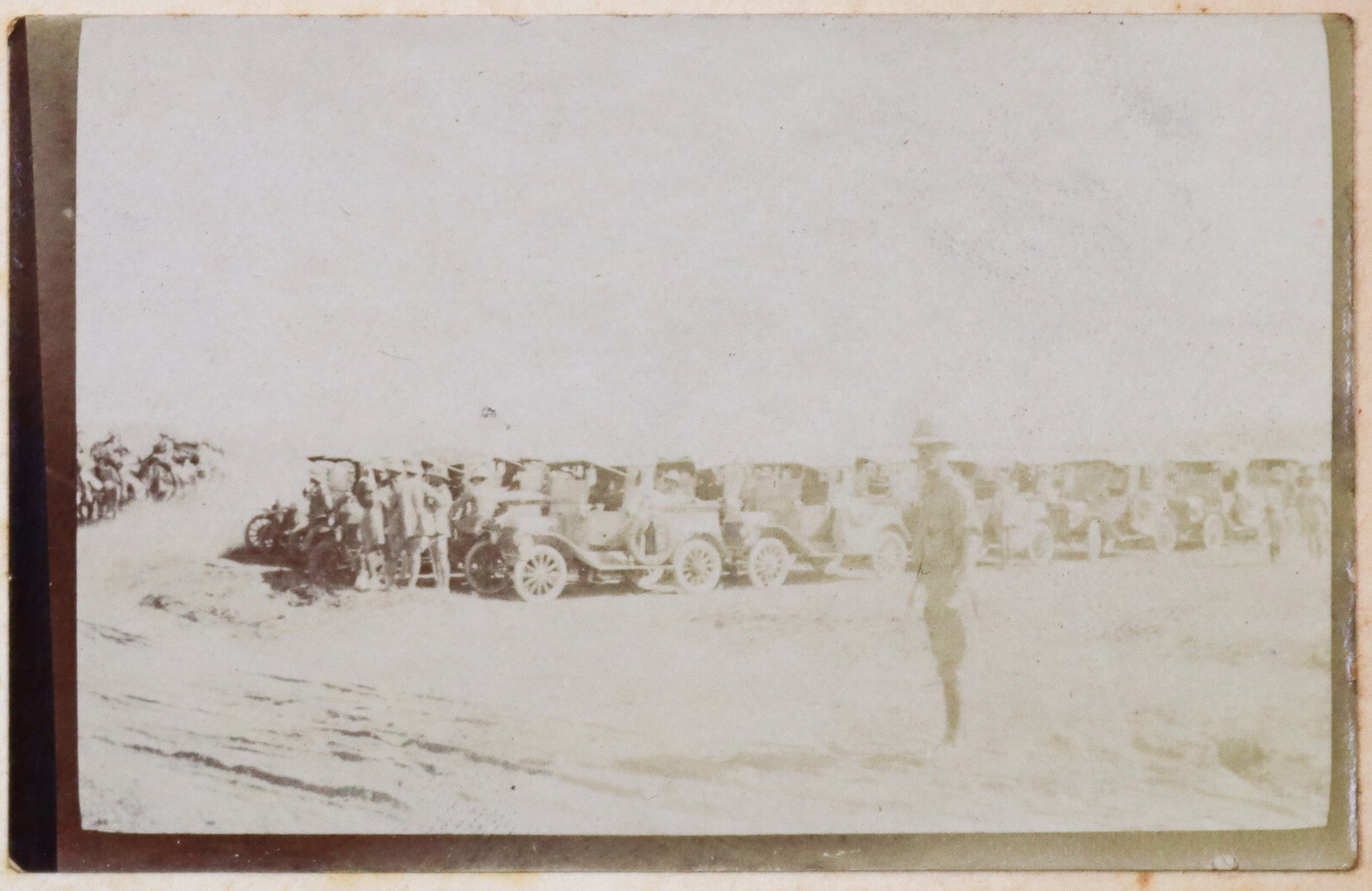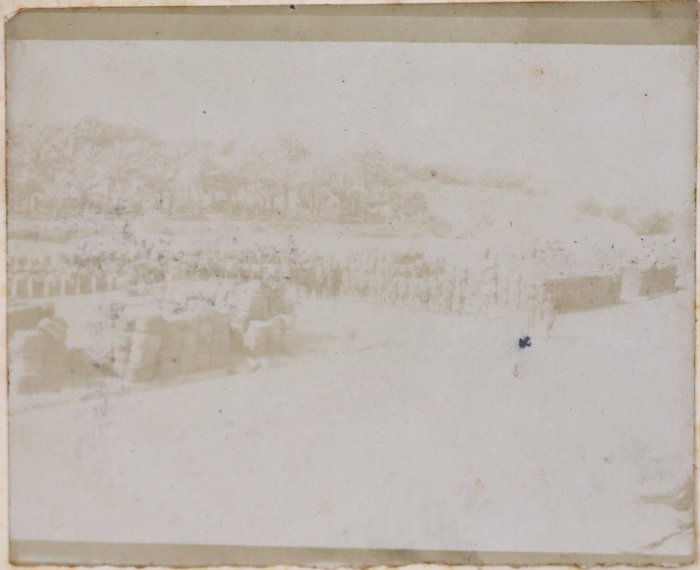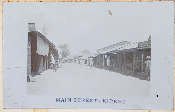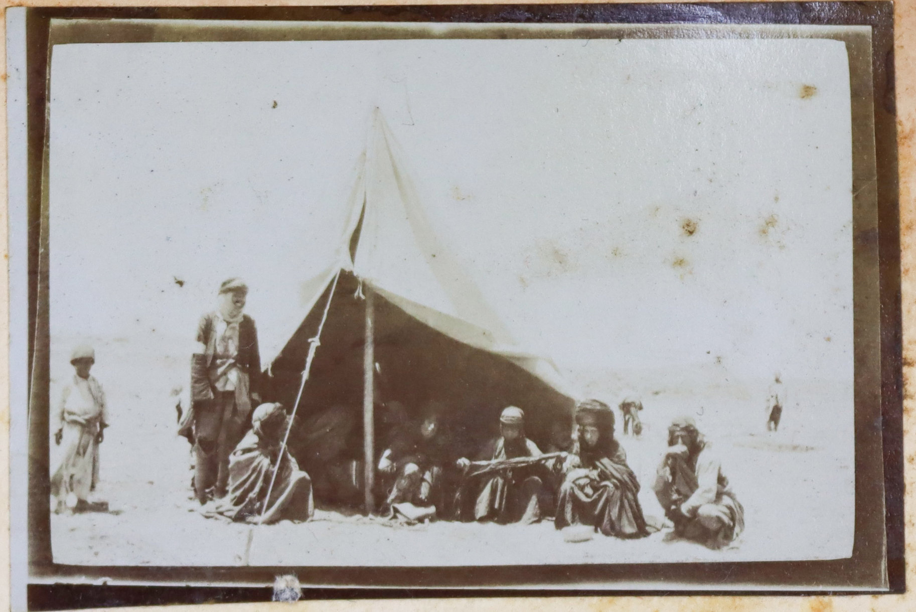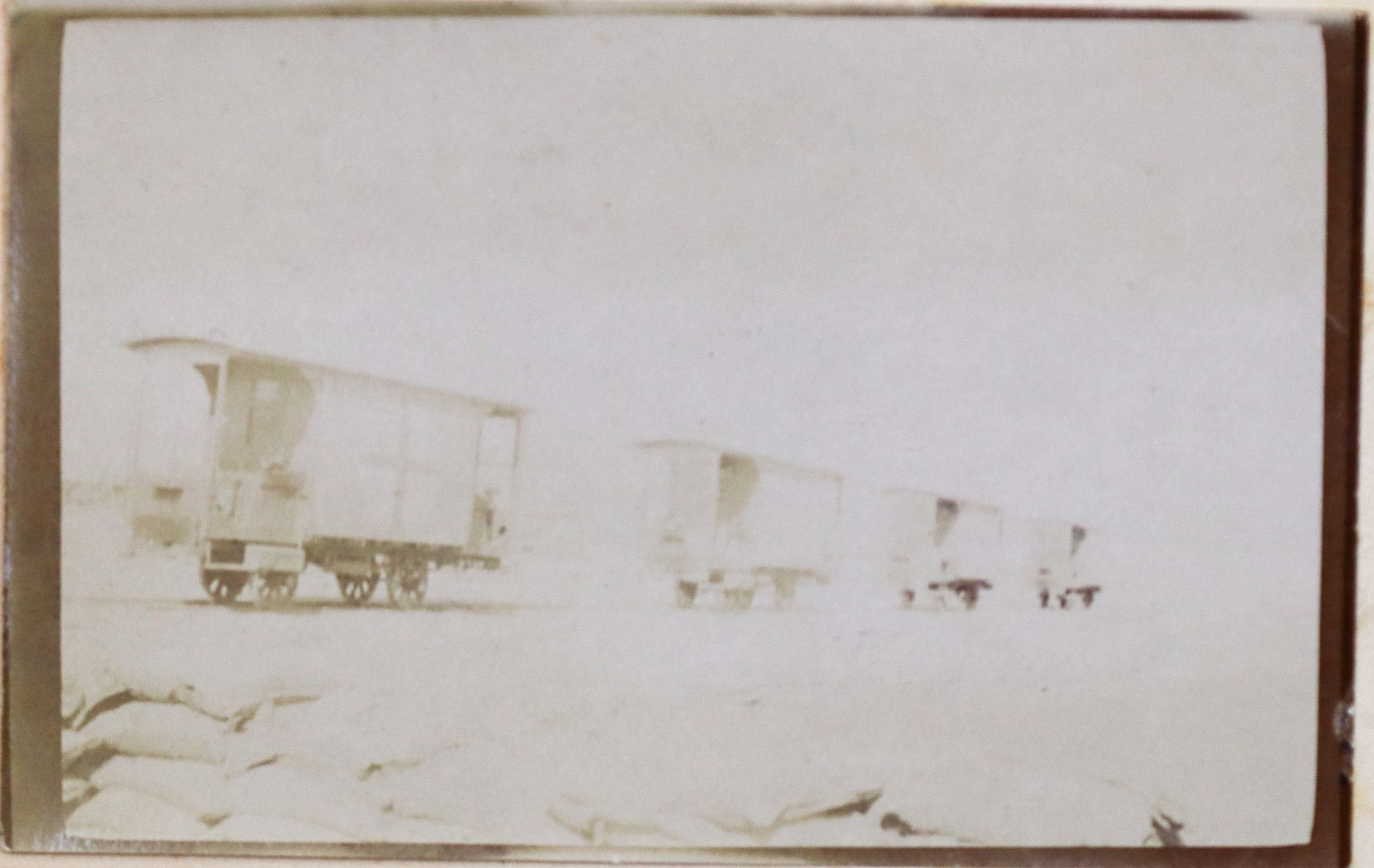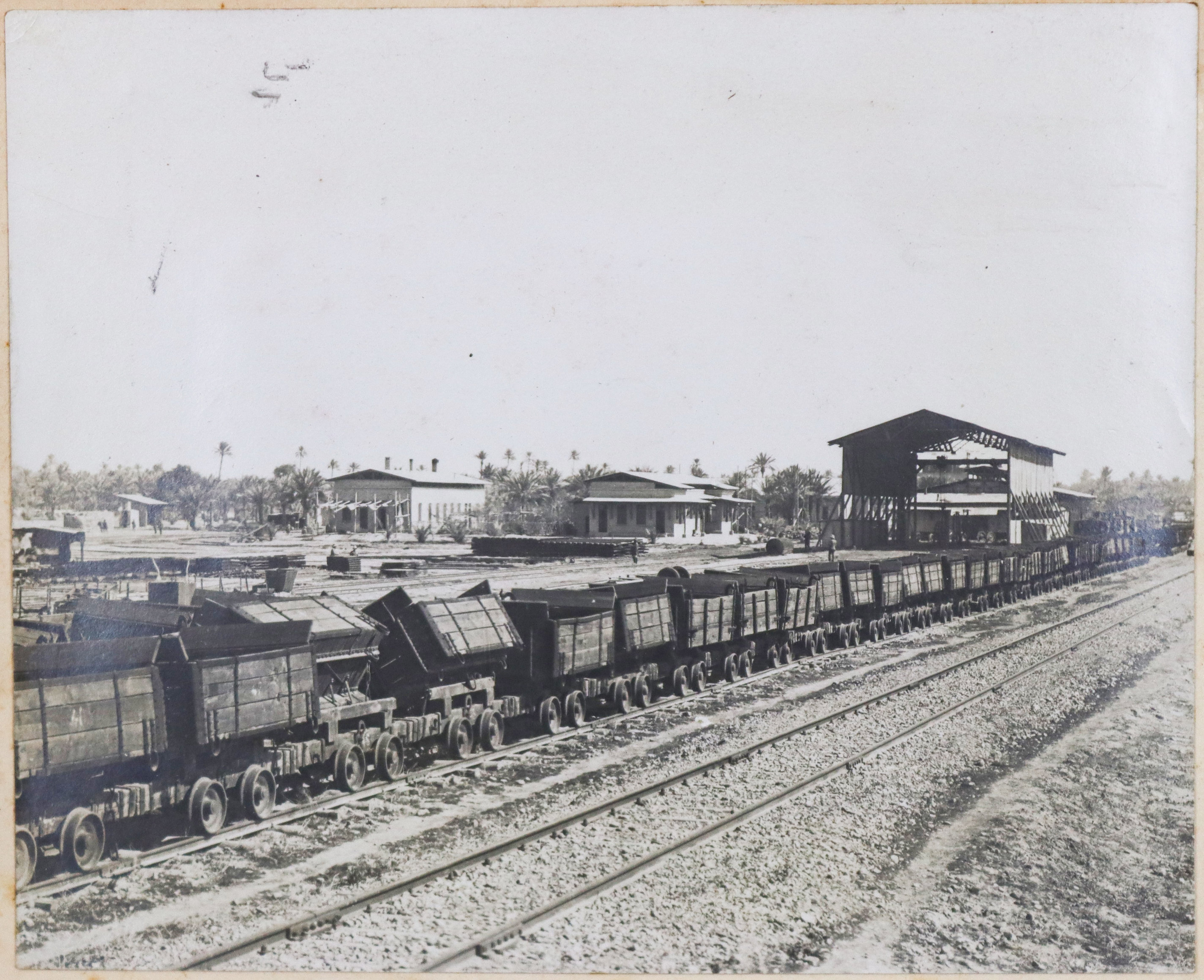 The album contains ca. 69 early amateur photographs, with most images taken in Mesopotamia (today’s Iraq) in the mid-1910s. Especially interesting are about five rare photographs of Baghdad captured shortly after the British occupation of the city. The images show Khalil Pasha Road or New Street (with the clearly visible Haydar Khana Mosque), a railway goods yard, the outskirts of the city photographed from an airplane, and the iconic ceremonial entry of the 1/4th Battalion, Hampshire Regiment, watched by locals lining the street. The last scene was apparently staged, with the battalion marching from a camp outside the city specifically for propaganda purposes. Other lively vernacular photographs from Mesopotamia include two heavily armed Arab policemen posing for a cameraman in Kut Al Amara, officers of the 1/4th Battalion, Hampshire Regiment, joyfully playing football in Tal Afar, and an apparent compiler posing with local children. The rest of the Mesopotamian series mostly shows local landmarks and architecture in Al-ʻUzair (Ezra’s Tomb), Al-Qurnah (the traditional site of the Garden of Eden), Kirkuk (main street view with English shop signs, factory barracks, and government house), Tal Afar (motor convoy), and Baqubah (a double pontoon bridge crossing the Diyala River, ambulance cars at the railroad, etc.)
