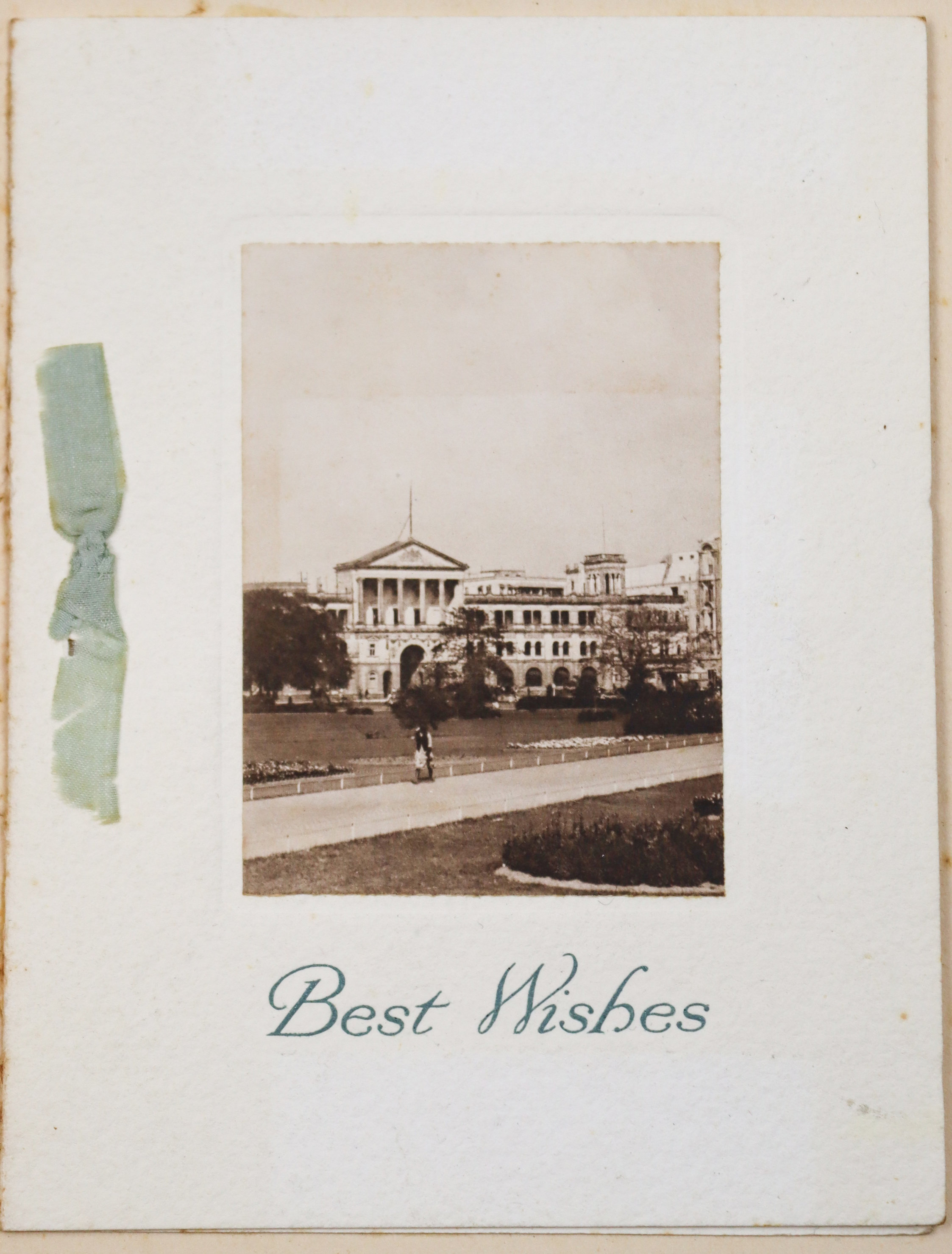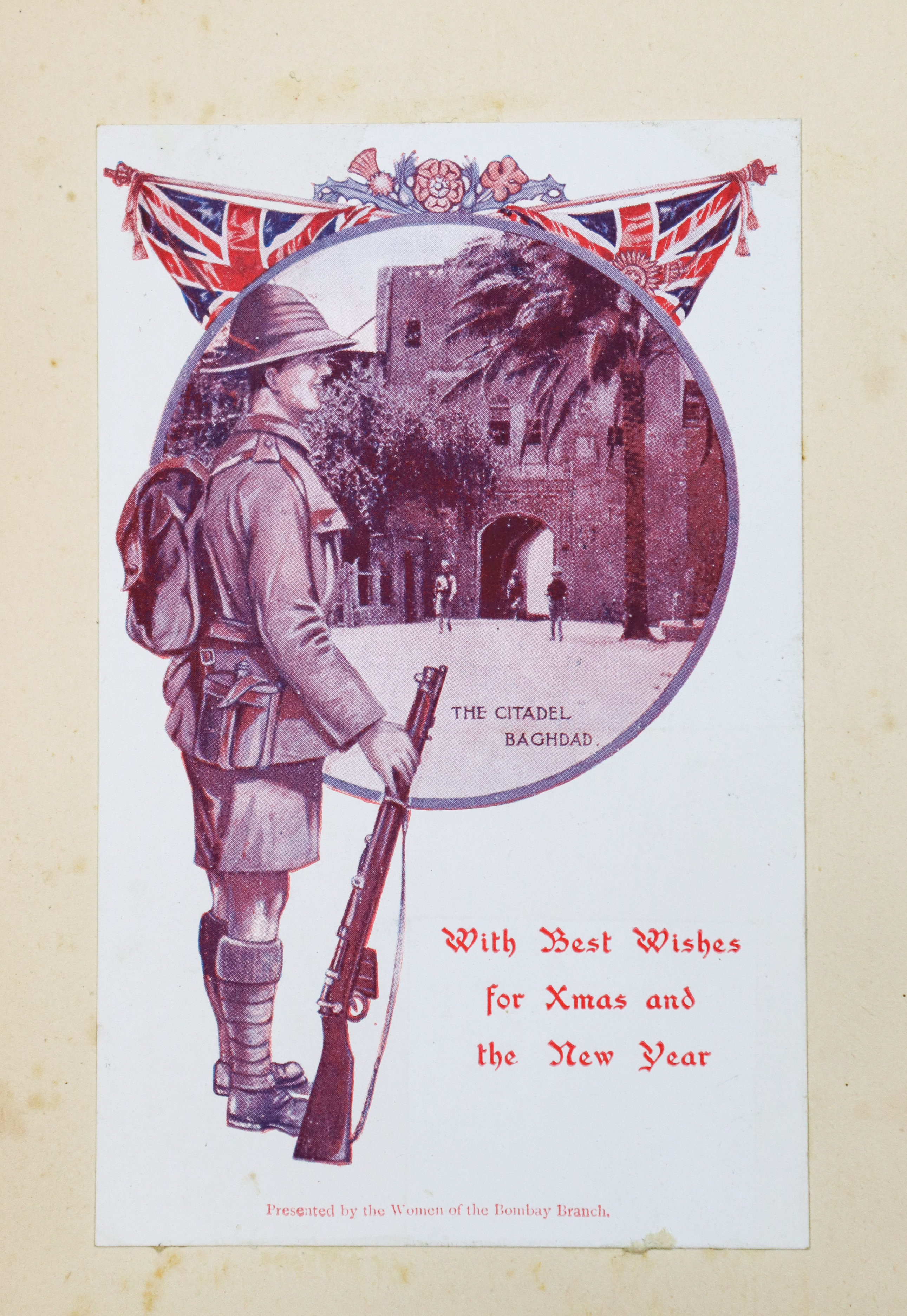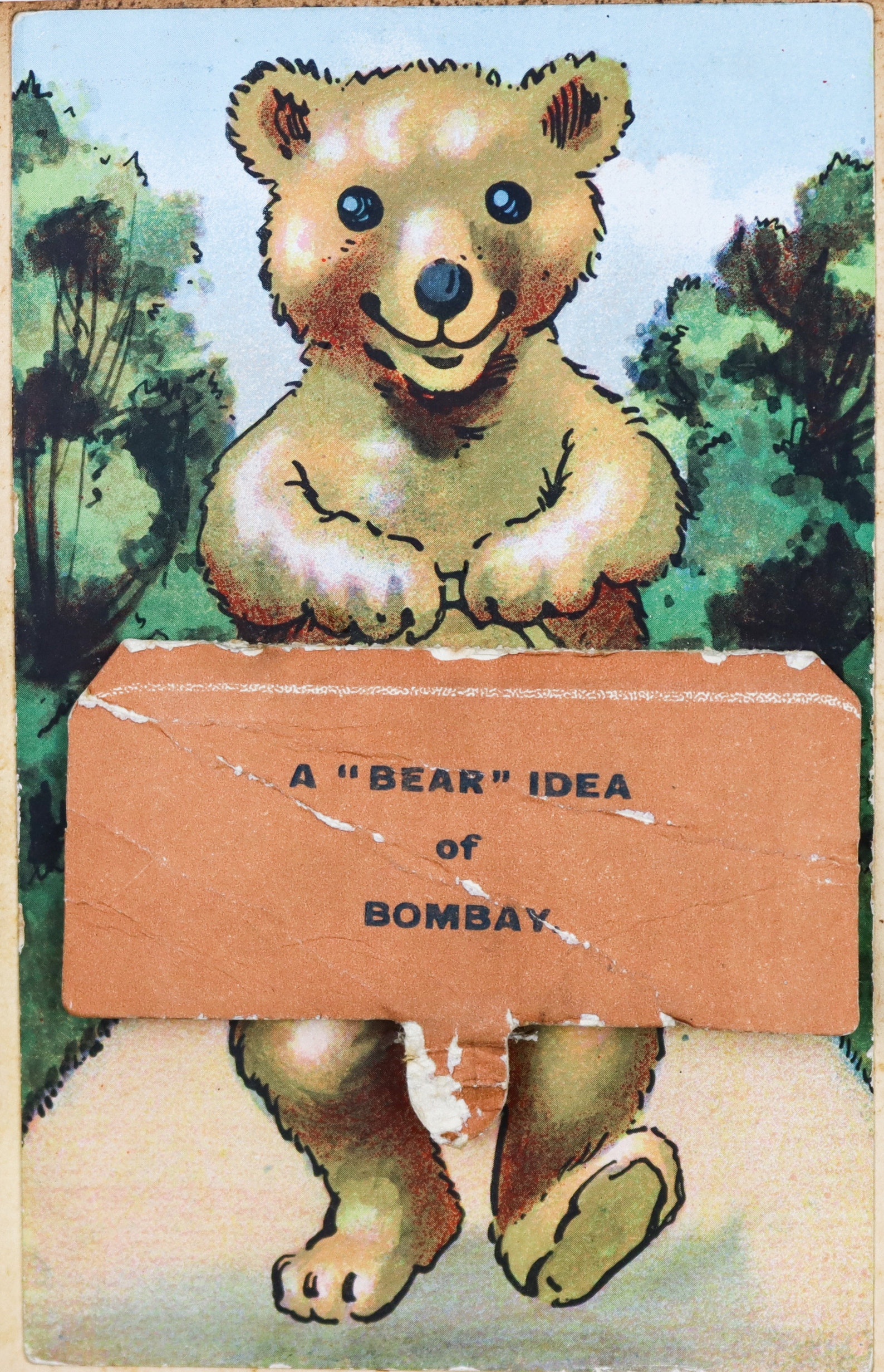 The collection also features about ten printed postcards of Mumbai and the Suez Canal; a WWI Christmas postcard; a New Year card from the 4th Battalion Hampshire Regiment signed by "Herb;" and a vintage "pull-out" souvenir postcard shaped like a bear holding an "A ‘Bear’ Idea of Bombay" sign; the flap reveals twelve small black-and-white views, including Queens Road, Null Bazar Street, Apollo Bunder, and Victoria Gardens.
