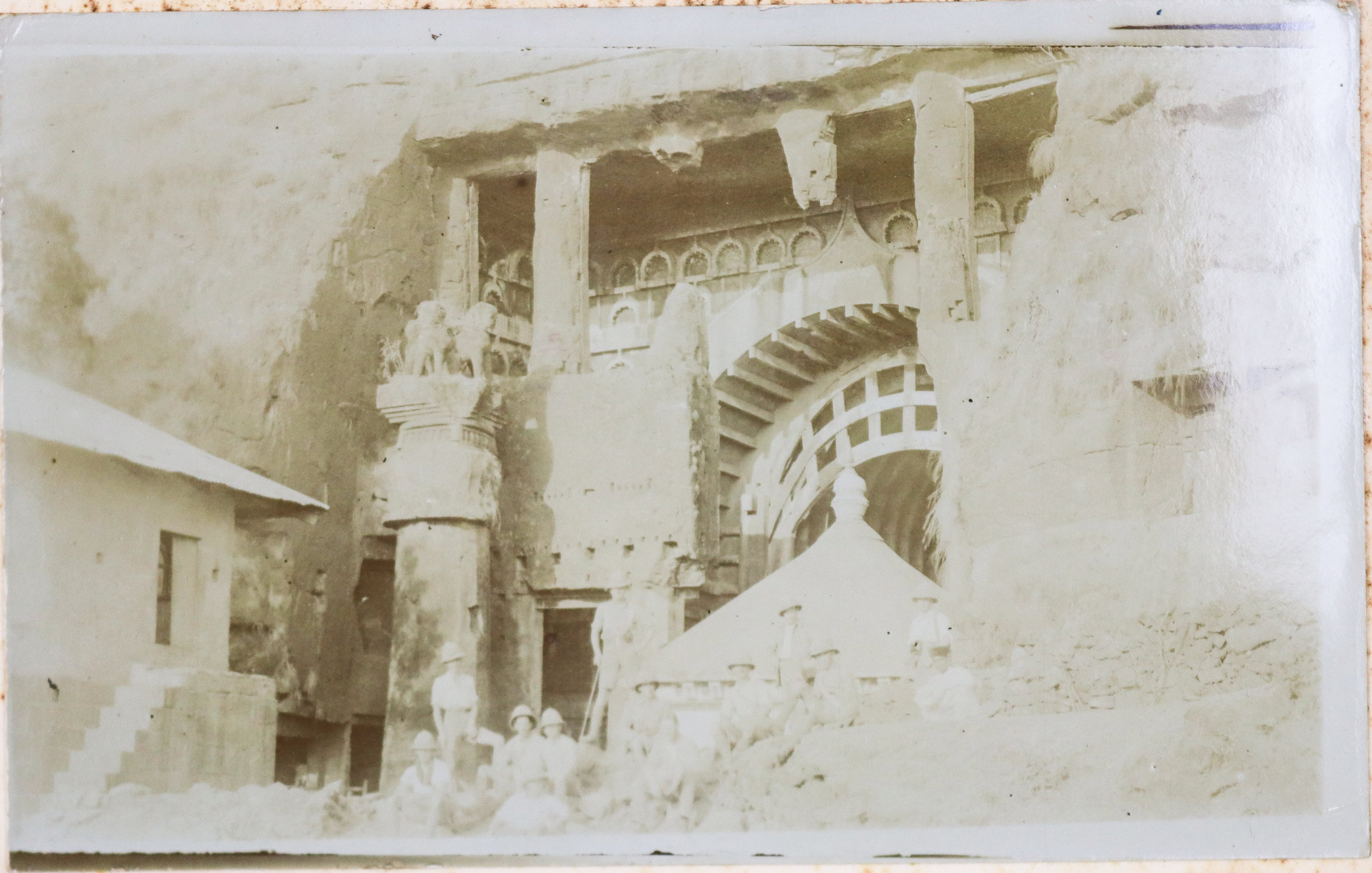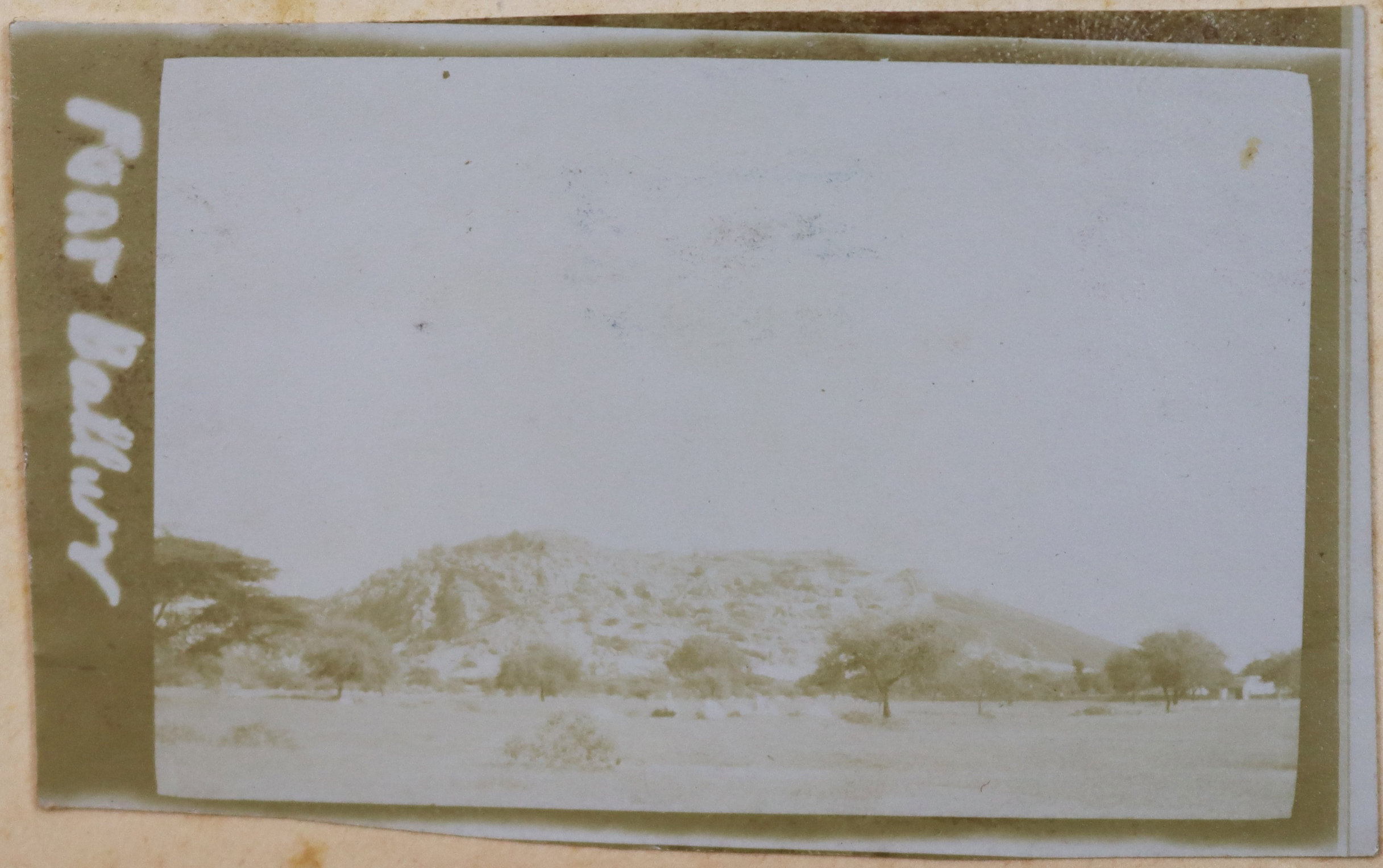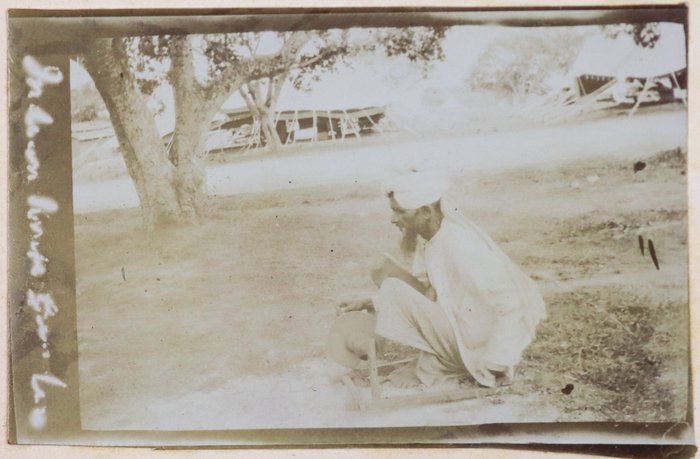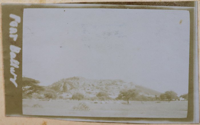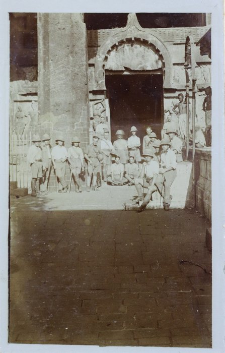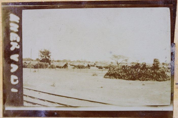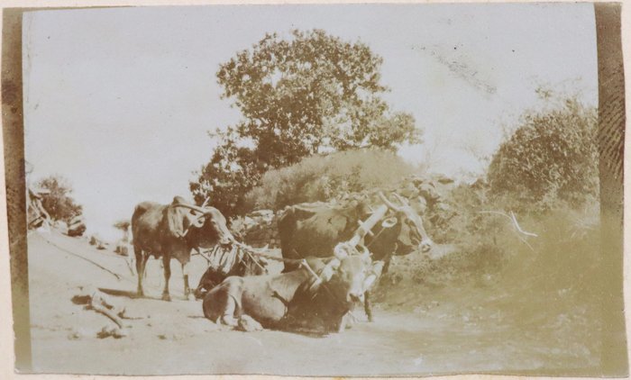 About twenty-five photographs of India were taken and collected by the compiler prior to the 1/4th Hampshire Regiment’s deployment to Mesopotamia. Interesting images include group portraits of British and Indian soldiers, Parsi haymakers in traditional attire clustered near barracks, and soldiers landing mules in Parsik Hill. Other photographs primarily depict the compiler and his companions, local children, the YMCA quarters in Deolali, nature views, and scenes of oxen drawing water from a well.