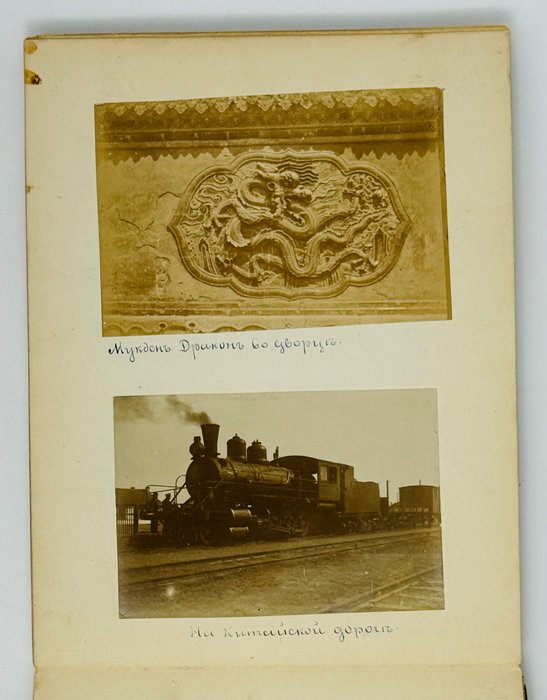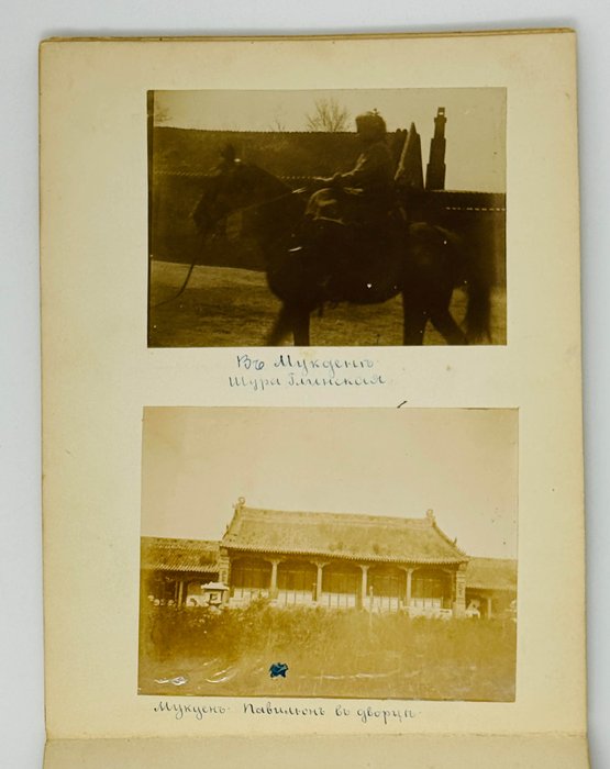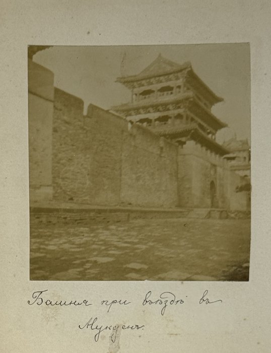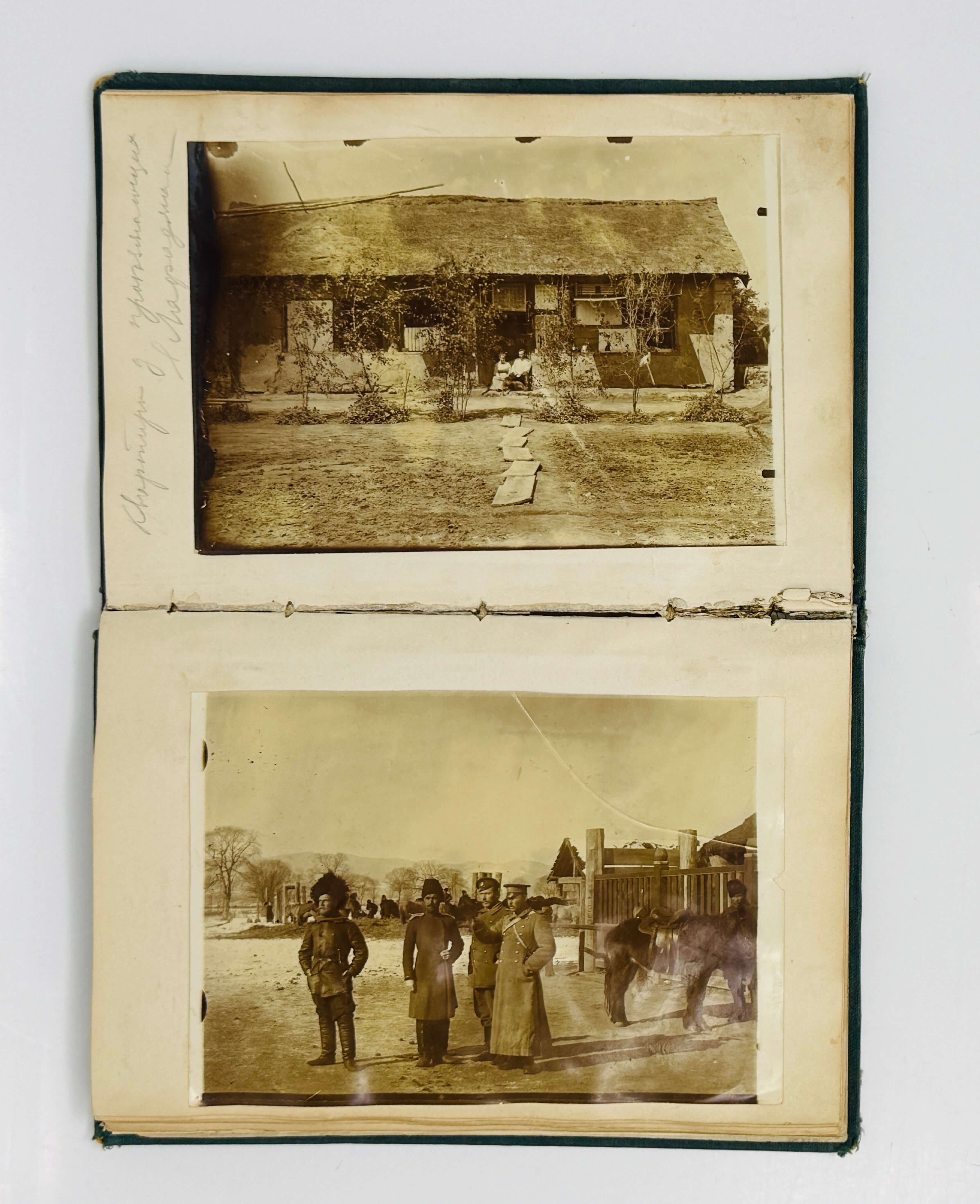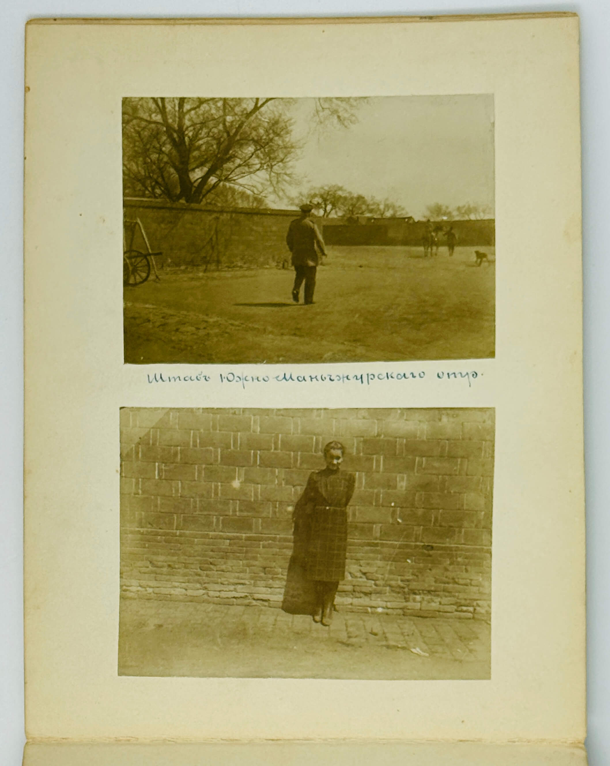 The first album is likely complied by lieutenant S.E.Bocharov of the South Manchurian Detachment of the Russian Army. This detachment operated in the Far East until the formation of the Manchurian Army in 1904, at the outset of the Russo-Japanese War. Its roots trace back to late summer and early autumn of 1901, when Russian troops in Northern Manchuria organized and executed operations to capture the last remaining leaders of the hunhuz movement who were still at large. The detachment was commanded by Lieutenant General Tserpitsky. The outcome of the detachment's operations was the capture of the Chinese General Sheu and the surrender of another *hunhuz* chieftain, Fulango. In August 1901, Lieutenant General Tserpitsky relinquished command of the South Manchurian Detachment to Major General Fleischer, who had previously commanded it at the beginning of the campaign during the advance on Haicheng. The creation of this album likely dates to this specific period; the photographs depict the detachment's headquarters in Mukden, officers and their families, a steam locomotive on the railway, the Liaohe River in Yingkou, a panoramic view of Yingkou, and a barracks building under construction. The album also contains two studio photographs of Nagasaki—including a hand-colored image of the customs house—as well as two Japanese studio genre scenes.