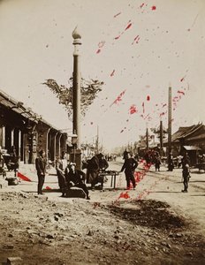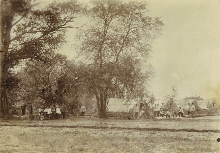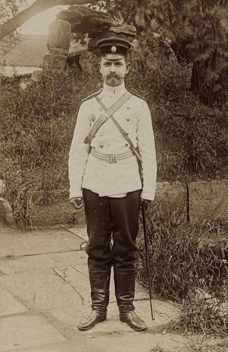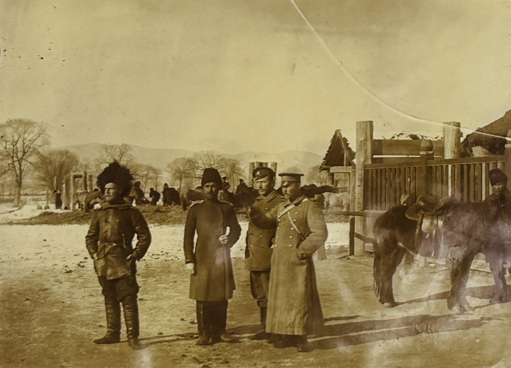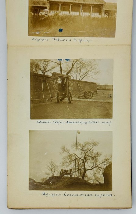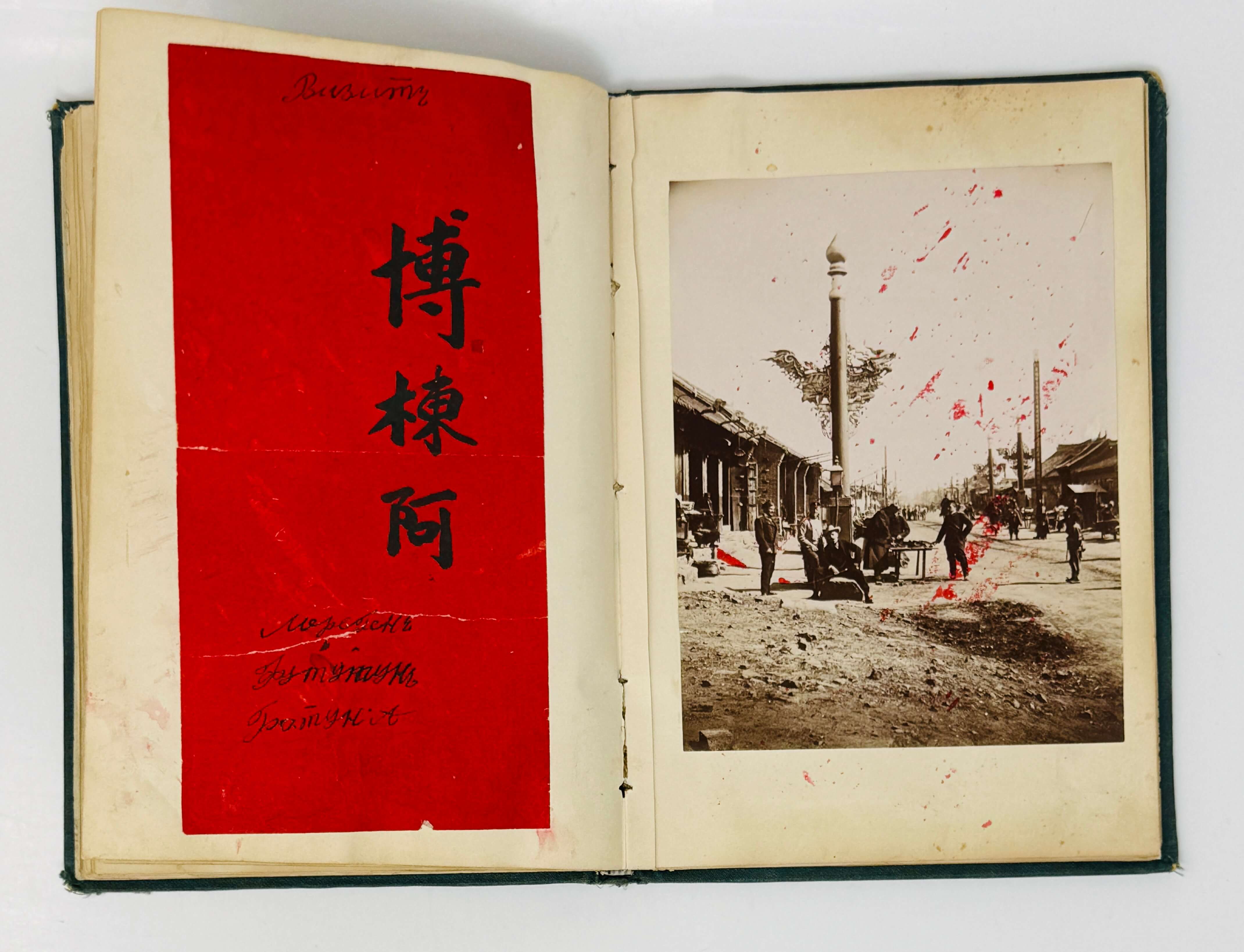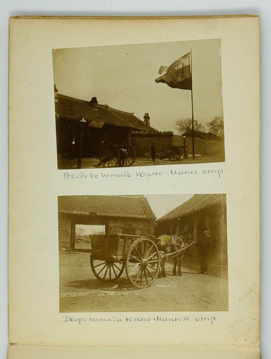 The first album is likely complied by lieutenant S.E.Bocharov of the South Manchurian Detachment of the Russian Army. This detachment operated in the Far East until the formation of the Manchurian Army in 1904, at the outset of the Russo-Japanese War. Its roots trace back to late summer and early autumn of 1901, when Russian troops in Northern Manchuria organized and executed operations to capture the last remaining leaders of the hunhuz movement who were still at large. The detachment was commanded by Lieutenant General Tserpitsky. The outcome of the detachment's operations was the capture of the Chinese General Sheu and the surrender of another *hunhuz* chieftain, Fulango. In August 1901, Lieutenant General Tserpitsky relinquished command of the South Manchurian Detachment to Major General Fleischer, who had previously commanded it at the beginning of the campaign during the advance on Haicheng. The creation of this album likely dates to this specific period; the photographs depict the detachment's headquarters in Mukden, officers and their families, a steam locomotive on the railway, the Liaohe River in Yingkou, a panoramic view of Yingkou, and a barracks building under construction. The album also contains two studio photographs of Nagasaki—including a hand-colored image of the customs house—as well as two Japanese studio genre scenes.