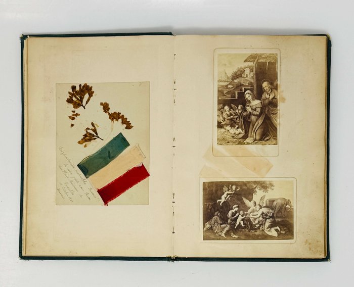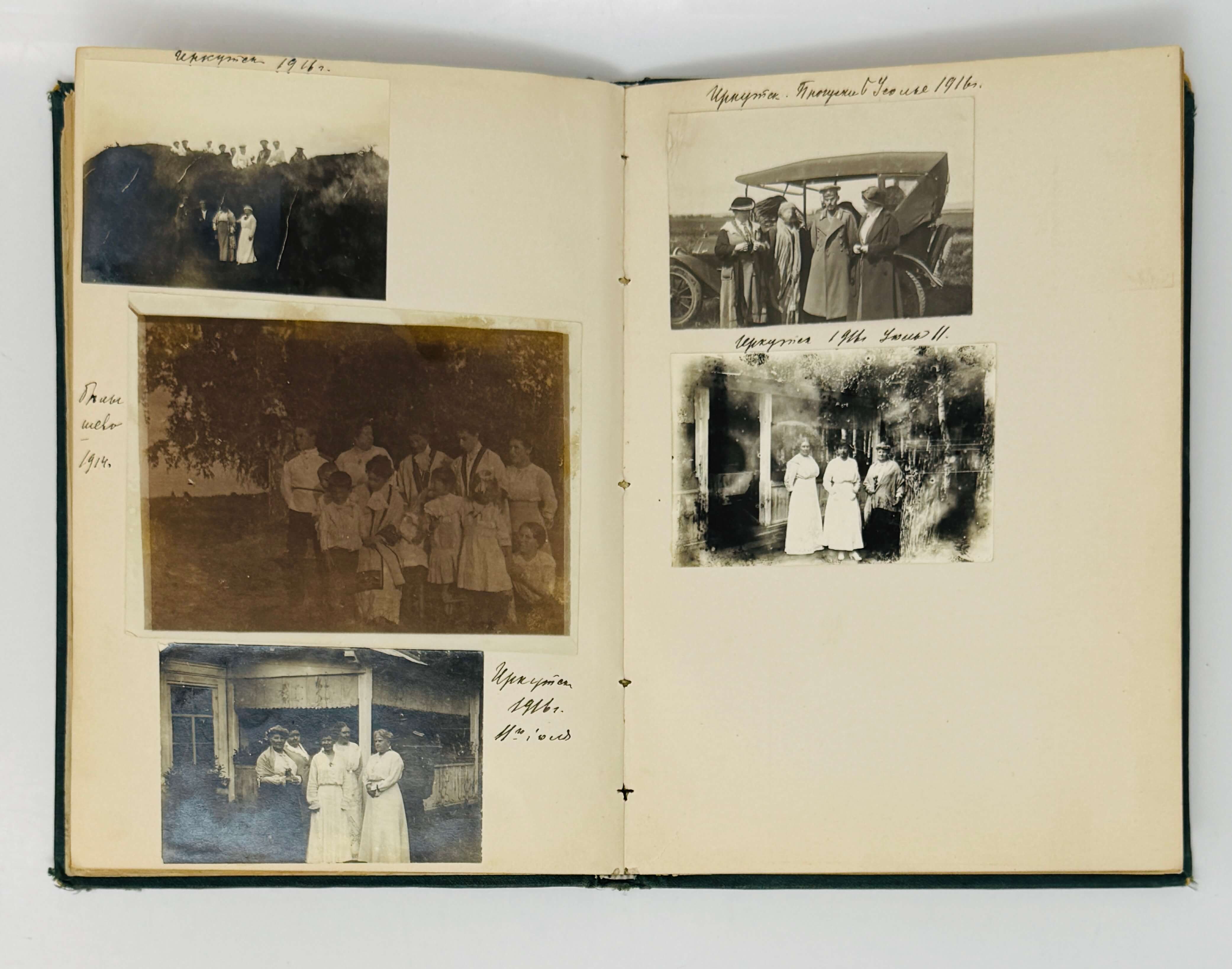 Octavo album (ca. 21,5x14,5 cm). 47 leaves (23 blank). Period green cloth binding. 73 photographs from 5,5x8,5 to 16,5x11,5 cm. Approximately half of the photos are captioned in Russian. The album is signed ’Sophie Stcherbakof. 26/1/1896 on the half-title’, the next page includes a deduction leaf from Alexei Fedorovich Vedernikov to Maria Fyodorovich and Nikolay Smirnov, who got married on 26th of January, 1896 in Verny (now - Alma-Ata, Kazakhstan), next to the dedication is a song Vedernikov sang at their wedding, on which he was the best man. Also album includes three pasted postcards, a collage with three cloth stripes red-blue and white and a praise for ‘matouchka Rossia’ in mix of French and latinized Russian, dated 1893 and a red piece of paper with printed in Chinese ‘Badong’ for the name of Badong province, and three geographical names from the province in Russian. Few photos are faded and with tears but overall in good condition.