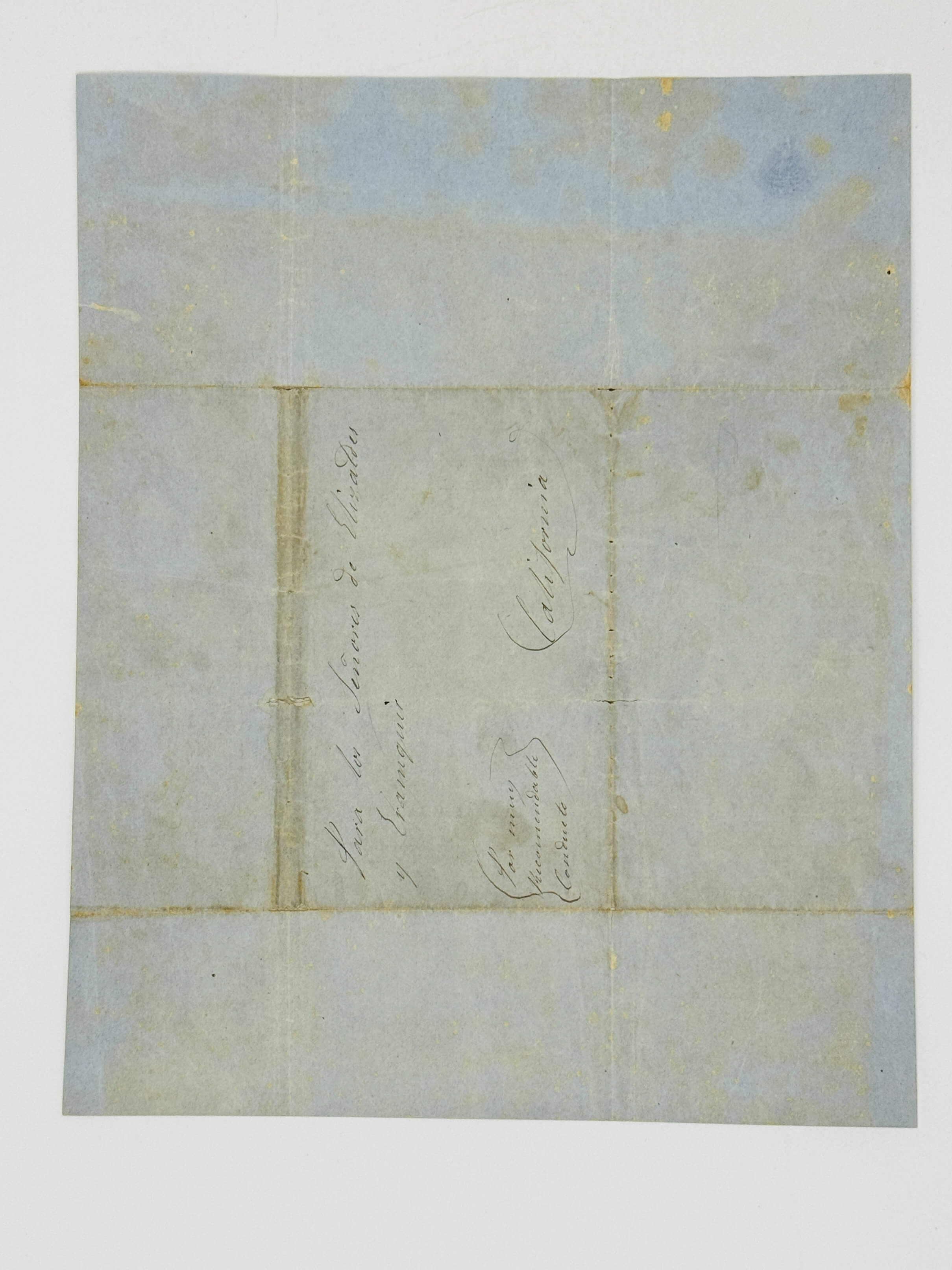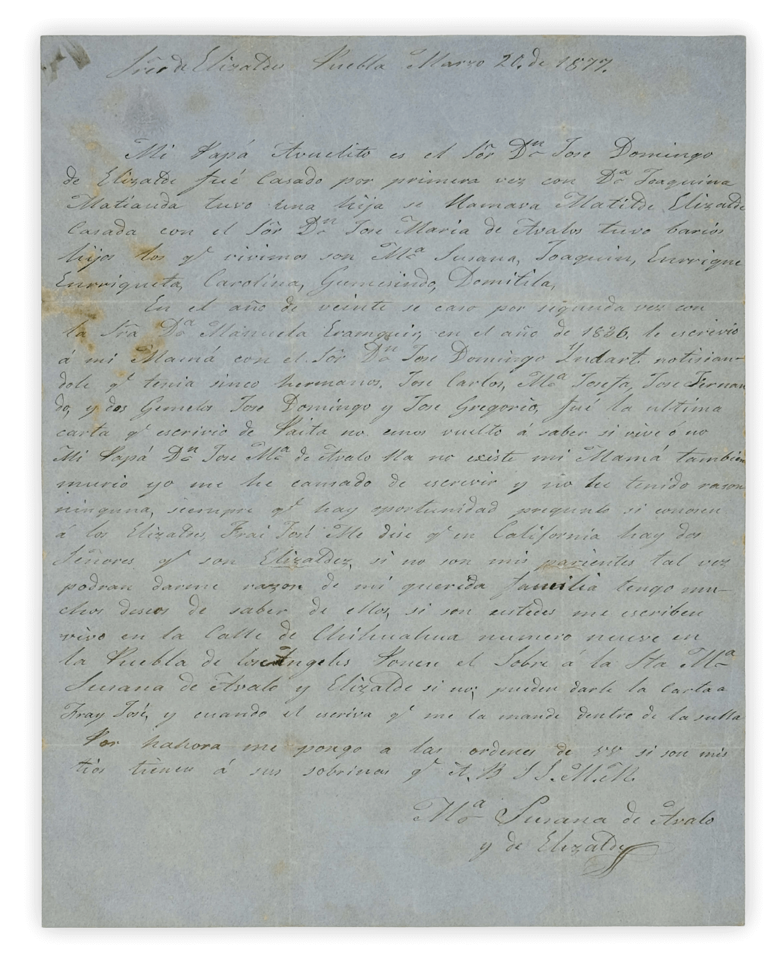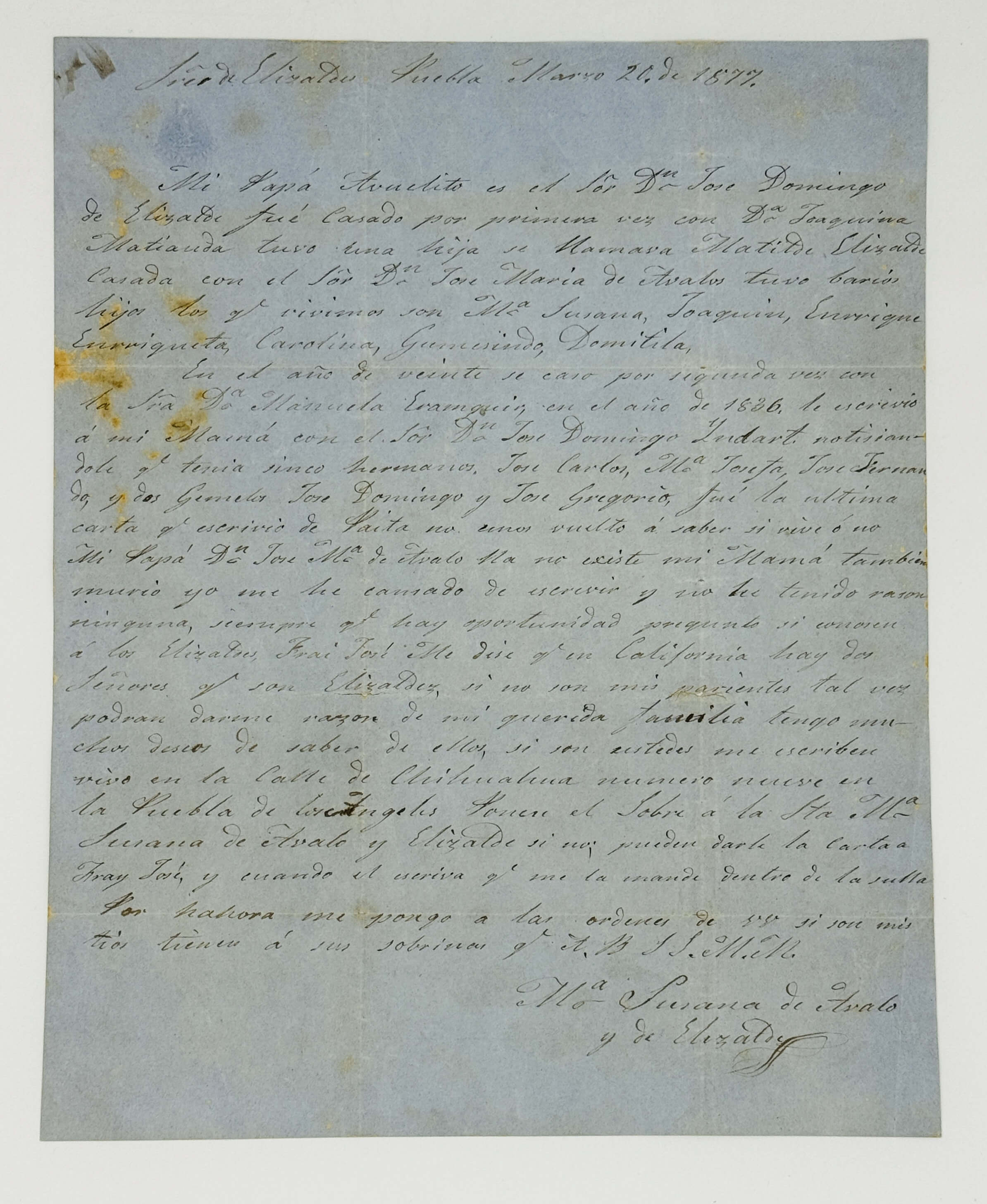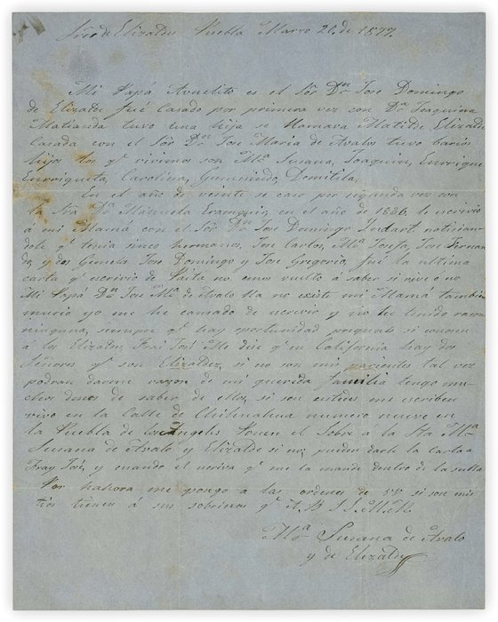 The author, Susana de Ávalos y Elizalde (ca. 1821–1901), addresses the letter to possible relatives with the surname Elizalde and Erasquin in California. She outlines her family lineage, noting that her grandfather, José Domingo de Elizalde (ca. 1800–1840), married twice and, in 1836, reported having six children from his second marriage (Manuela Erasquin Salazar (ca. 1824-)) in Paita, Peru. Having learned through an intermediary that two Elizaldes were living in California, Susana asks them to respond in order to ascertain if the families might be related.