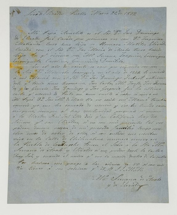 Excerpts from the letter (in English translation): “He was married for the first time to Doña Joaquina Matiauda. He had a daughter named Matilda Elizalde, who married Señor Doctor José María de Ávalos. They had several children; those of us who are still living are Susana, Joaquín, Enrique, Henriqueta, Carolina, Gumesindo and Domitilia. In the year twenty he married for the second time to Doña Doctor Manuela Erauquin. In the year 1836 he wrote to my mother through Señor Don José Domingo Jerdart, informing her that she had five siblings... This was the last letter he wrote from Paita, and since then we have not known whether he is alive or dead. My father, Doctor José María de Ávalos, no longer lives. My mother has also died. I have grown tired of writing and have received no reply at all.”