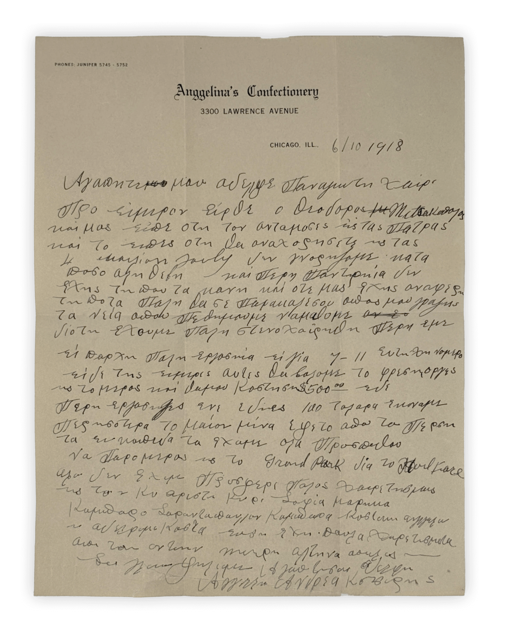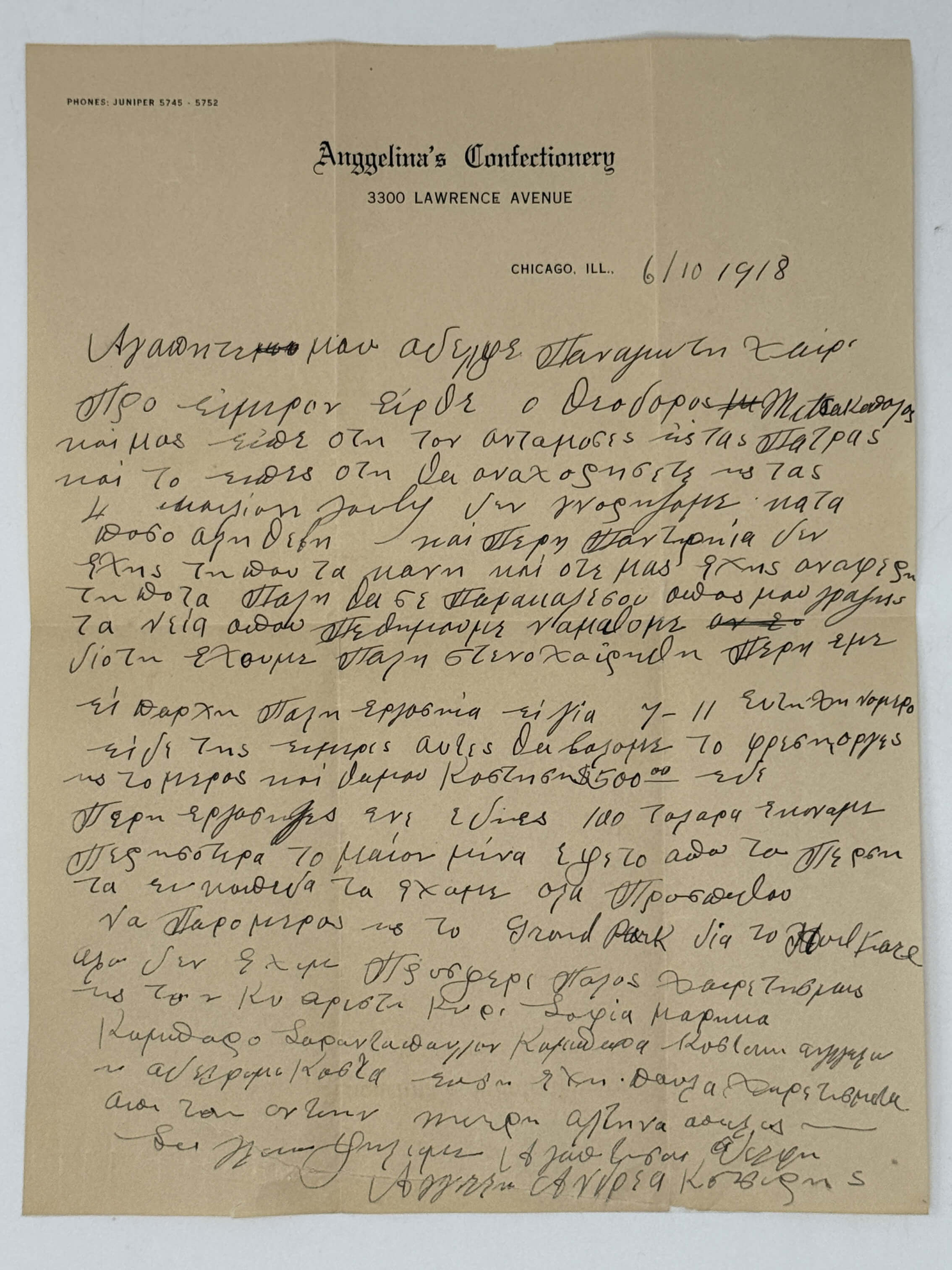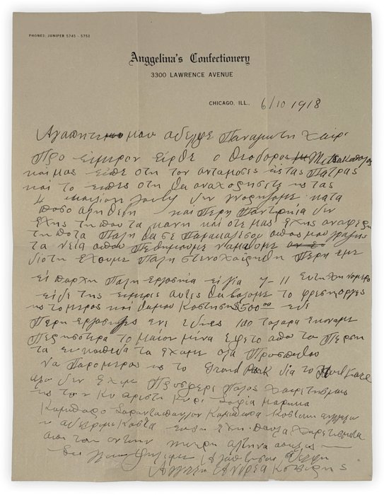 Text in Greek. Quarto (ca. 27,5 x 21 cm or 10 ¾ x 8 ¼ in). 1 page. Brown ink on beige stationary paper on the blank of “Angelina Confectionery.” Folds, the bottom piece of the letter is restored (strengthened with the Japanese paper), but otherwise a very good letter written in a legible hand.