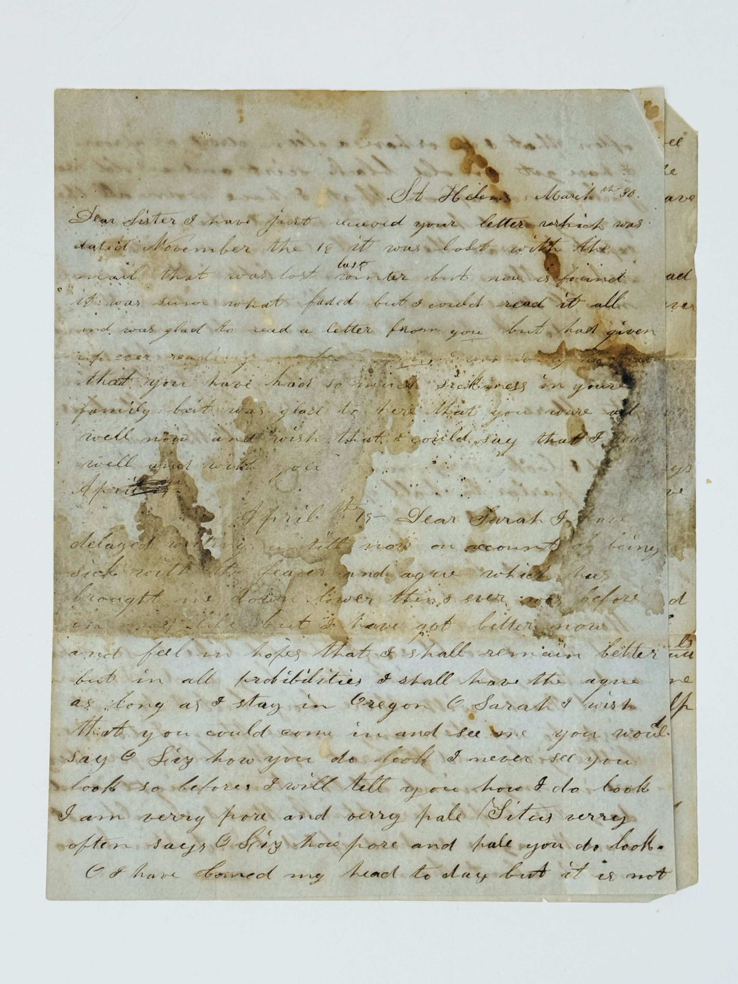In the letter to her sister Sarah Hitchcock (ca. 1829-1900) of Vermont, the author describes her struggles for survival, extreme poverty, and harshness of life in Oregon Terrtiory. Elizabeth reports a prolonged fever that has left her “lower than ever before,” and repeatedly contrasts her condition with the comforts of home. Especially interesting is the author’s depiction of typical life in St. Helens, writing “we live worse than pigs do,” with flooring “as black as dirt can make it” and a dwelling scarcely fit for human habitation. She also details an extreme scarcity of food, noting months without a single drop of milk, only eight pounds of butter since the previous November, and a diet reduced to bare staples (potatoes, meat, bread, tea, and coffee). In the rest of the letter, the author talks about the purchase of a cow, the unpaid debts, and her wish to return home as soon as possible.