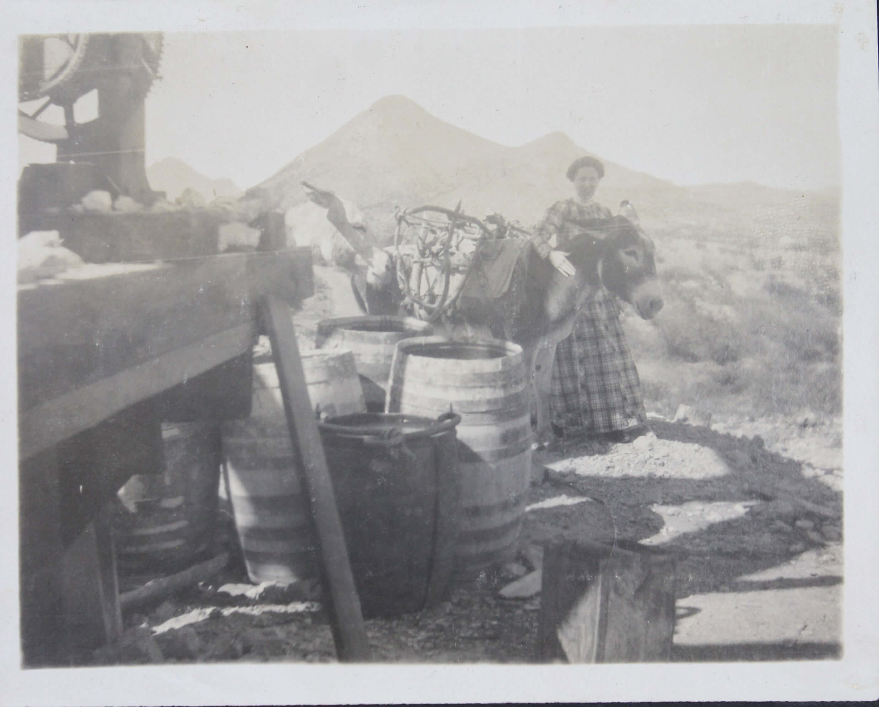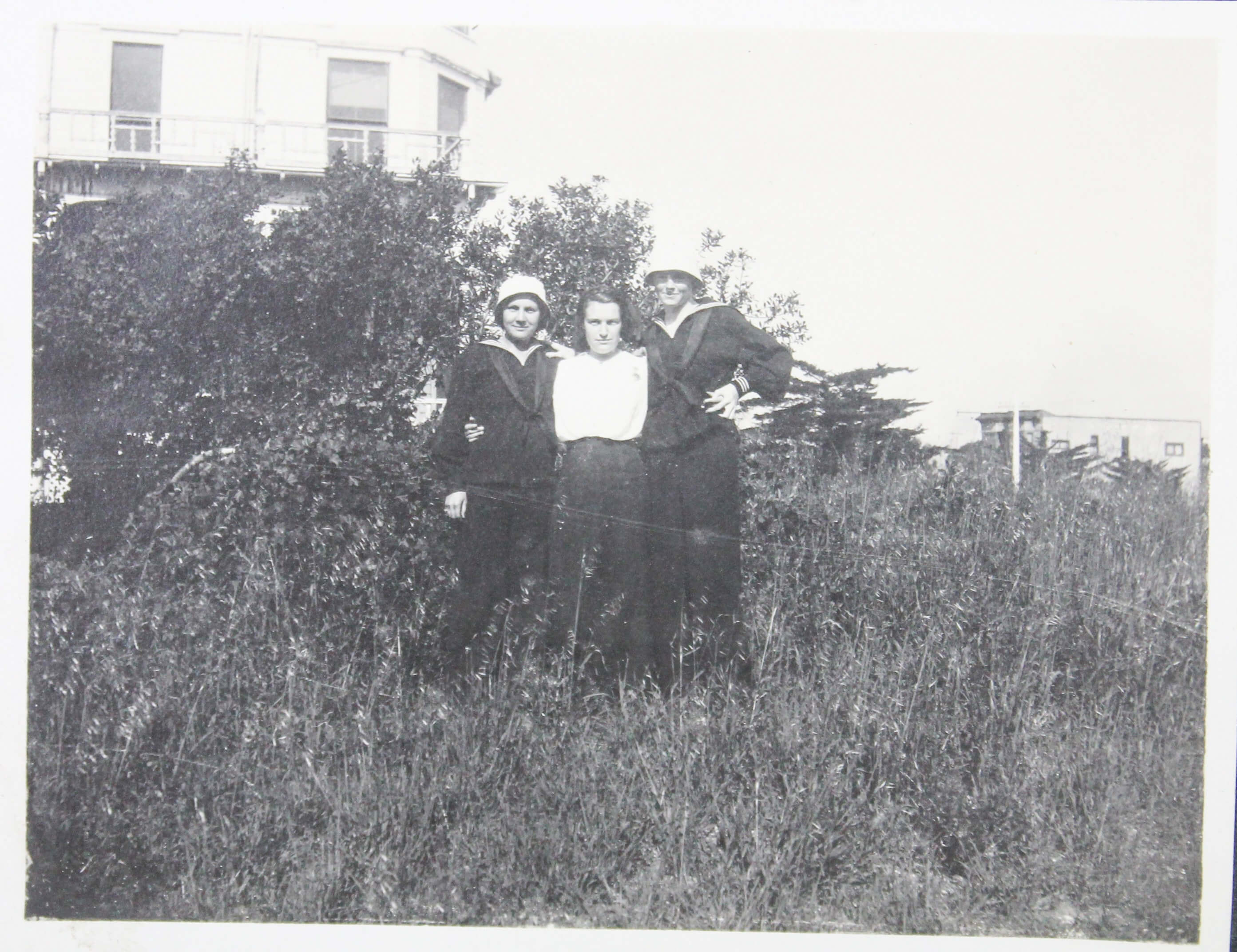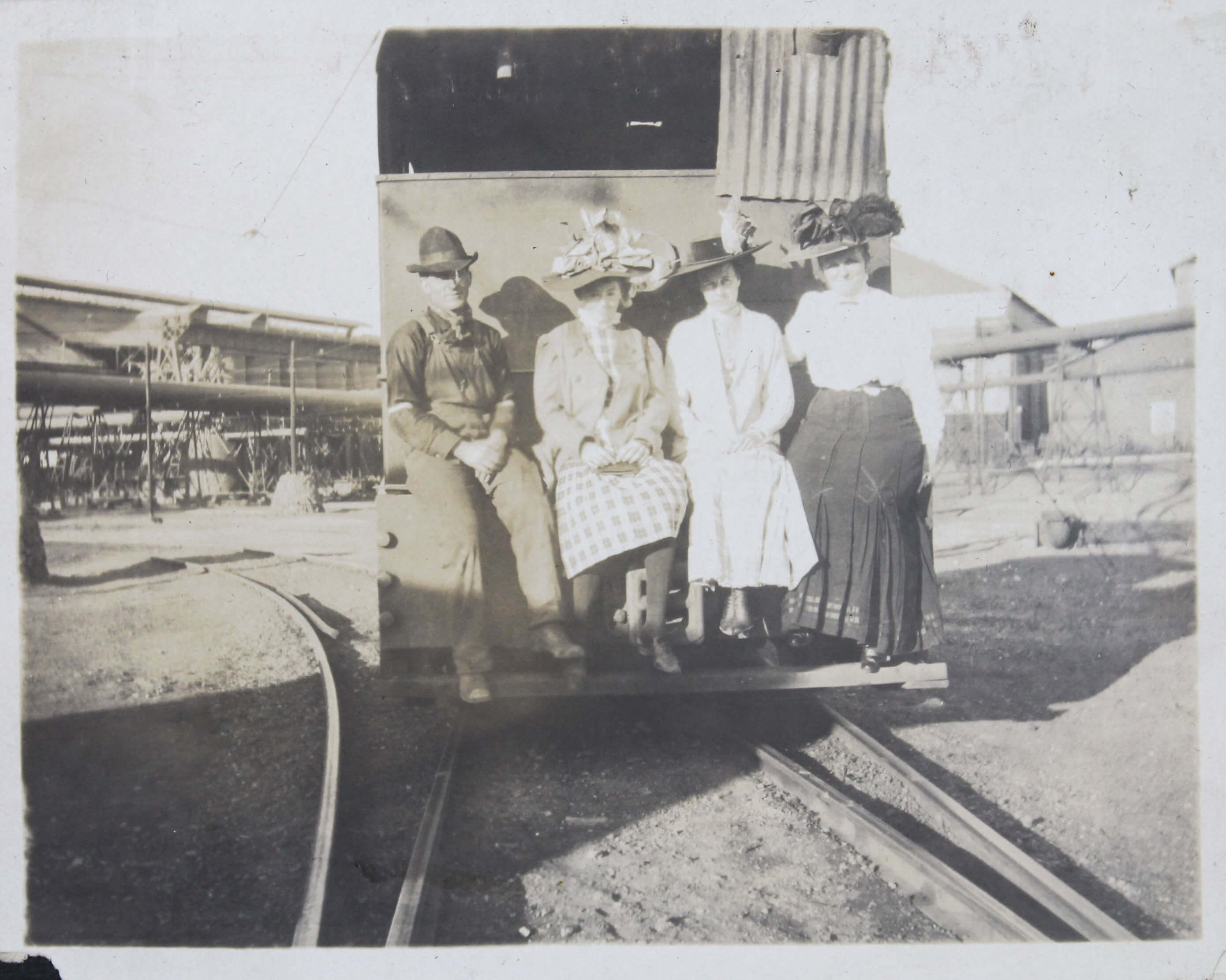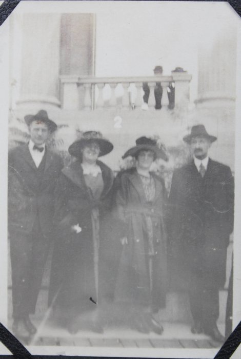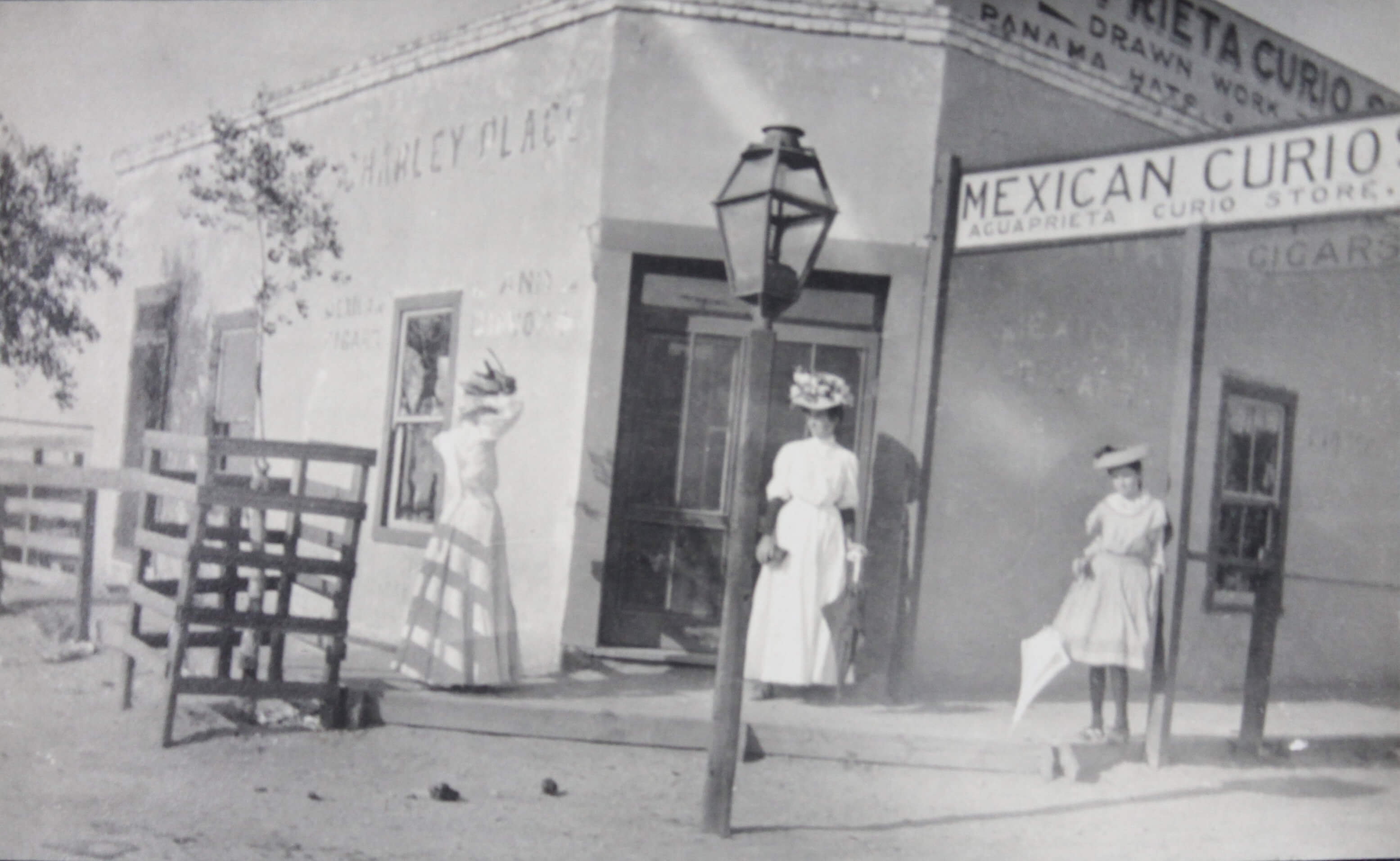 Other photographs in the album include a group portrait of well-dressed individuals posing in front of the now-demolished White House East Wing in Washington, D.C., an image of “James E. Snow” in a dormitory room aboard the USS San Diego, as well as a group portrait of the compiler and her companions in Agua Prieta, Mexico (with clearly visible signs “Aguaprieta Curio Store,” “Cigars,” and “Harley Place”).