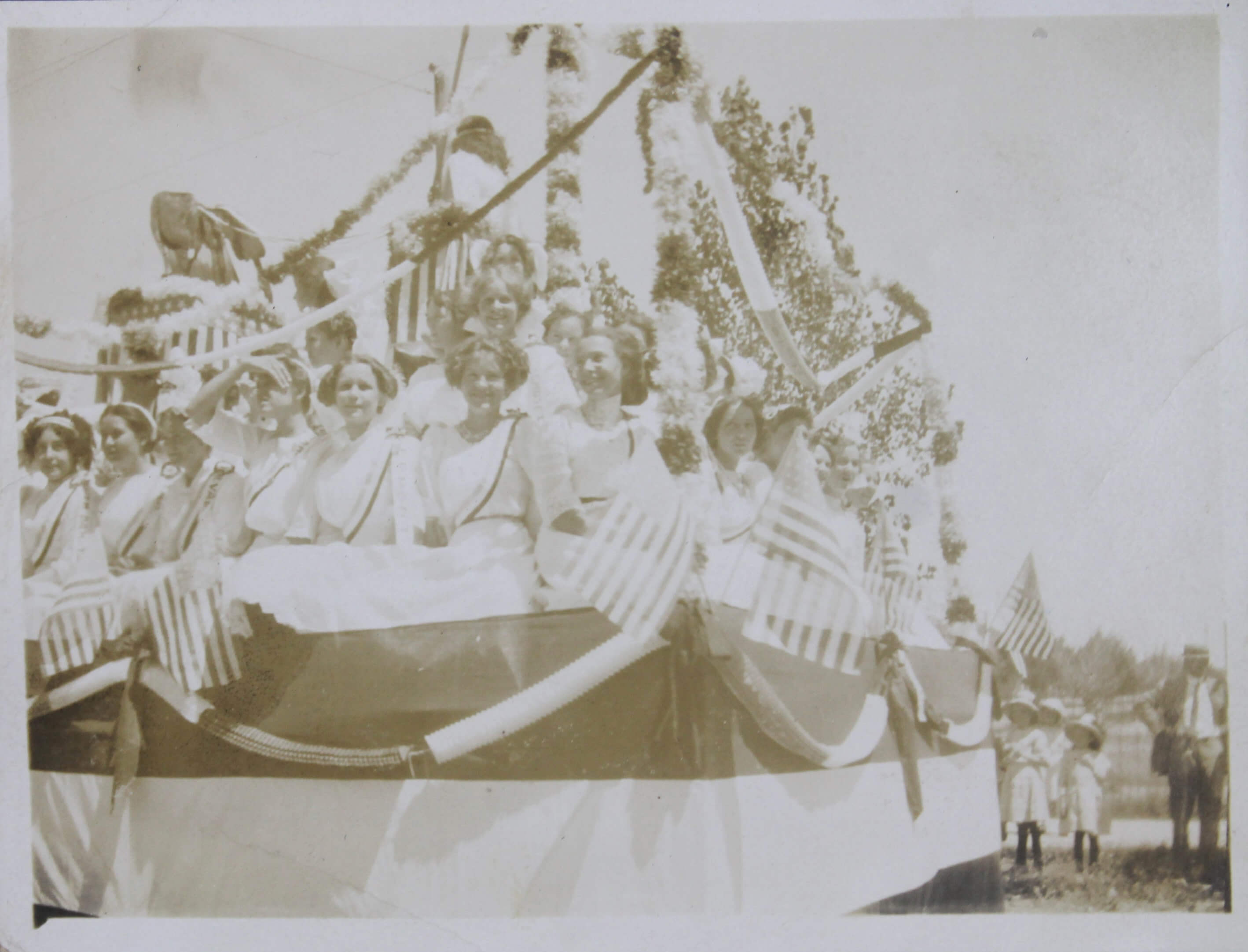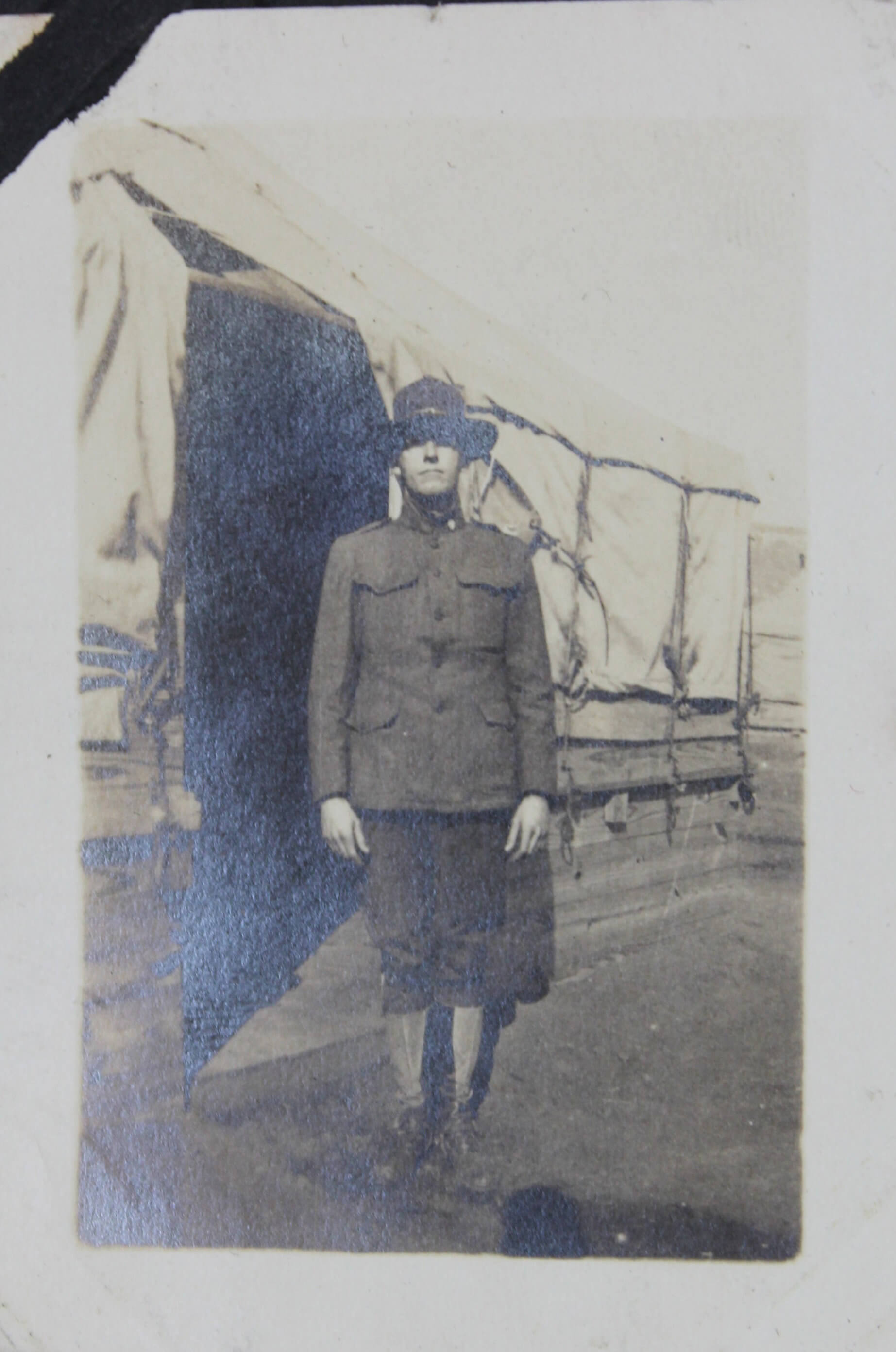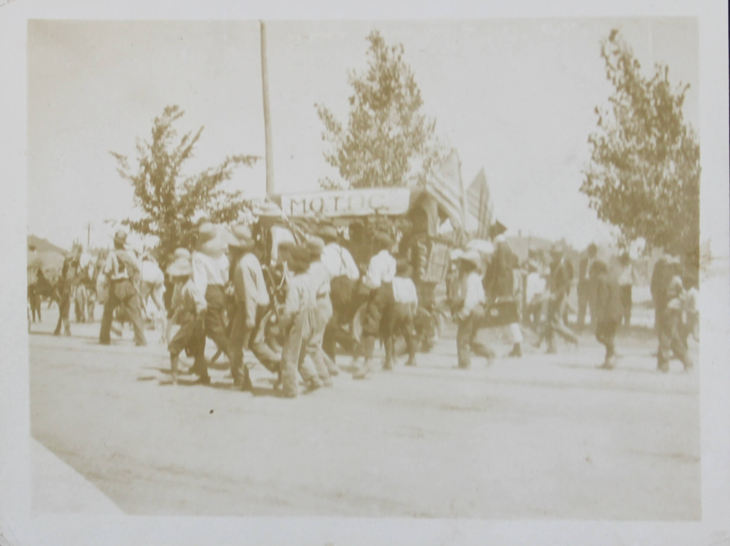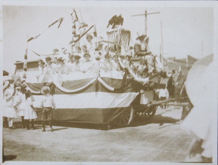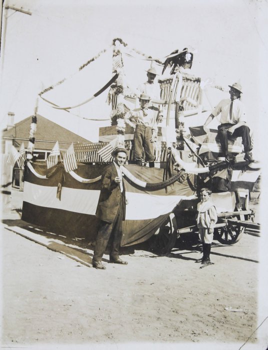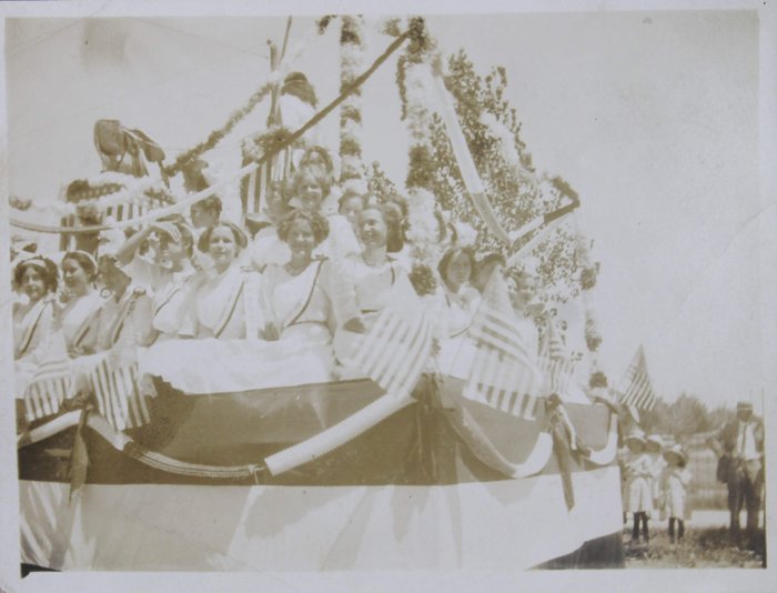 The album features over 300 lively vernacular photographs, mostly depicting the compiler’s friends and relatives during and after the pandemic cheerfully posing outdoors, at home, and in river, riding bicycles, feeding chickens, watering plants, and attending a local rodeo. Several candid urban scenes depict a lively parade celebrating what appears to be the Fourth of July, with costumed performers on floats marching through the streets. Especially interesting is a series of photographs of “J.S.” at the newly opened Camp Funston, Kansas, in 1917. Established during World War I, Camp Funston served as a major military training camp for recruits and National Guard Units. Only a year after these photos were taken, the Camp became one of the earliest sites affected by the 1918 influenza pandemic. The rare images show “J.S.” in military uniform posing with fellow soldiers near the barracks. The collection also includes at least five early photographs from Wautoma, Wisconsin, showing the compiler and her friends in front of the now-demolished Methodist Church.
