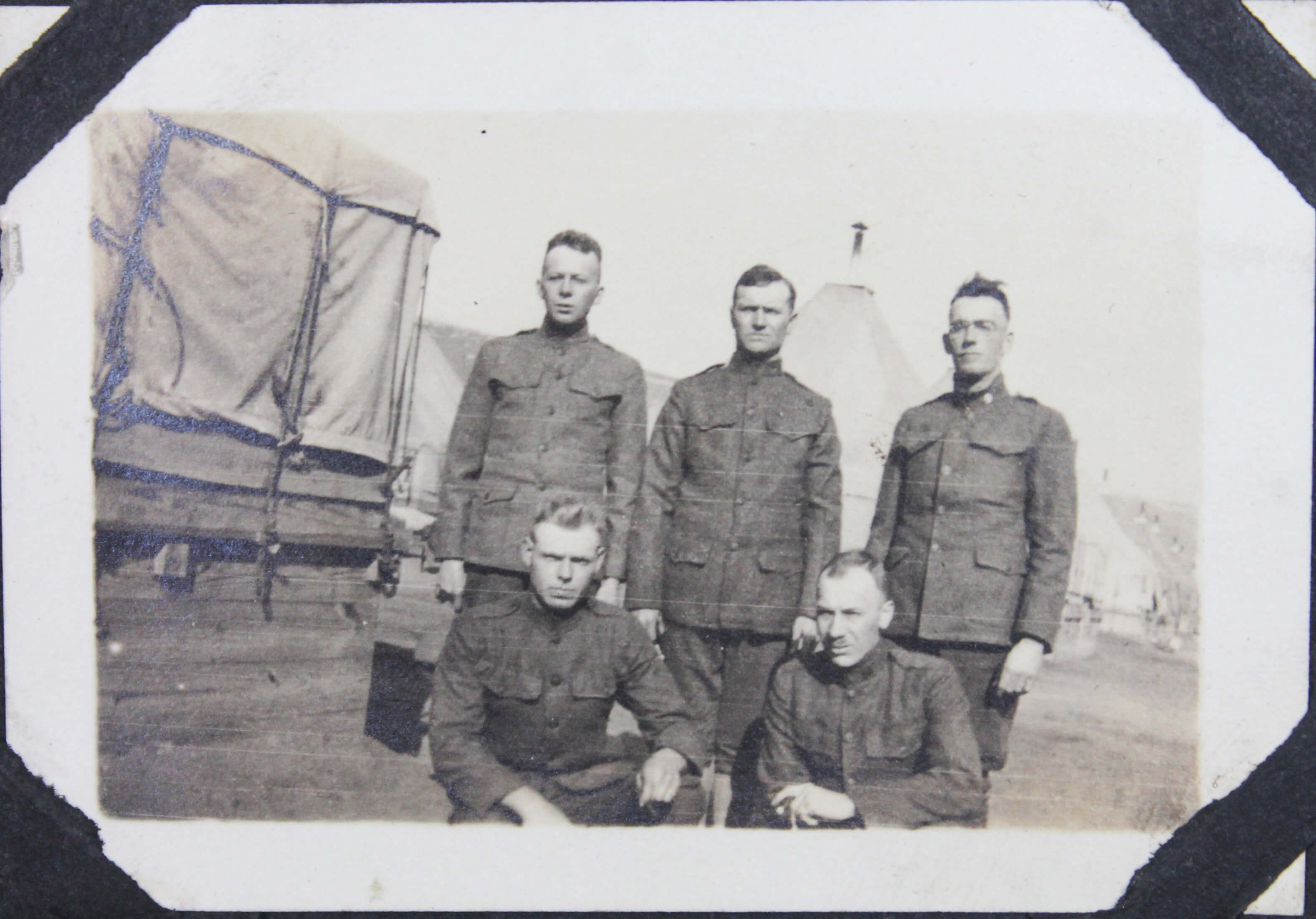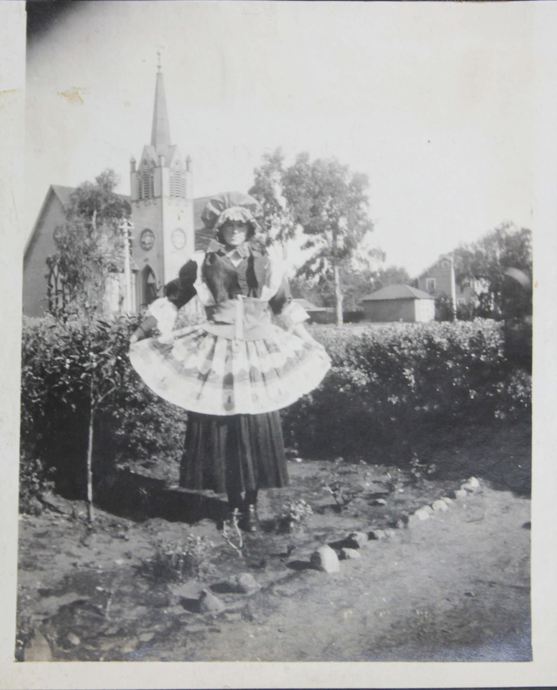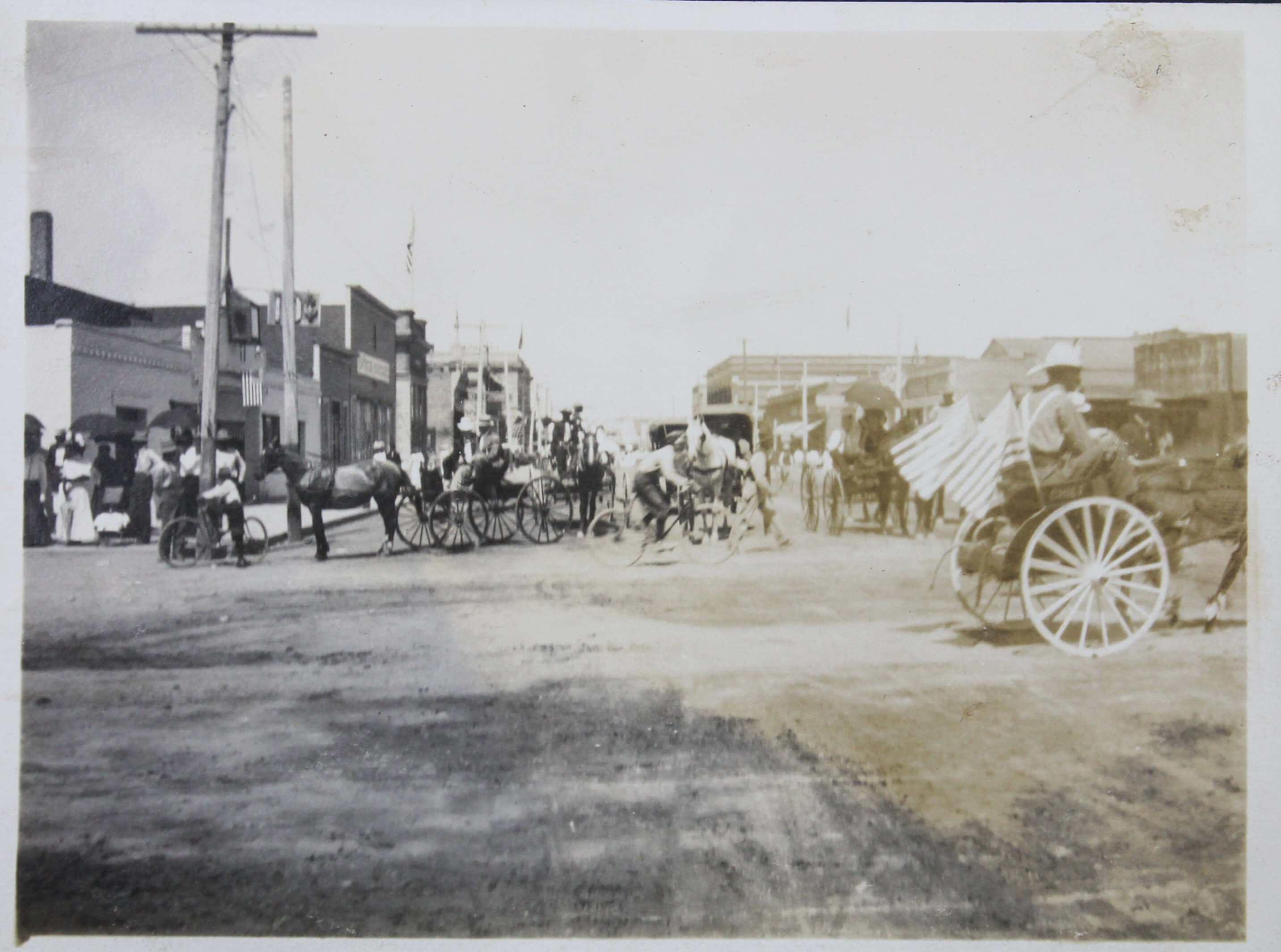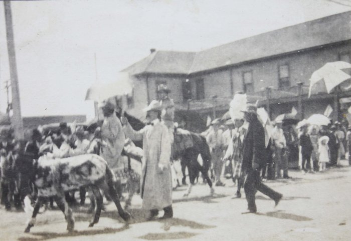 The album features over 300 lively vernacular photographs, mostly depicting the compiler’s friends and relatives during and after the pandemic cheerfully posing outdoors, at home, and in river, riding bicycles, feeding chickens, watering plants, and attending a local rodeo. Several candid urban scenes depict a lively parade celebrating what appears to be the Fourth of July, with costumed performers on floats marching through the streets. Especially interesting is a series of photographs of “J.S.” at the newly opened Camp Funston, Kansas, in 1917. Established during World War I, Camp Funston served as a major military training camp for recruits and National Guard Units. Only a year after these photos were taken, the Camp became one of the earliest sites affected by the 1918 influenza pandemic. The rare images show “J.S.” in military uniform posing with fellow soldiers near the barracks. The collection also includes at least five early photographs from Wautoma, Wisconsin, showing the compiler and her friends in front of the now-demolished Methodist Church.