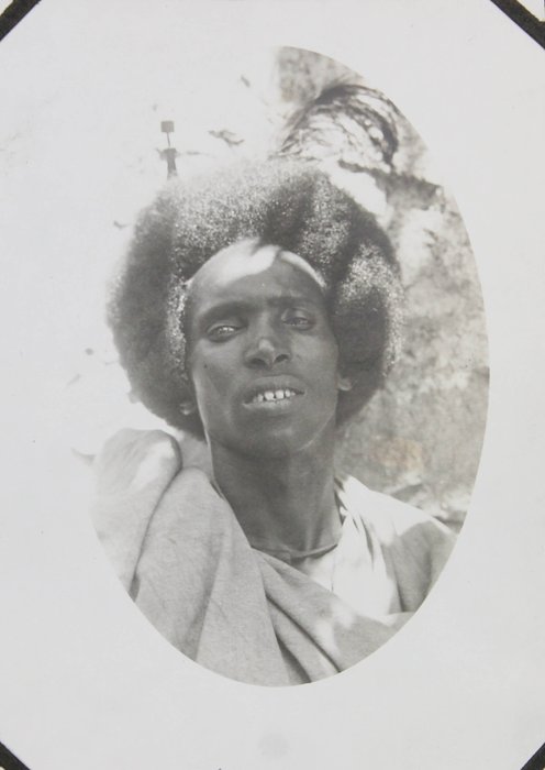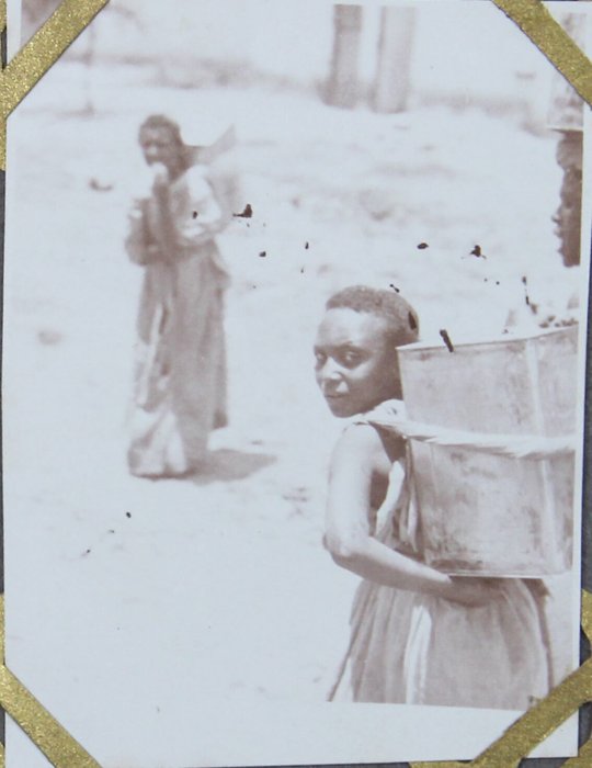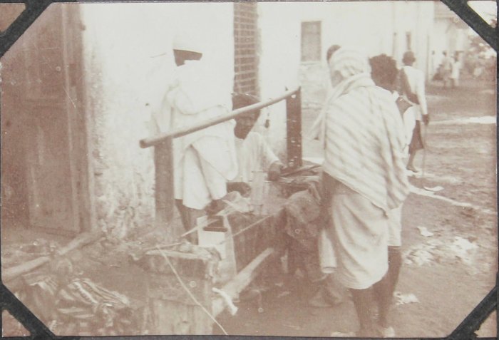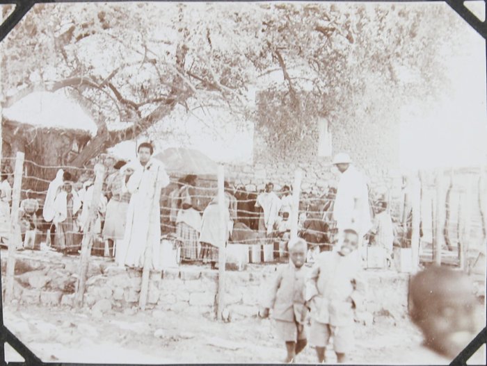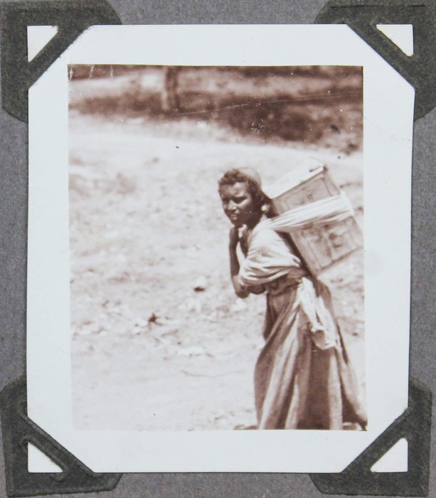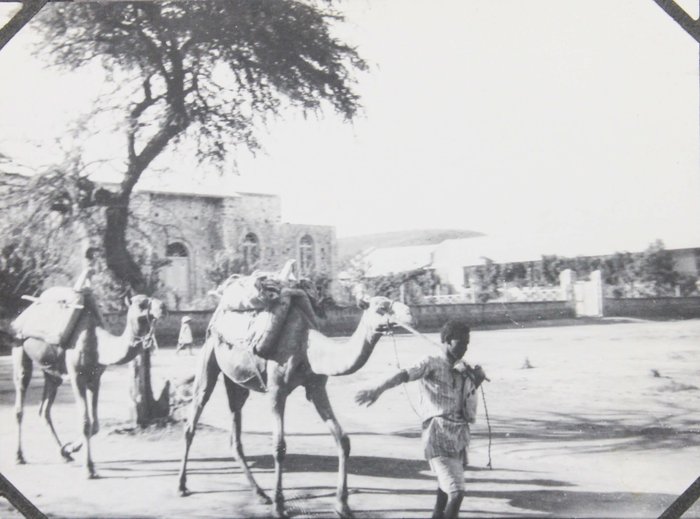 The collection comprises one hundred and four original gelatin silver photographs and real photo postcards, mostly illustrating pre-colonial Dire Dawa. About twenty-five well-executed photos depict the Dire Dawa train station with an approaching locomotive & railway building (with a French sign), St. Michael Church, Dire Dawa Palace, the zoo, a public fountain, a local café, street views, and what appears to be the hotel where the compiler stayed. Over twenty candid urban scenes, some close-up, vividly portray Ethiopian locals in traditional dress transporting water and goods, posing for photographs, dining at a café, busily browsing market stalls, and riding camels and donkeys. The other photographs from Dire Dawa mainly show the compiler and his colleagues in local attire, in white uniform, with zoo animals, or exploring the surrounding wilderness.