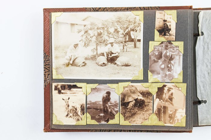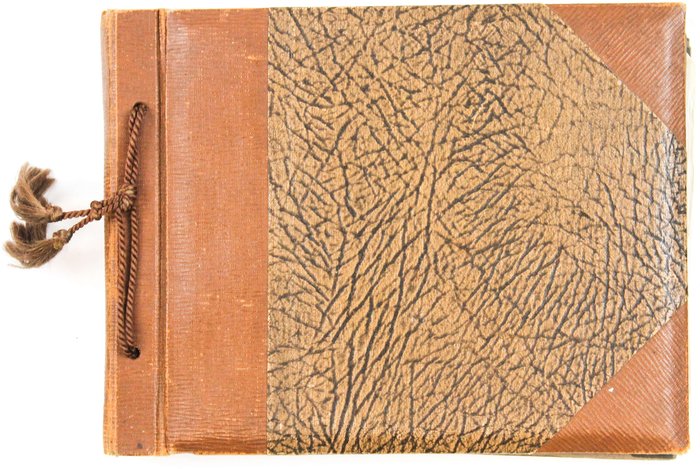 Oblong Octavo album (ca.15,8x20,6 cm). 25 card stock leaves (four blank). With 104 mounted original gelatin silver photographs (including ca. five real life photo postcards) from ca. 9x13 cm (3 ½ x 5 in) to 2,5x3,7 cm (1 x 1 ½ in). Most photos with French captions on the verso, several photos dated. Period brown cloth fastened with a string; marbled endpapers; eight tracing papers preserved; with period gift inscription on the first page: “Album tante Louise / Son neveu L. Roussel” Mild silvering, one photo with a small piece detached at the lower right corner, but overall a very good album with strong, interesting photos.