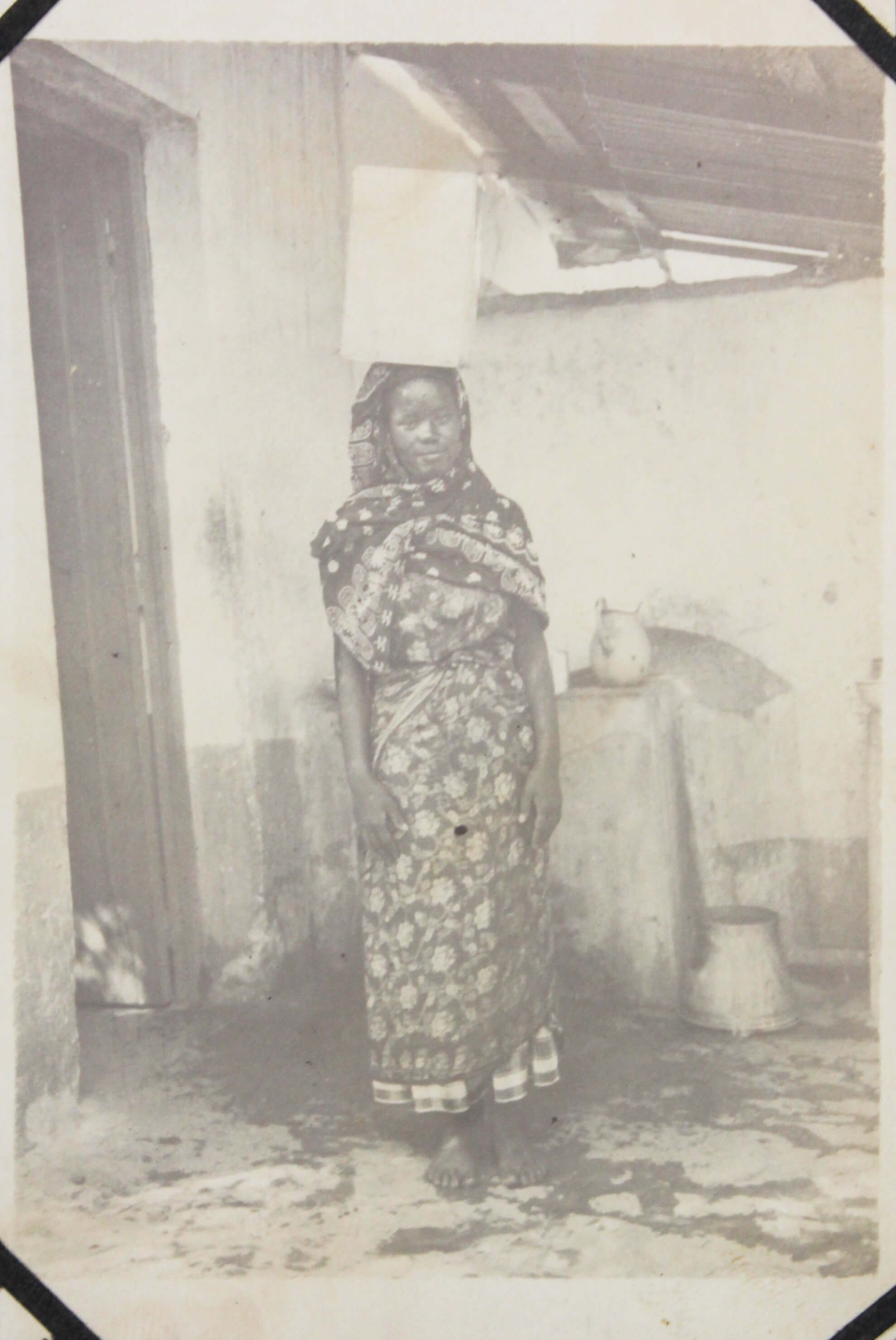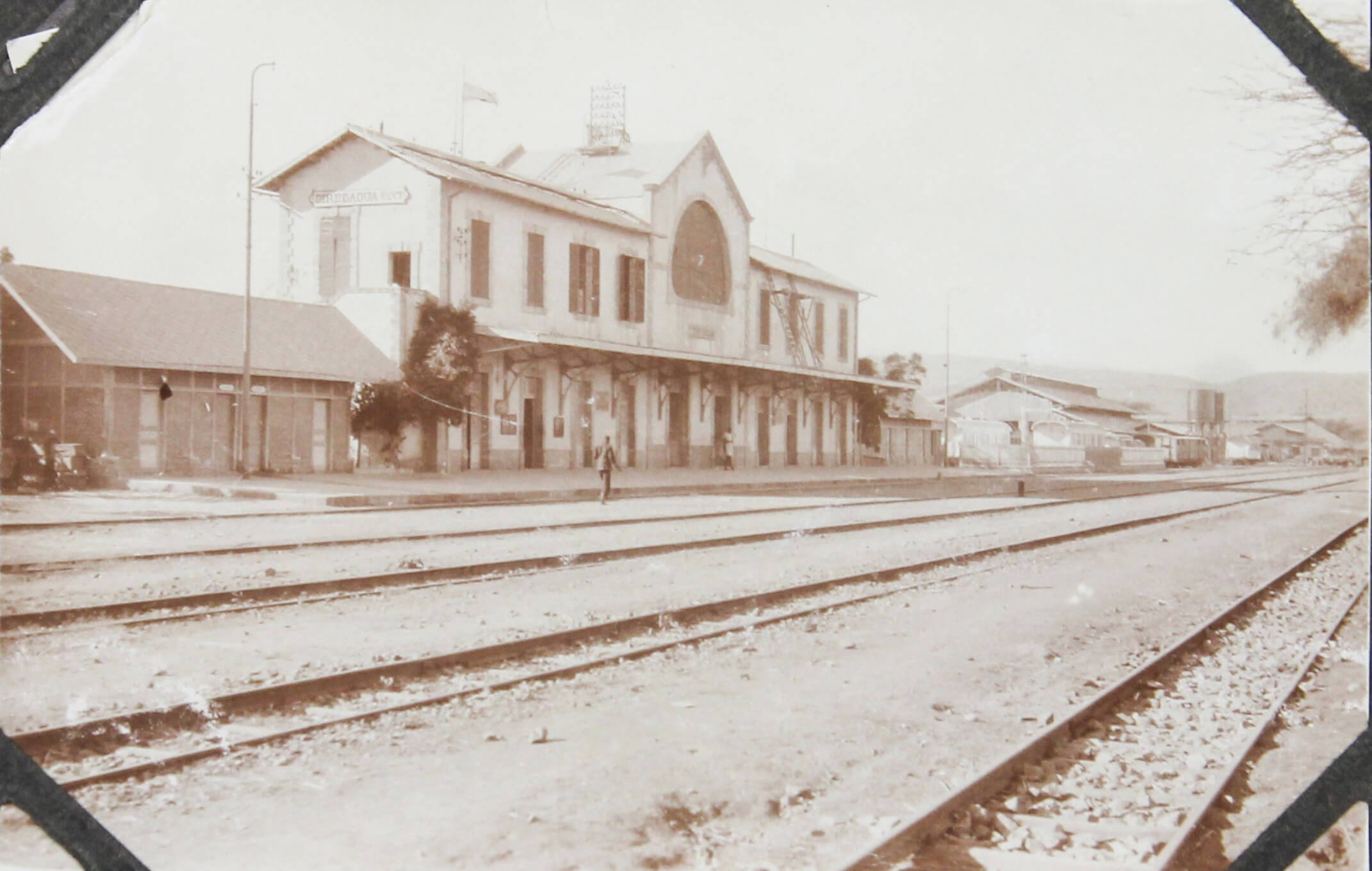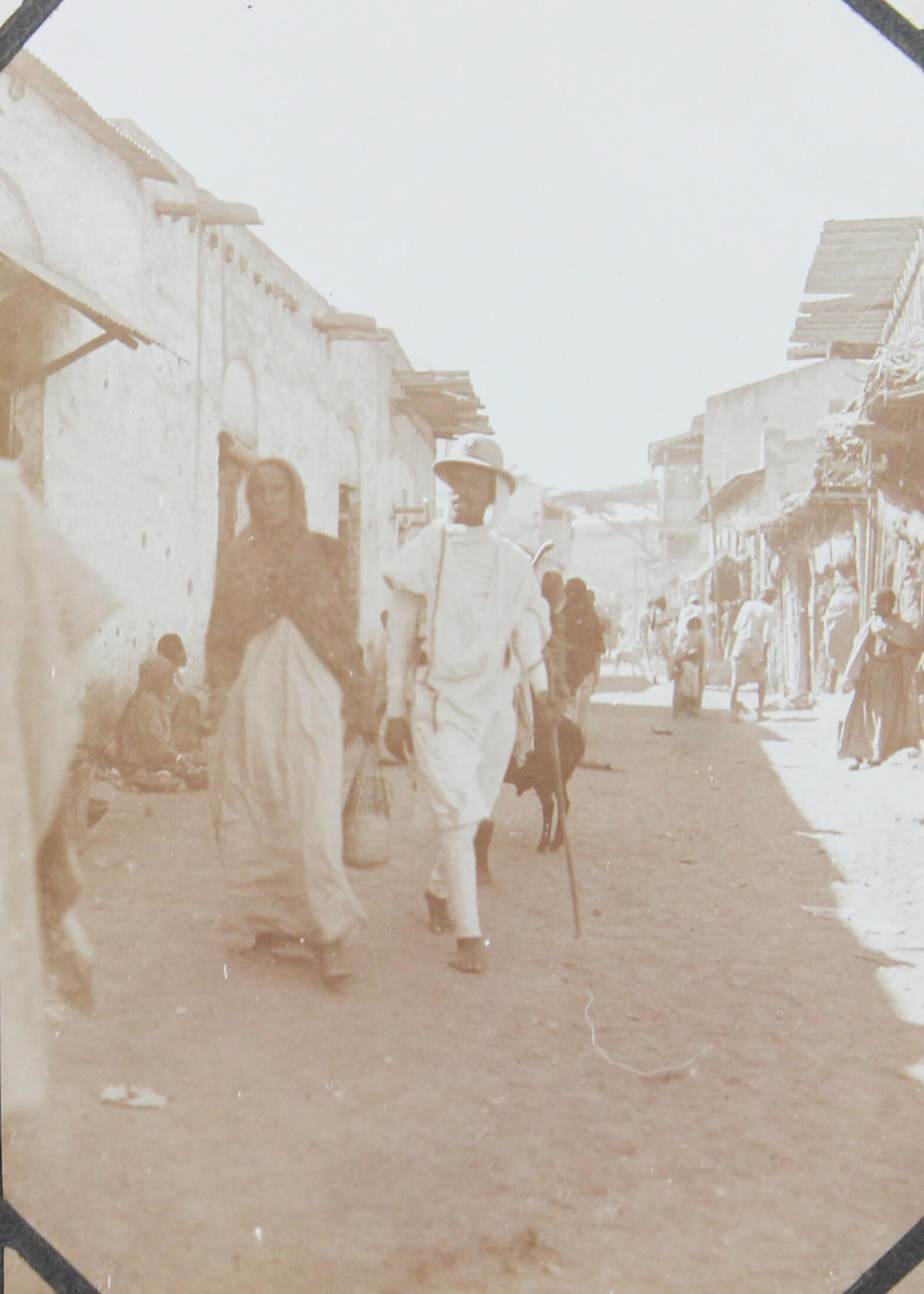 The collection comprises one hundred and four original gelatin silver photographs and real photo postcards, mostly illustrating pre-colonial Dire Dawa. About twenty-five well-executed photos depict the Dire Dawa train station with an approaching locomotive & railway building (with a French sign), St. Michael Church, Dire Dawa Palace, the zoo, a public fountain, a local café, street views, and what appears to be the hotel where the compiler stayed. Over twenty candid urban scenes, some close-up, vividly portray Ethiopian locals in traditional dress transporting water and goods, posing for photographs, dining at a café, busily browsing market stalls, and riding camels and donkeys. The other photographs from Dire Dawa mainly show the compiler and his colleagues in local attire, in white uniform, with zoo animals, or exploring the surrounding wilderness.