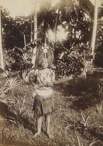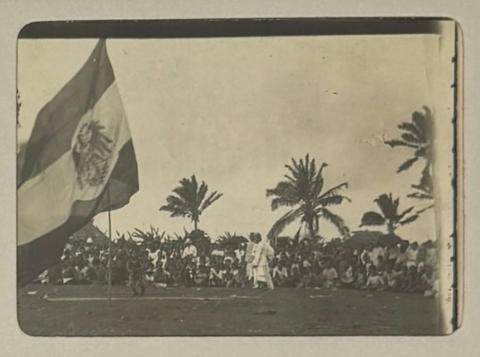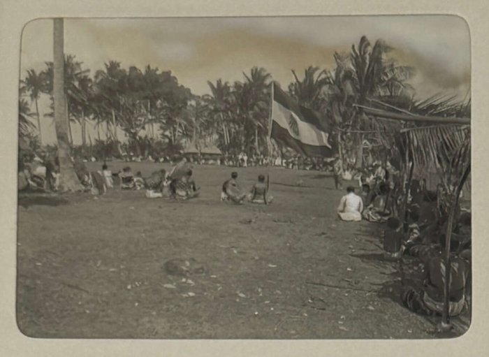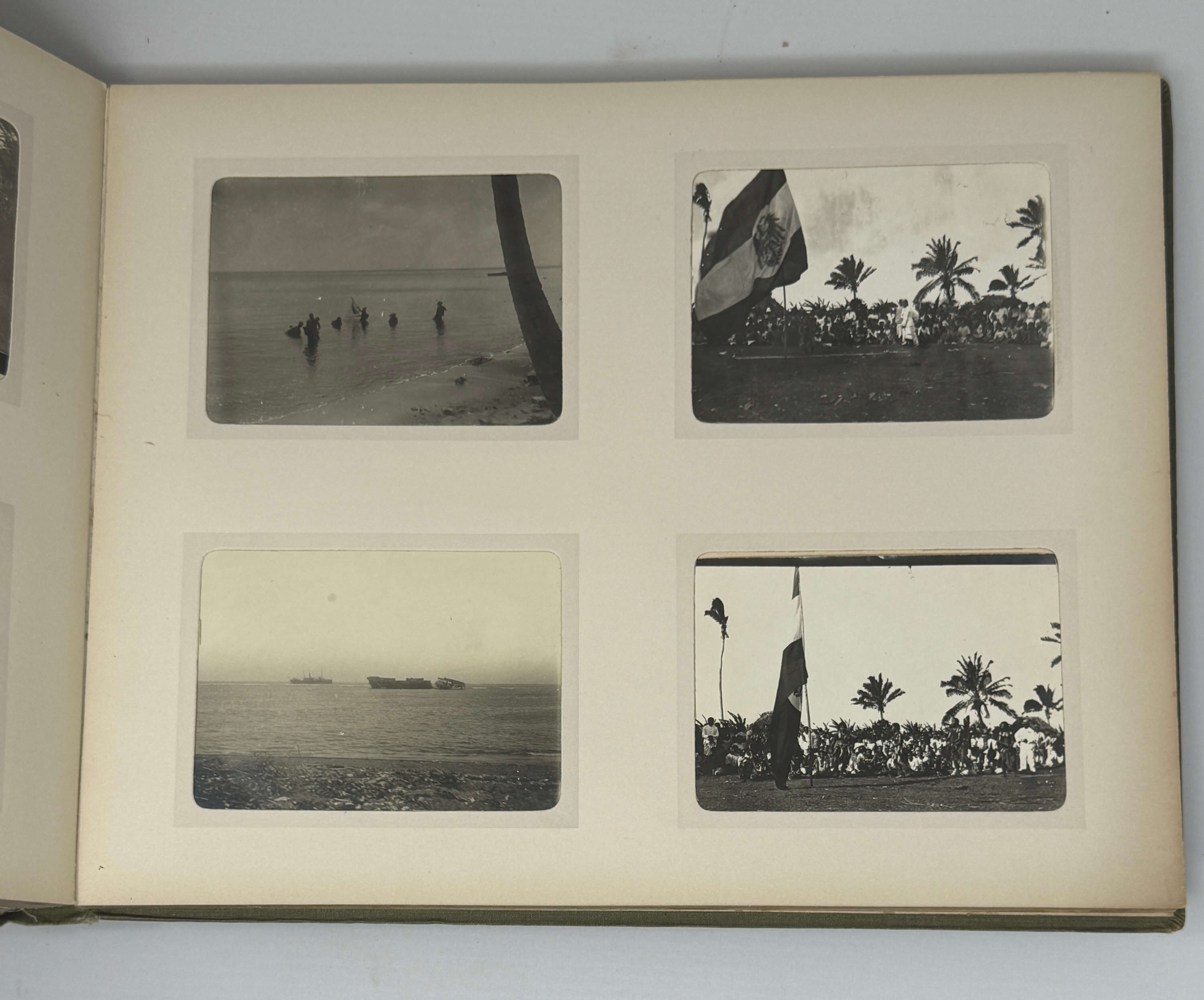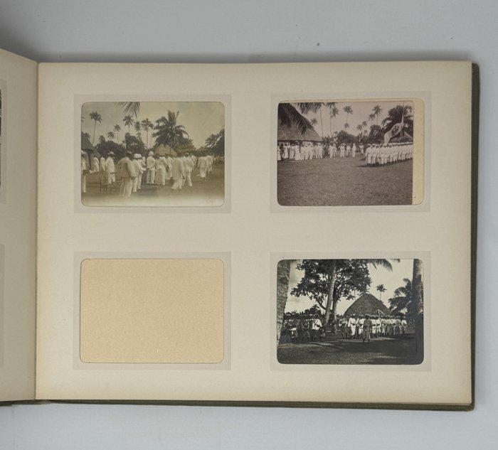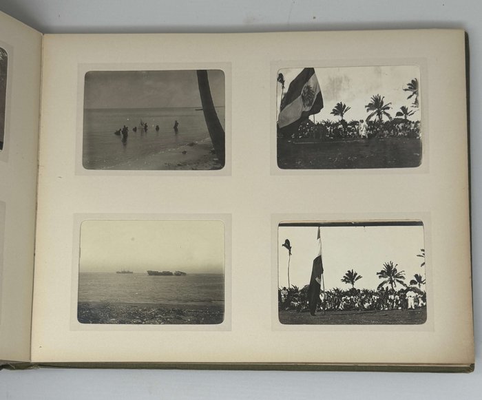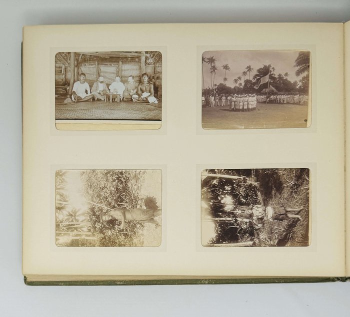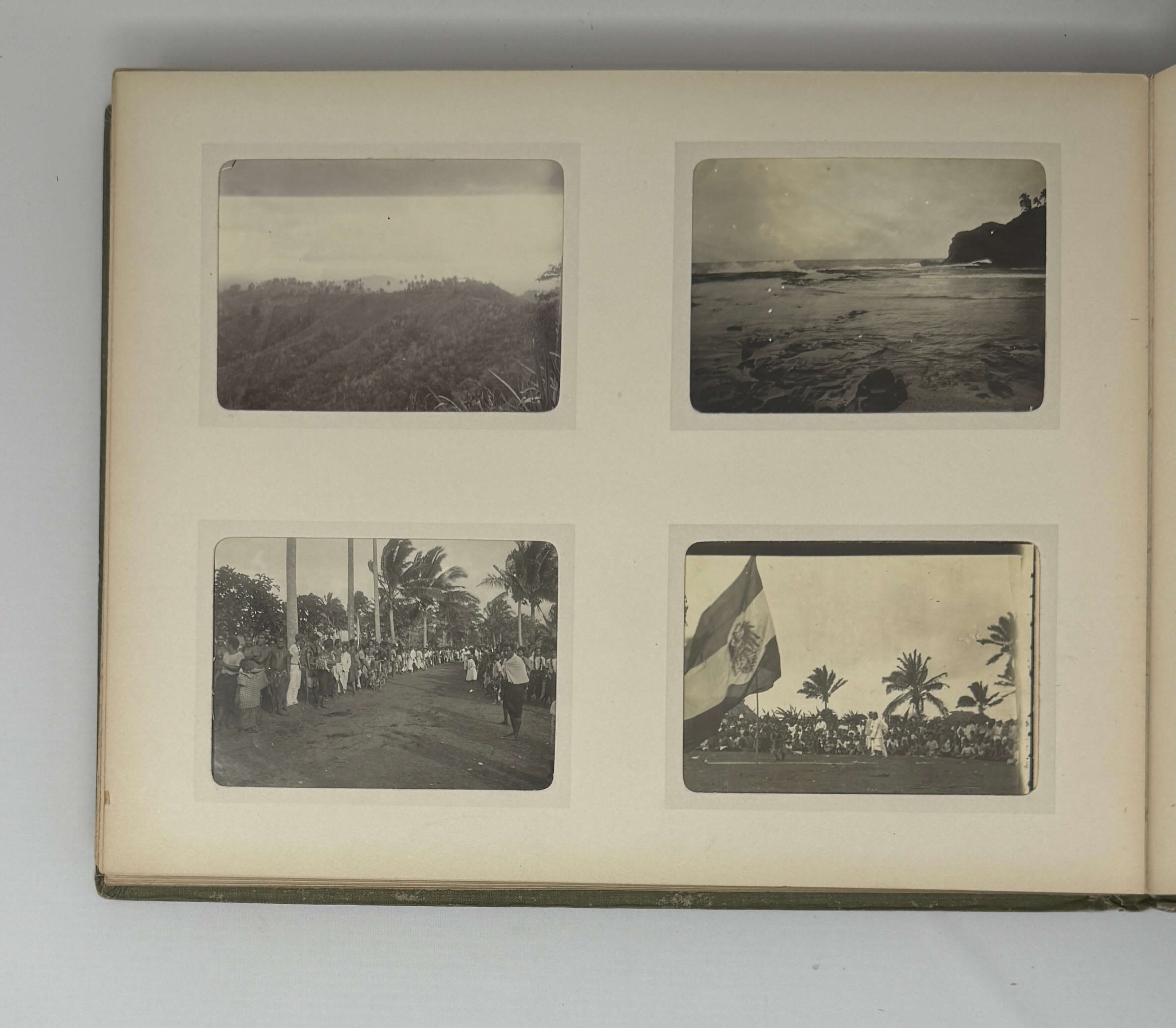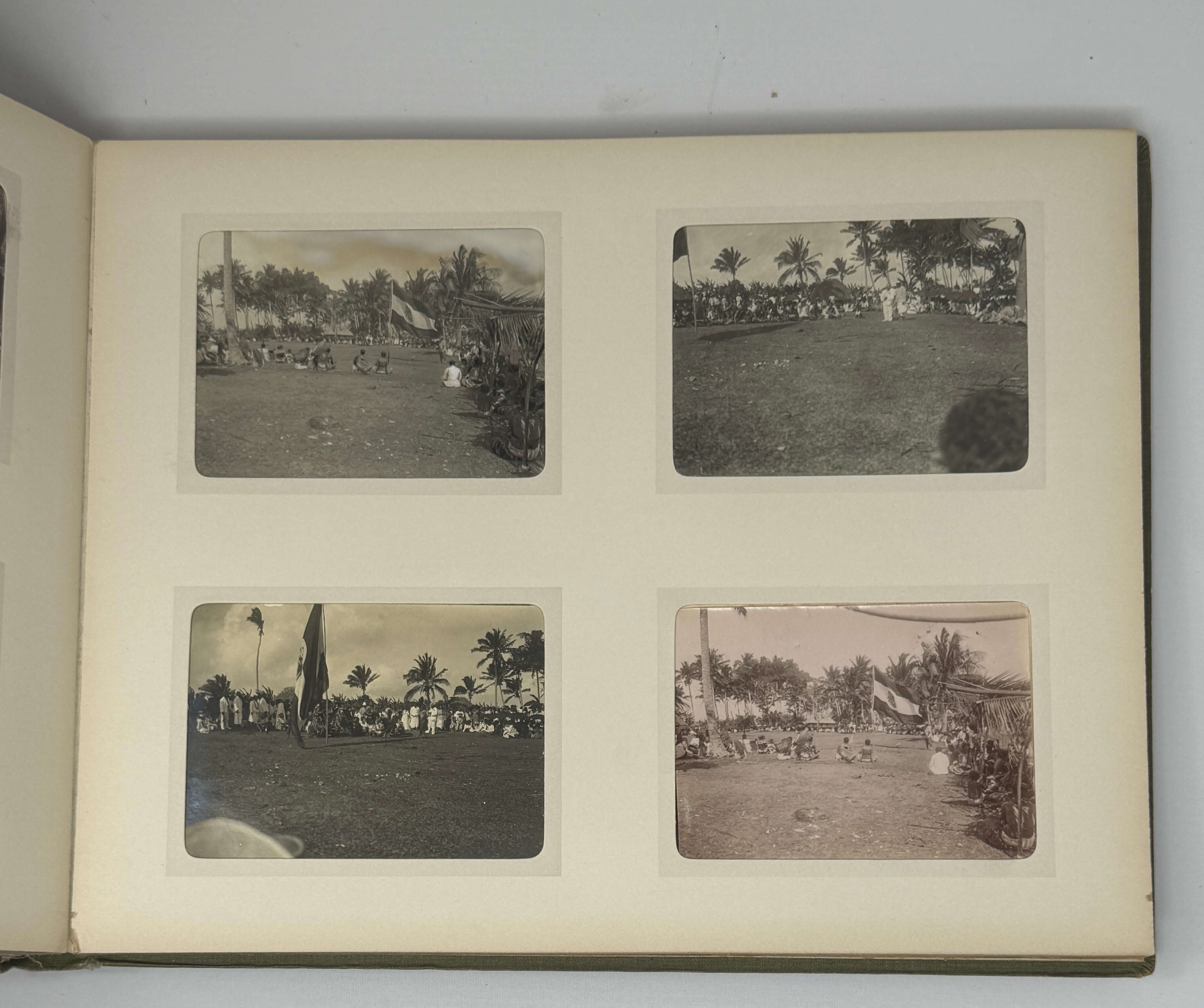 Very interesting are over sixty original photos and a printed postcard of German Samoa. About seventeen photographs document a public ceremony of hoisting a German Imperial flag at an open space (likely, in the colonial capital, Apia), with government officials, colonial troops and a crowd of spectators. Two scenes with colonial residents feature Wilhelm Solf, the first Governor of German Samoa (in office: 1900-1911), wearing a white uniform and peaked cap. Two photos portray an elderly Samoan chief - most likely, Mata’afa Josefo (ca. 1832-1912, a Paramount Chief of German Samoa), posing with a colonial resident in front of a German Imperial flag. There is also a view of the wreck of SMS “Adler” in Apia harbour, which was destroyed, alongside several German and U.S. warships, during the 1889 Apia cyclone. Other photos show Samoan rivers, coastal views, portraits of Samoans in traditional costumes, families, children, German residents, &c. The printed postcard is a view of “Samoa Inseln – Apia, nach Süden zu.”