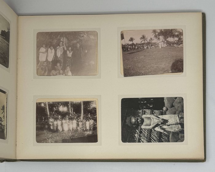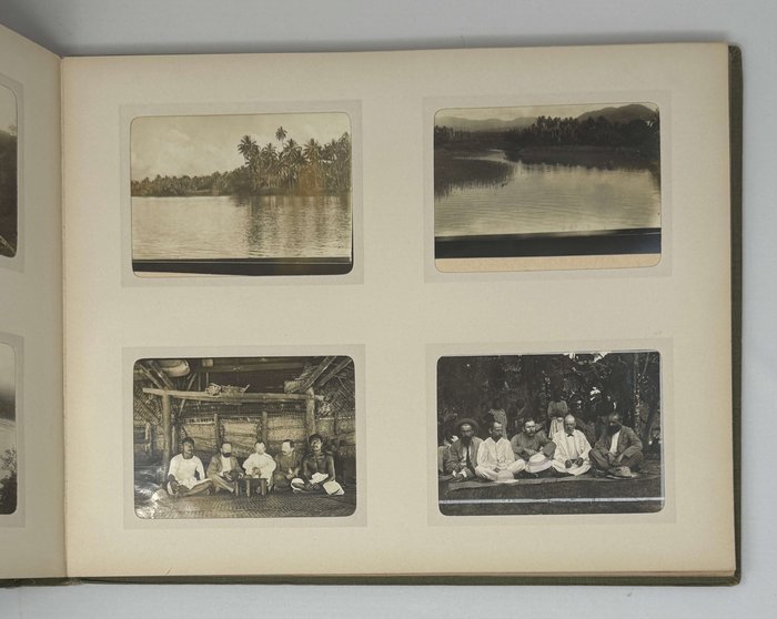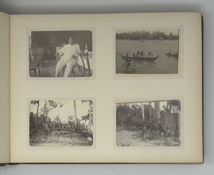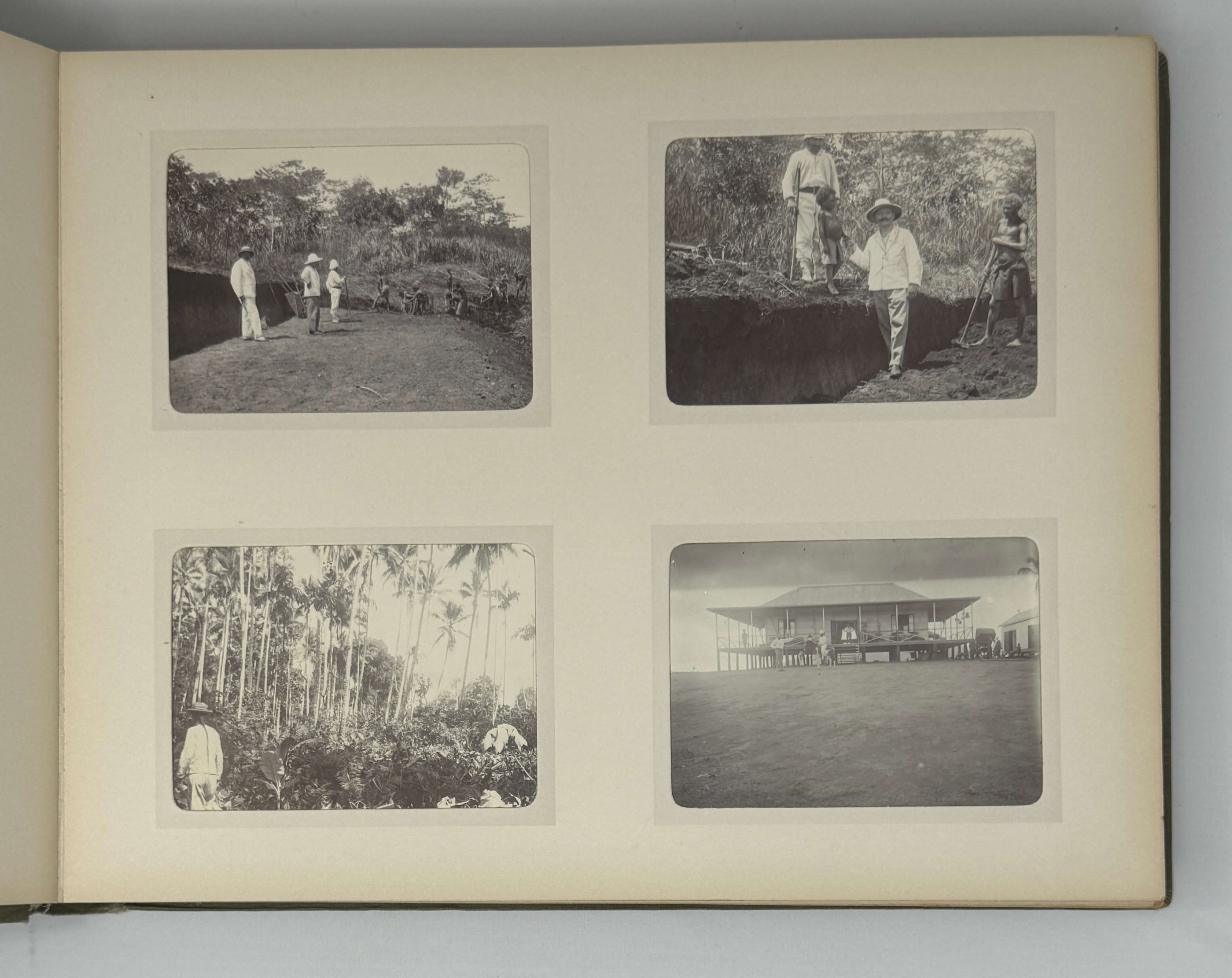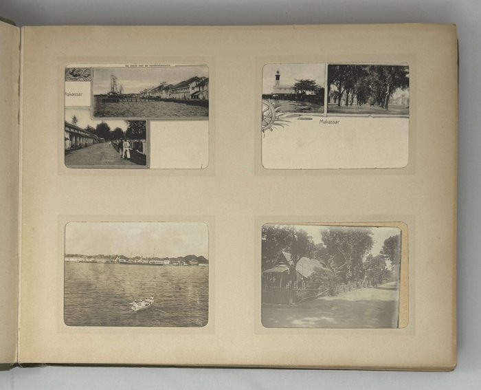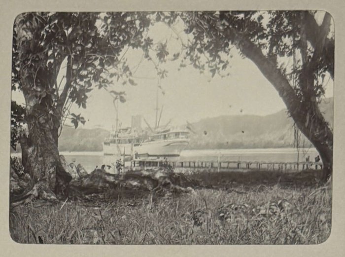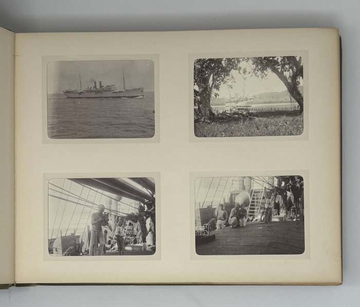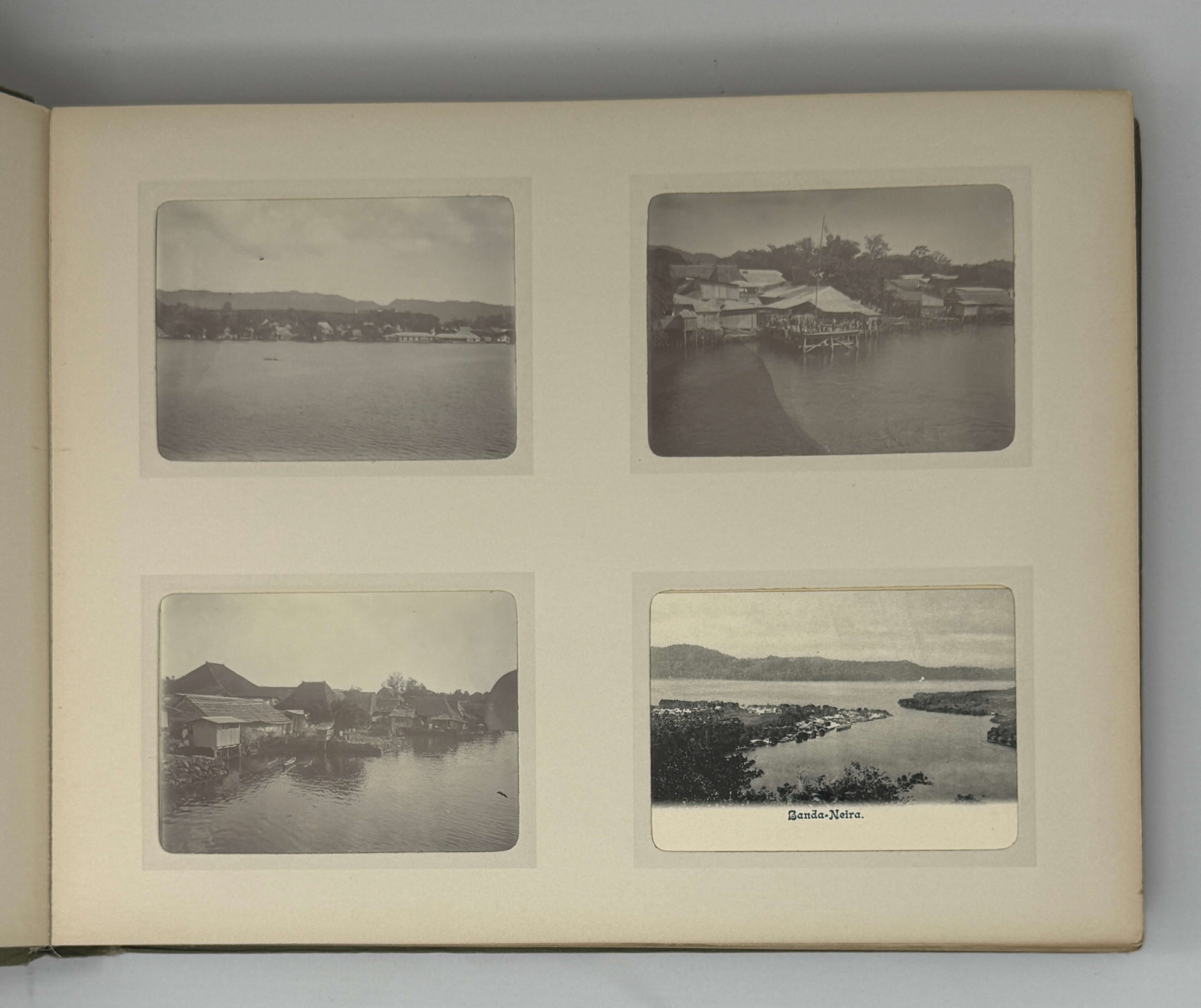 The album opens with twenty-one photos and seven printed postcards, dating back to the compiler’s voyage to the South Pacific through the Dutch East Indies (modern-day Indonesia), showing streets and waterfront of Makassar (Sulawesi), volcanoes and settlements of Banda Islands (Banda Neira, Banda Api, Banda Papenberg peak), the ocean steamer which transported the travelling party (anchored in harbours), the steamer crew and native Indonesians on board the steamer, &c.