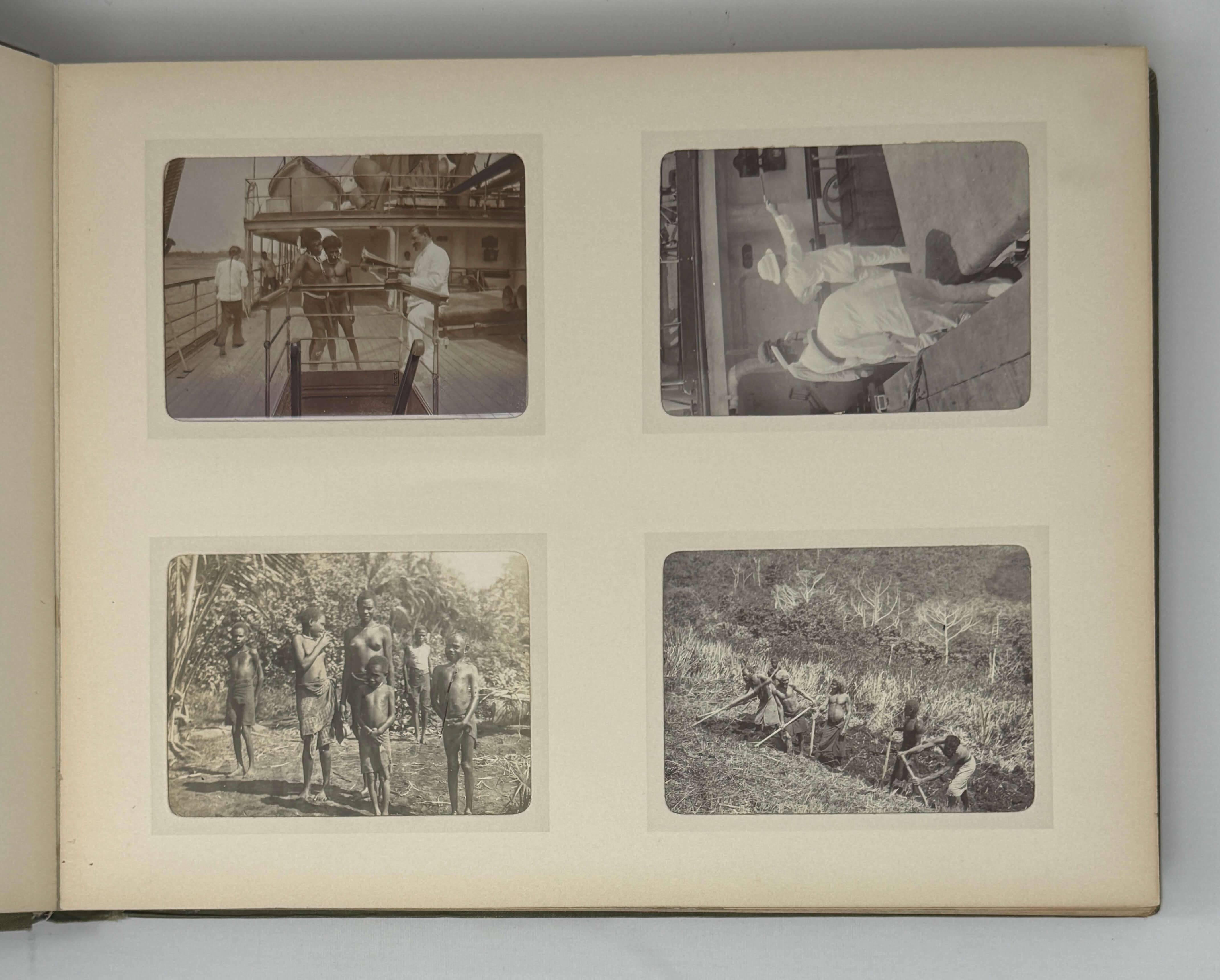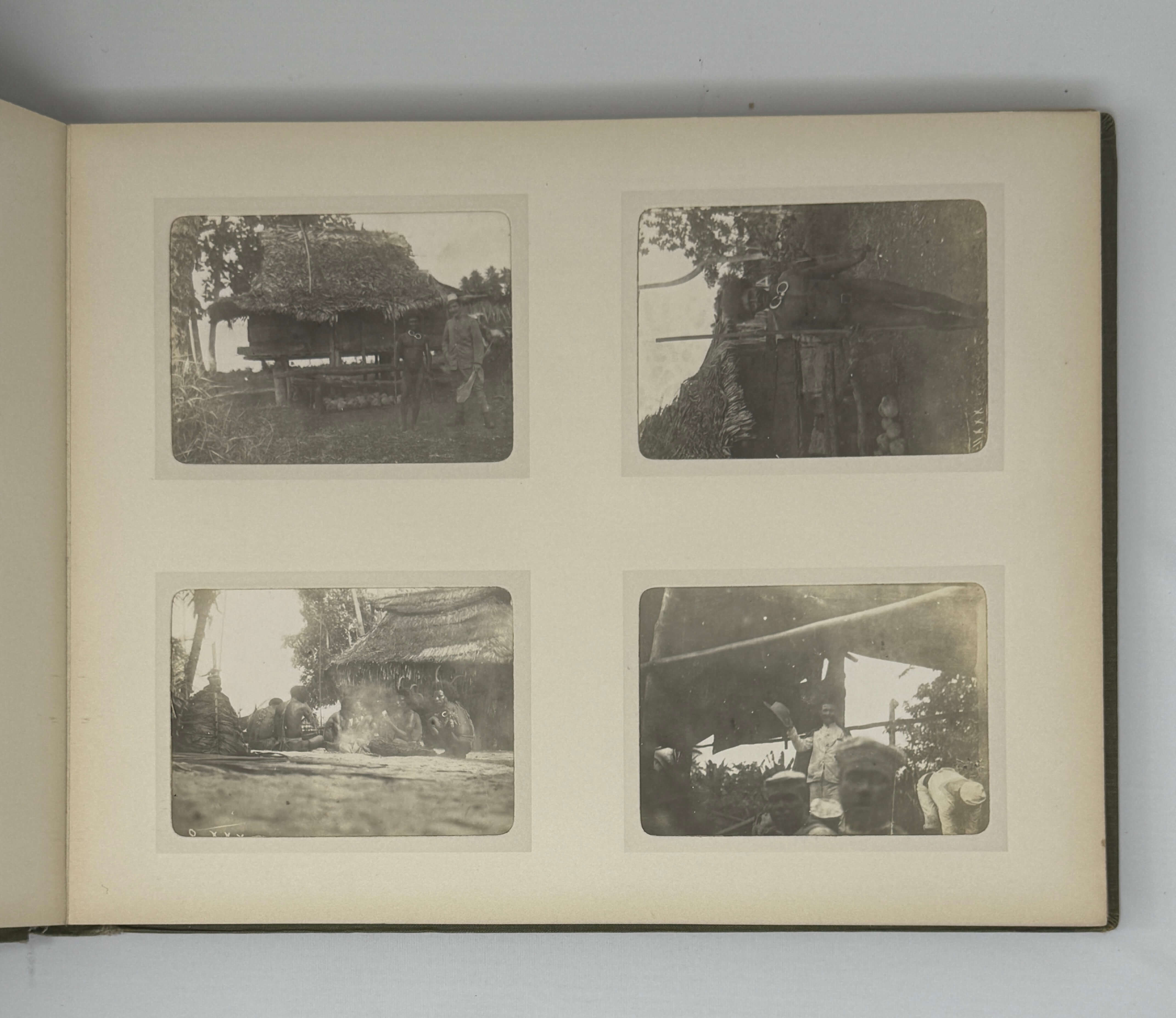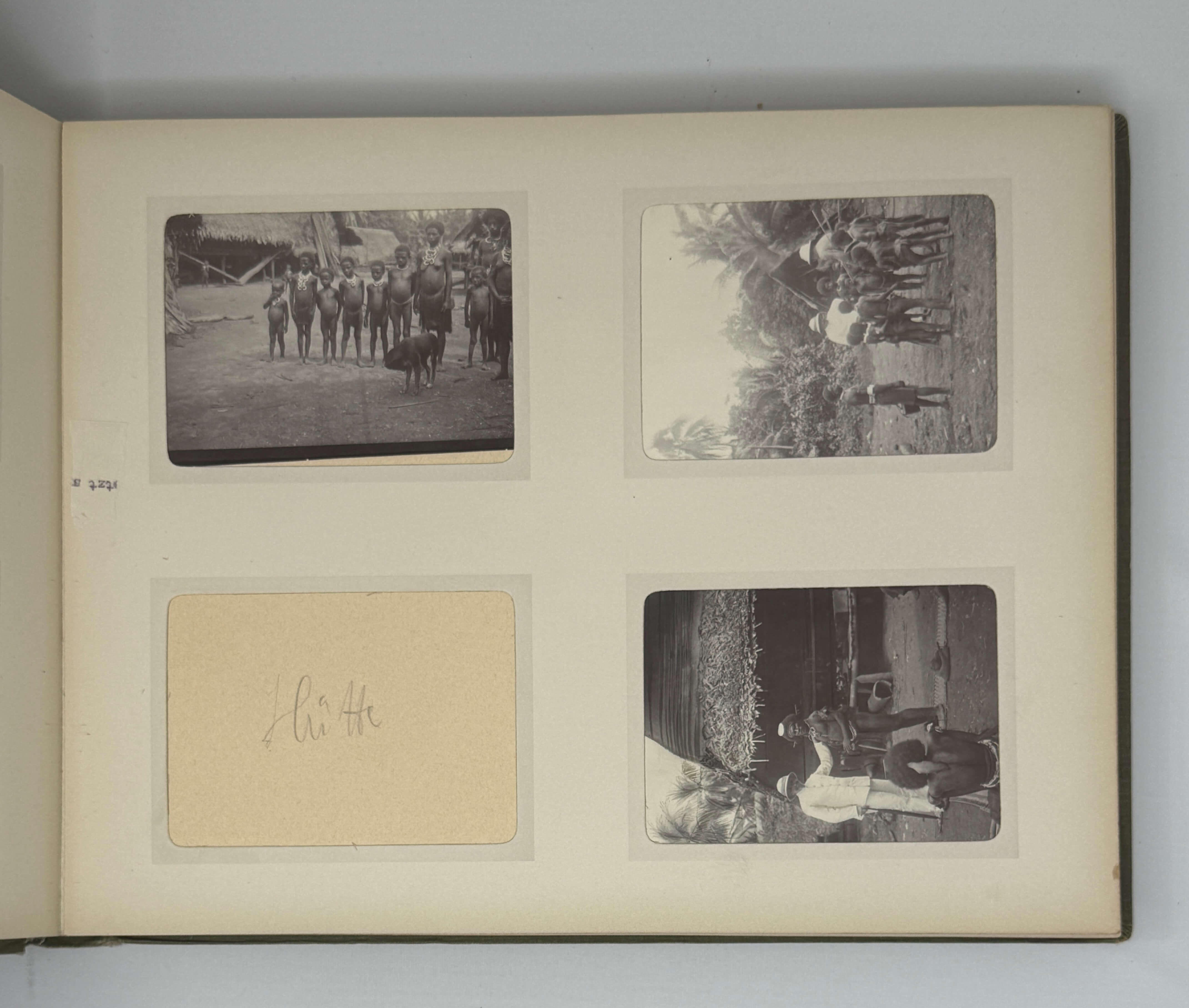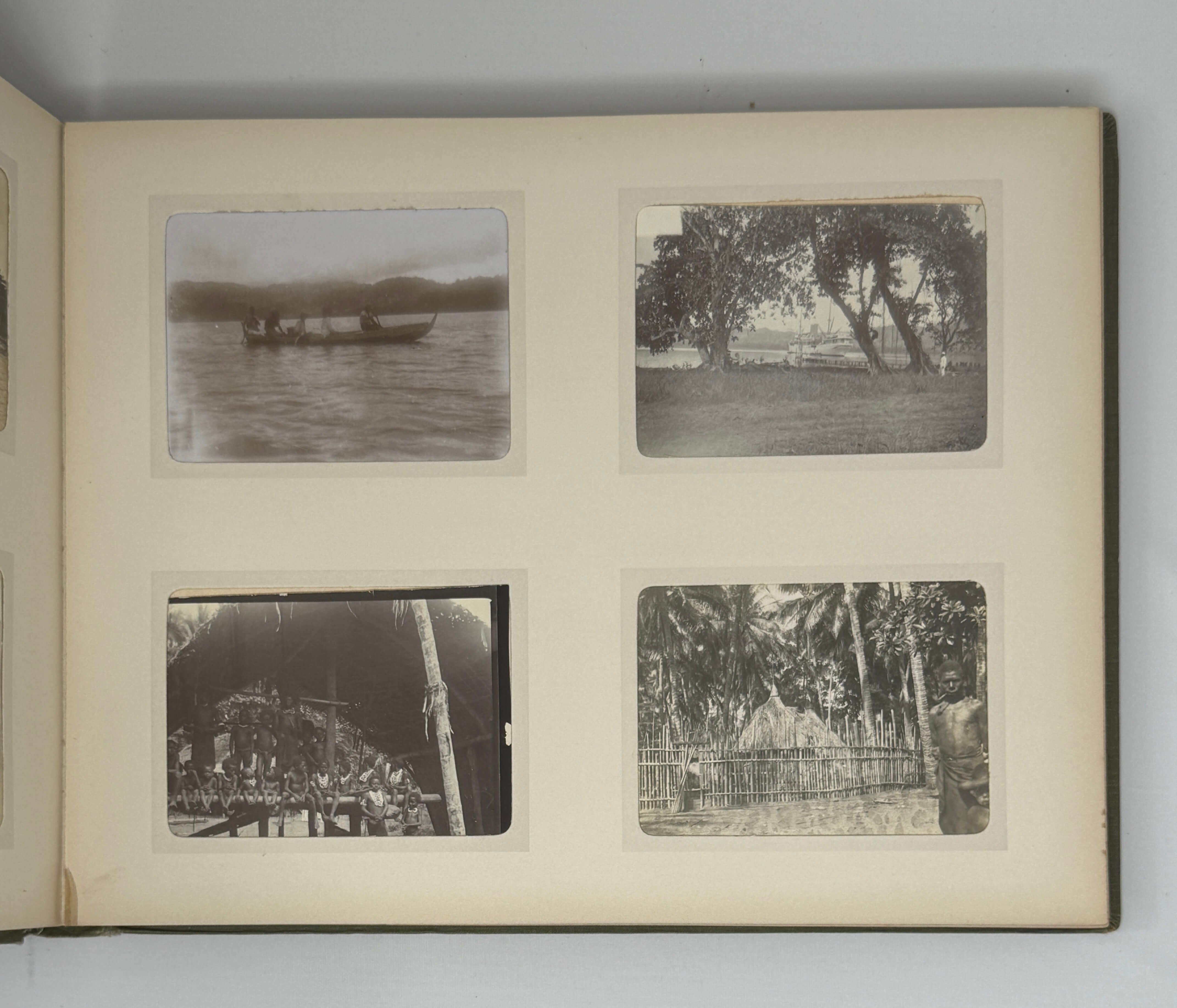 Over forty photos and five postcards show the views and people of German New Guinea - mostly of the Bismarck Archipelago (modern-day Islands Region of Papua New Guinea): native children and families from “Matupi” and “Neu Pommern, Bismarck Archipel,” views of Ralum and Herbertshöhe (Kokopo), “Landschaft bei Nusa,” harbours with the travellers’ steamship, cutter boats and native outrigger canoes, villages and palm groves, a large communal building in construction, portraits of Papuan farmers, members of local militia, people wearing traditional costumes, decorations and headdresses, Papuan men listening to a gramophone on board the steamer, a native couple (captioned “Gruss aus dem Bismarck Archipel” on the mount), &c.