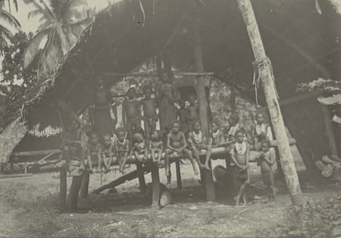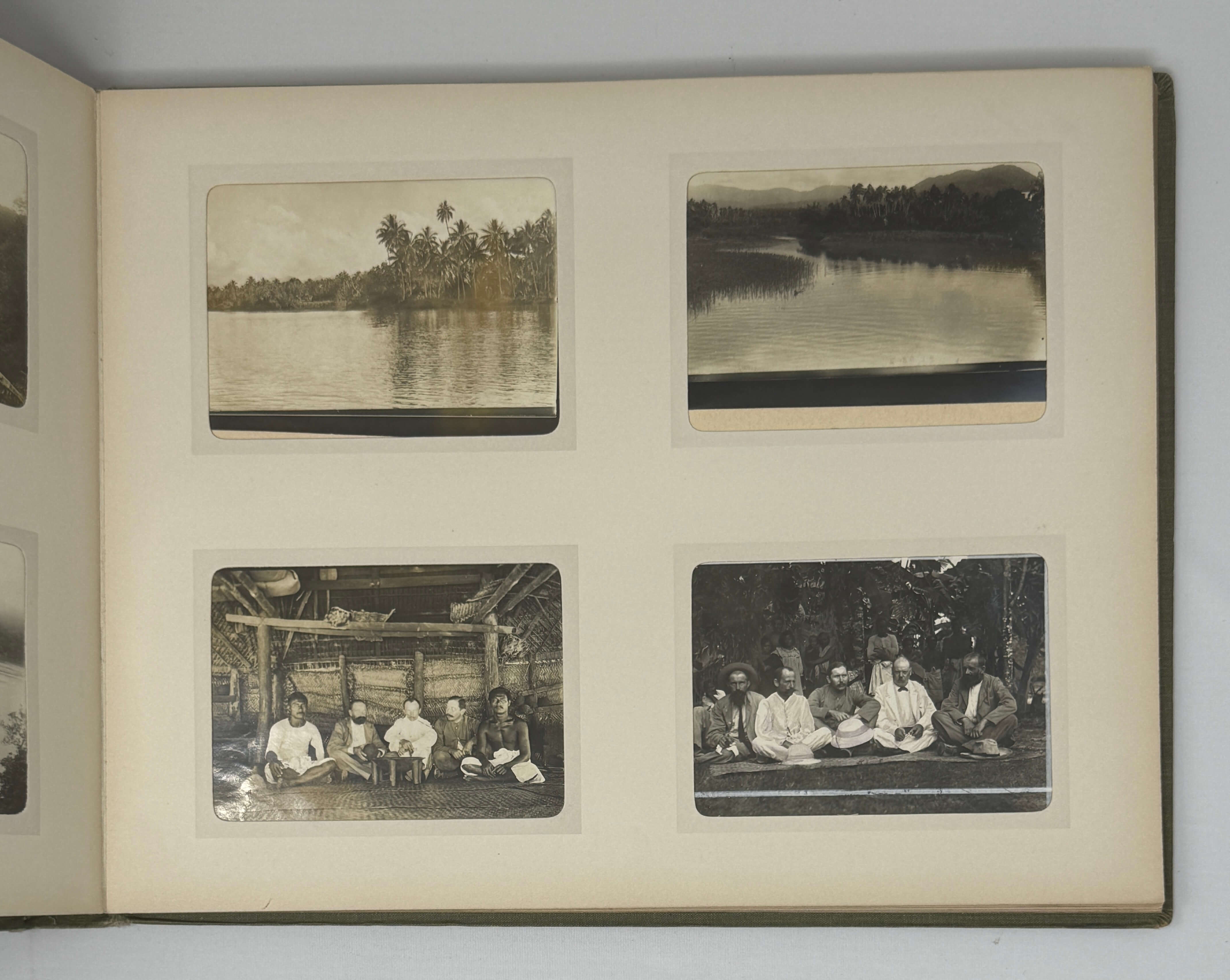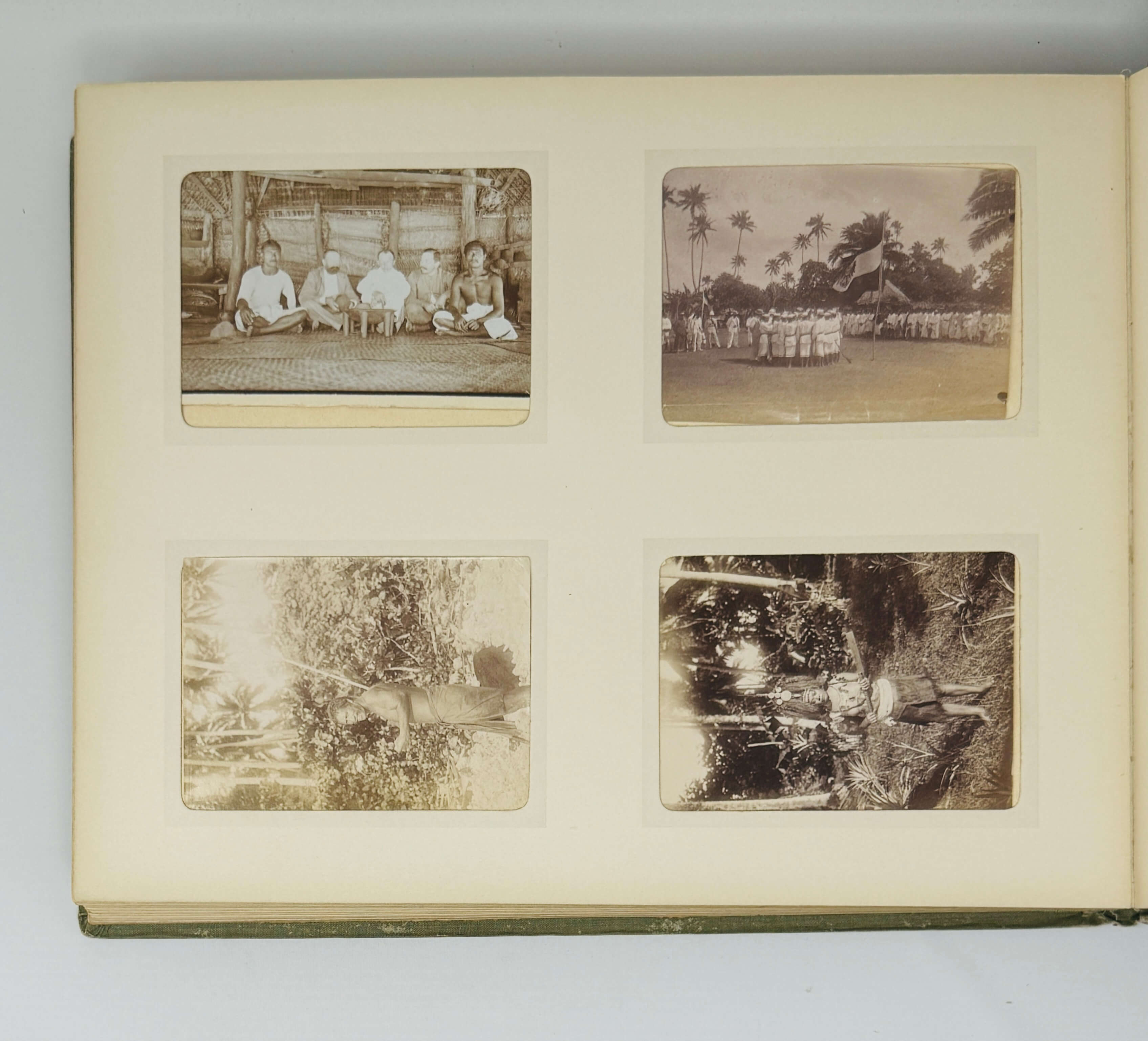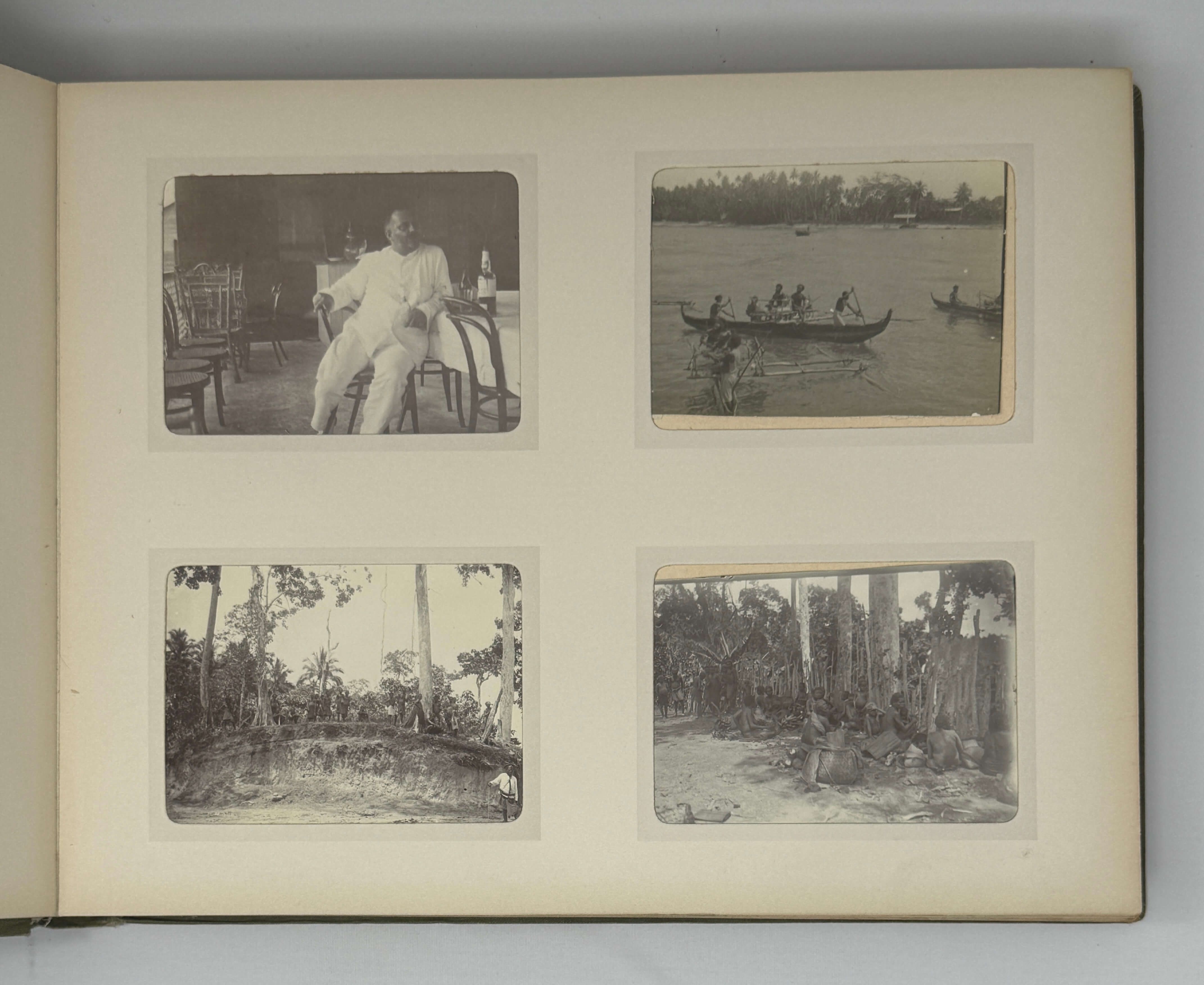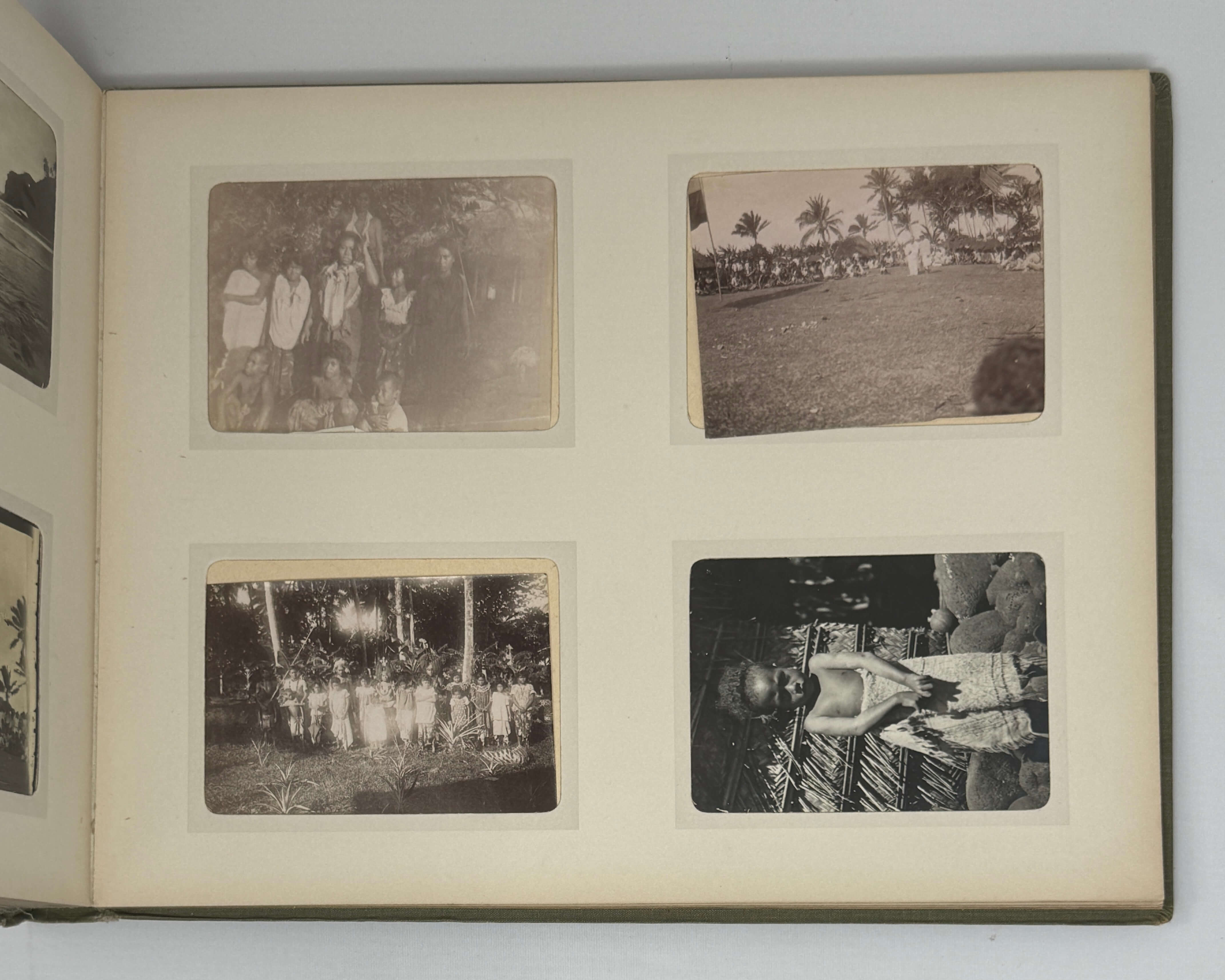 Over forty photos and five postcards show the views and people of German New Guinea - mostly of the Bismarck Archipelago (modern-day Islands Region of Papua New Guinea): native children and families from “Matupi” and “Neu Pommern, Bismarck Archipel,” views of Ralum and Herbertshöhe (Kokopo), “Landschaft bei Nusa,” harbours with the travellers’ steamship, cutter boats and native outrigger canoes, villages and palm groves, a large communal building in construction, portraits of Papuan farmers, members of local militia, people wearing traditional costumes, decorations and headdresses, Papuan men listening to a gramophone on board the steamer, a native couple (captioned “Gruss aus dem Bismarck Archipel” on the mount), &c.