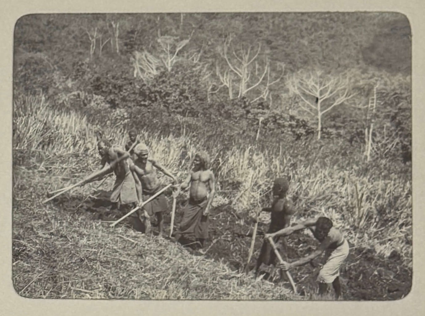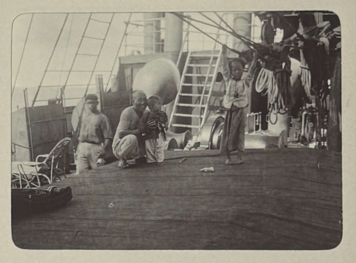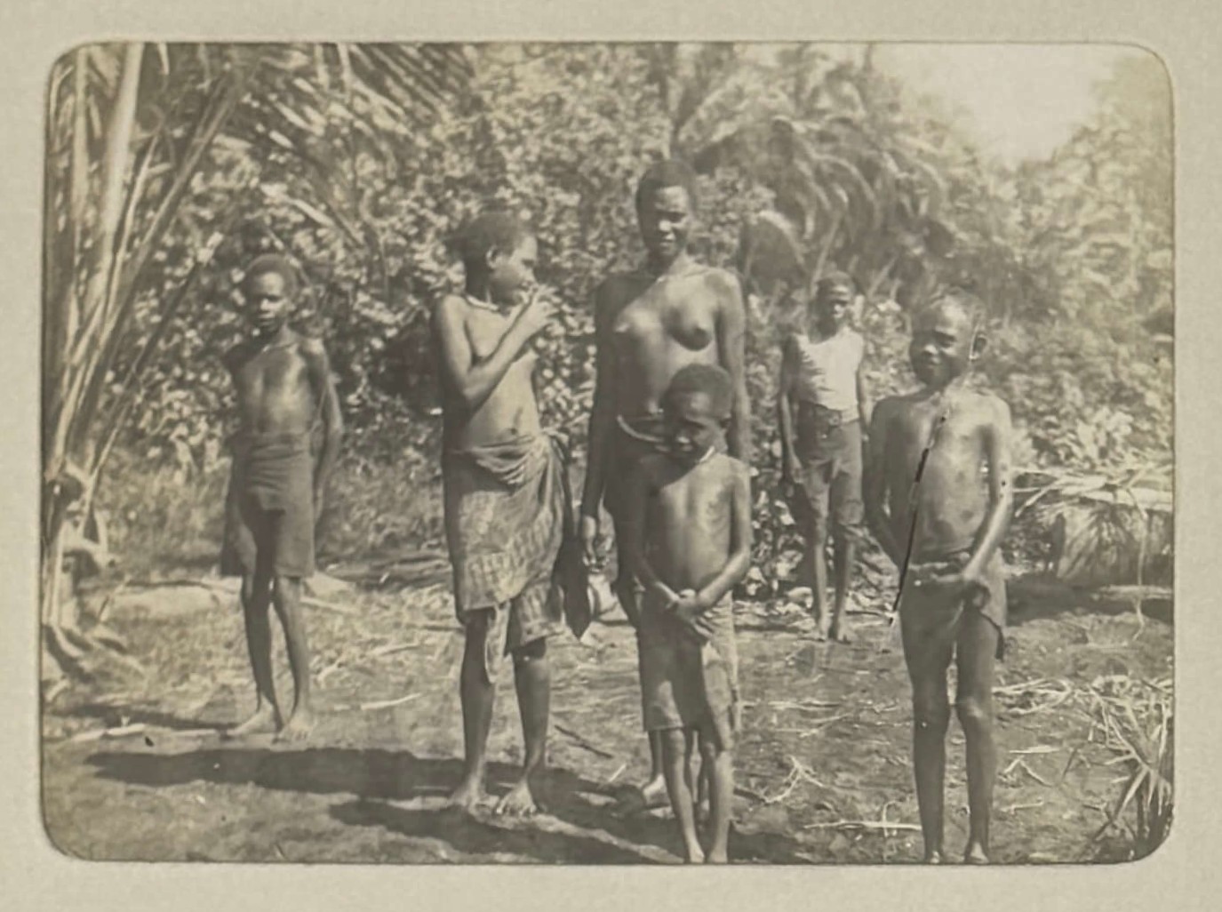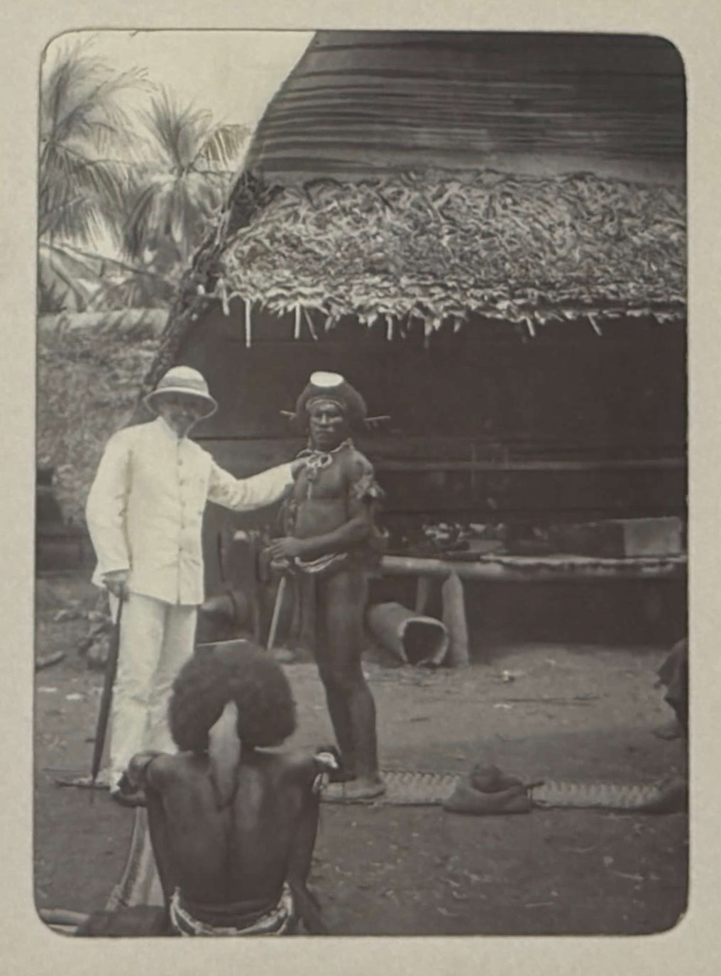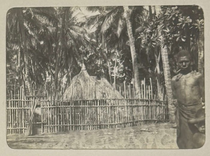 Over forty photos and five postcards show the views and people of German New Guinea - mostly of the Bismarck Archipelago (modern-day Islands Region of Papua New Guinea): native children and families from “Matupi” and “Neu Pommern, Bismarck Archipel,” views of Ralum and Herbertshöhe (Kokopo), “Landschaft bei Nusa,” harbours with the travellers’ steamship, cutter boats and native outrigger canoes, villages and palm groves, a large communal building in construction, portraits of Papuan farmers, members of local militia, people wearing traditional costumes, decorations and headdresses, Papuan men listening to a gramophone on board the steamer, a native couple (captioned “Gruss aus dem Bismarck Archipel” on the mount), &c.