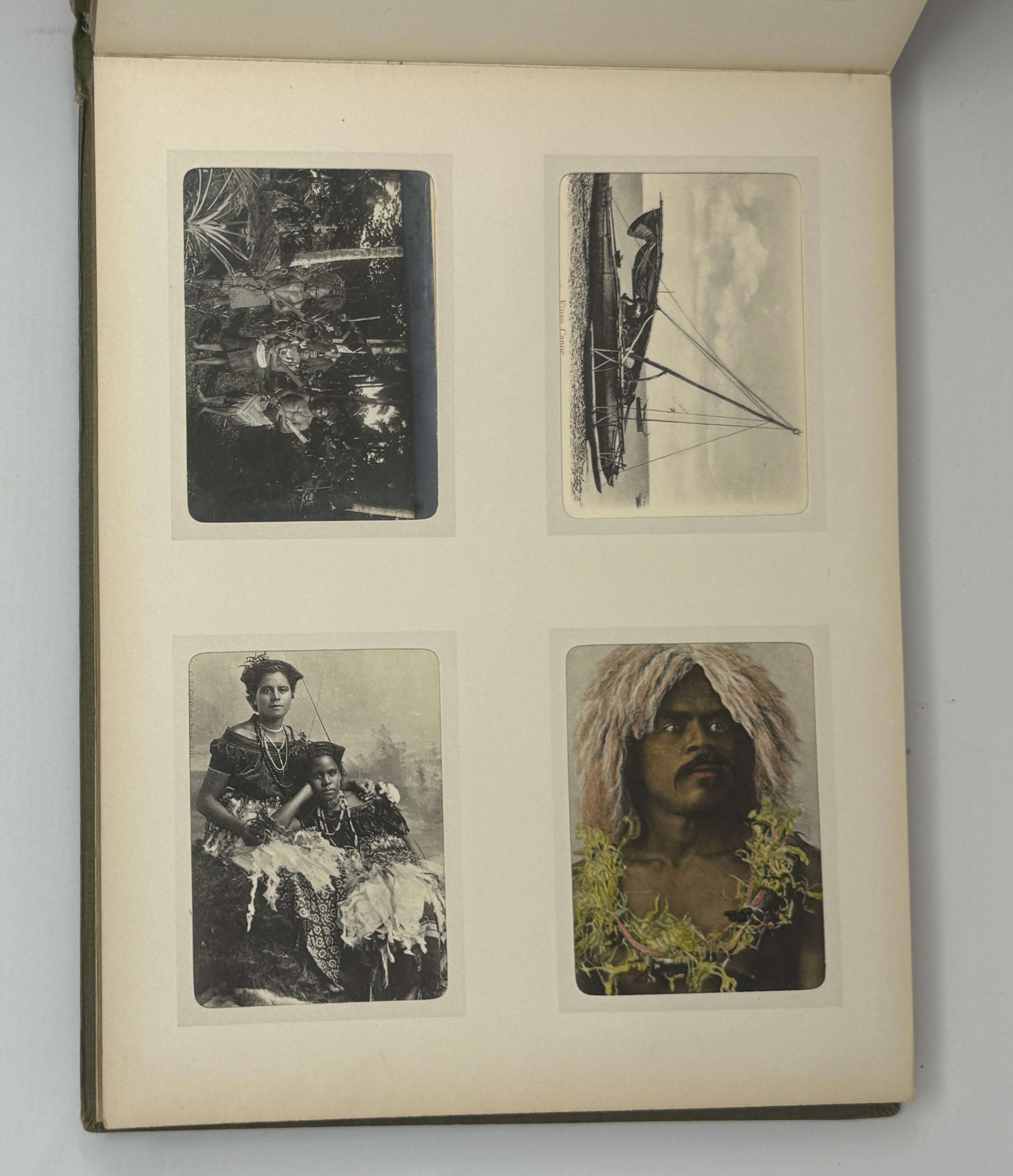 The album also contains several printed postcards and original photos of Fiji, showing “A peep of Suva,” “Fijian canoe,” “Village scene – Fiji,” “Attacked,” “Cannibal feast – Fiji,” portraits of native warriors and young women, &c.
