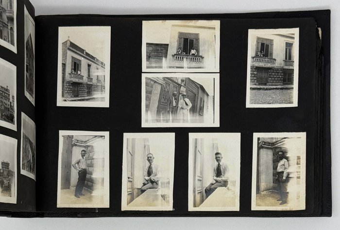 Oblong Quarto album (ca. 18,5x27 cm or 7 ¼ x 10 ½ in). 48 card stock leaves. With ca. 330 mounted original gelatin silver photos, from ca. 9x15 cm (3 ½ x 5 ¾ in) to ca. 4,5x6 cm (1 ¾ x 2 ¼ in). Fourteen photos are captioned in negative (most are also dated “1919” in negative). Period style black half sheep album with cloth boards; spine and corners with gilt-tooled borders. Several leaves at the rear with minor tears or losses of the upper outer corners, slightly affecting five or six photos, one family photo previously removed, a few photos mildly faded, but overall a very good album of interesting strong photos.