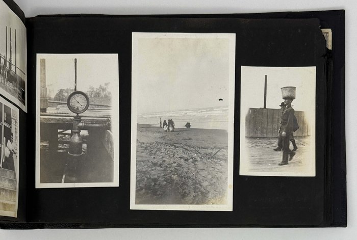 Historically significant album, compiled by a young American associate of the “Texas Company of Mexico, S.A.” (a branch of the Texaco oil company), which houses ca. 230 original gelatin silver photographs showing the company’s facilities and operations on the oil fields of the Mexican Golden Lane region south of Tampico (Amatlan and Tepetate oil fields, ocean tanker terminal near Puerto Lobos) in the late 1910s – early 1920s. Founded as the “Texas Fuel Co.” in 1902, Texaco started its operations on the coast of Mexico’s Veracruz state in the 1910s. In 1918 it built a “big tank farm” and a “sea loading line” to its terminal in Agua Dulche near Lobos Island (Oil, Paint and Drug Reporter. 22 April, 1918, p. 58c; Installation of Texas Co’s undersea pipe lines for delivering Mexican oil to vessels// The Oil Trade Journal, July 1918, pp. 80-82). All the company’s petroleum reserves and facilities were nationalized in 1938 during the Mexican oil expropriation.