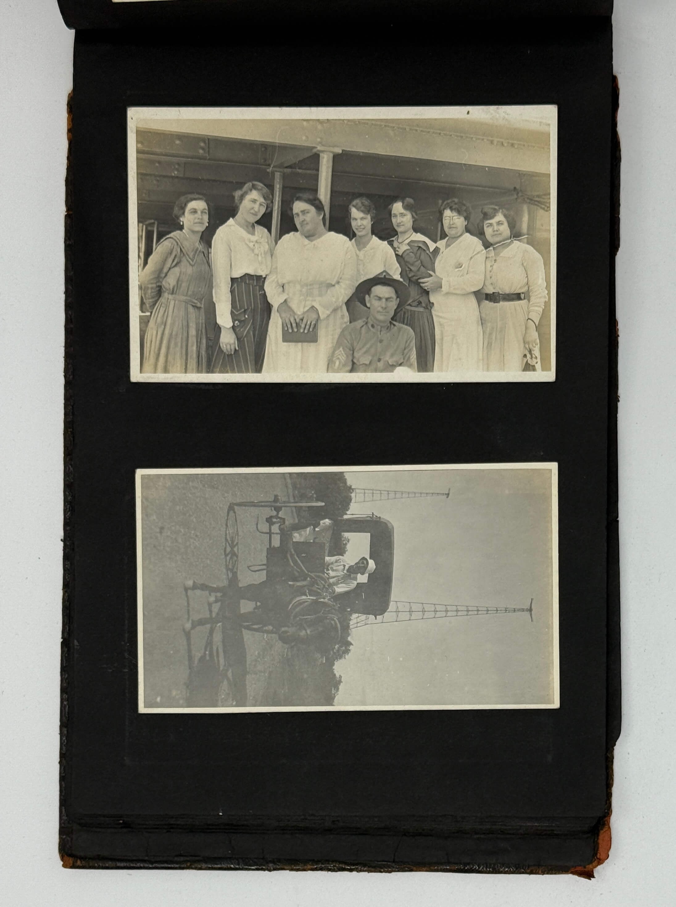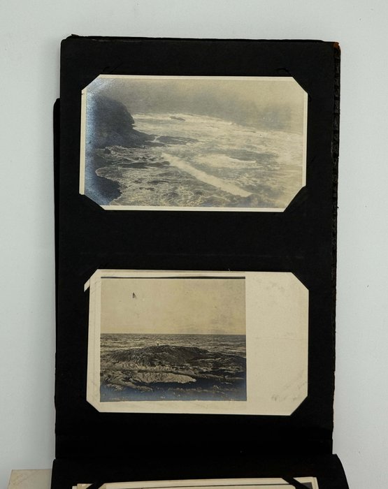 Two Real Photo Color Postcards in The Collection Show the Subano Women and Nagasaki View. Both are mounted with a strong glue, the previous owner tried to un-glue one to reveal the signature ‘P.J.’, possible date ‘1919(?)’ and readdress ‘To U.S.N.Radio Station’. Other images might be captioned at the back, this is subject to further research. The Tatoosh group of photos are loose, one of them captioned ‘This is the most lonesome place in the world’. Binding worn, several photos missing, few images loose, one of the postcards with tears, but otherwise a very good album of strong, interesting photos.