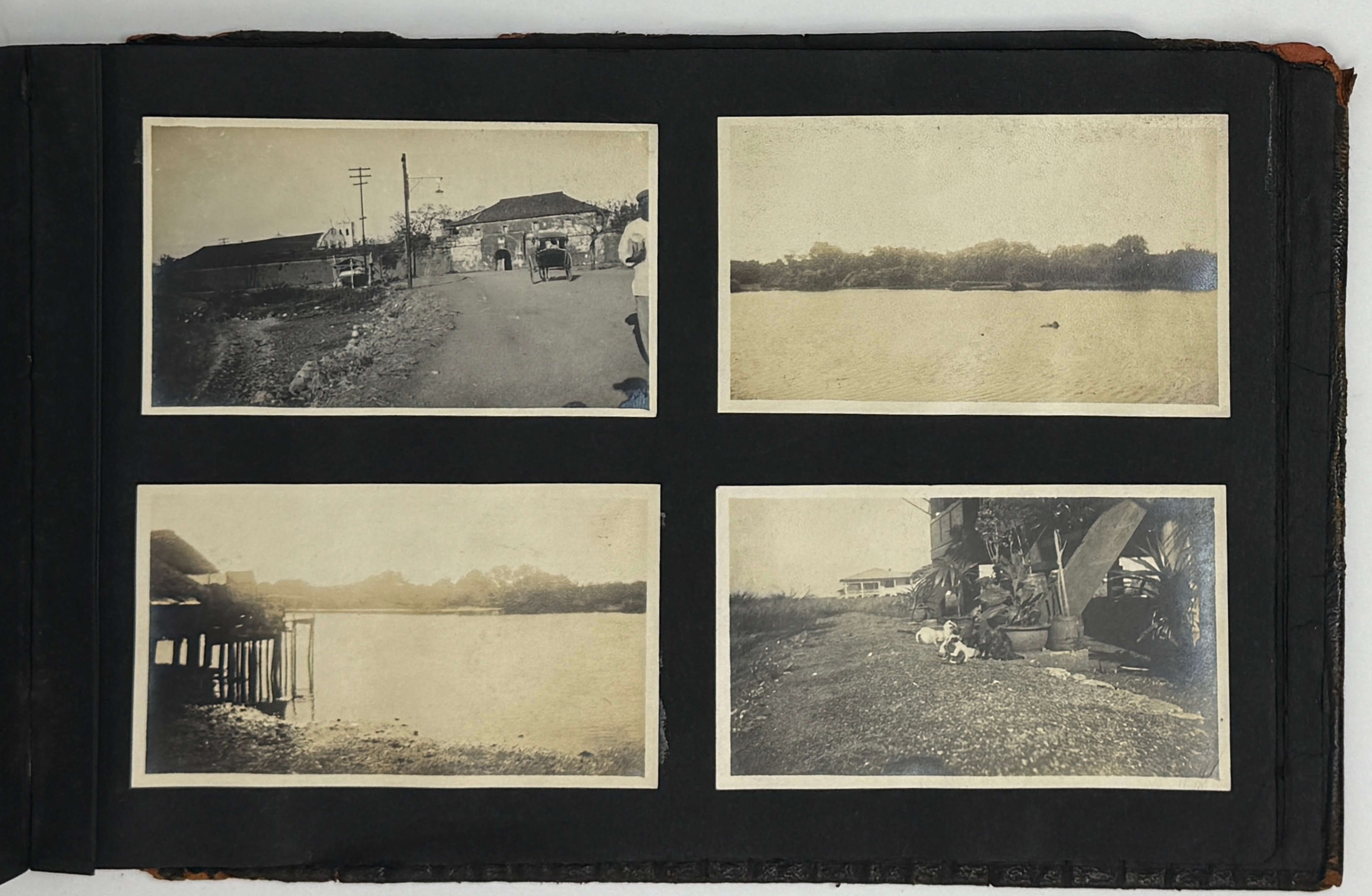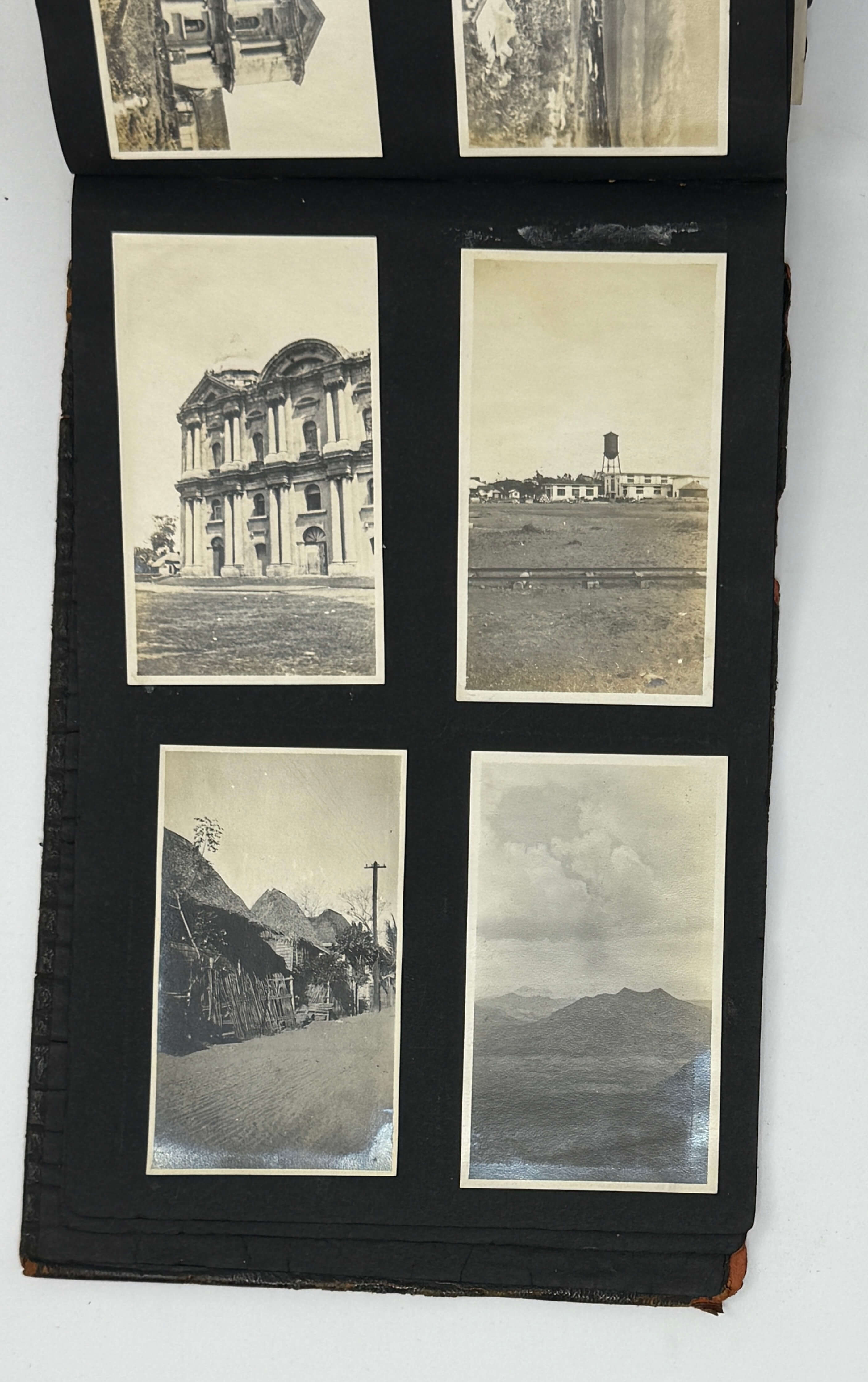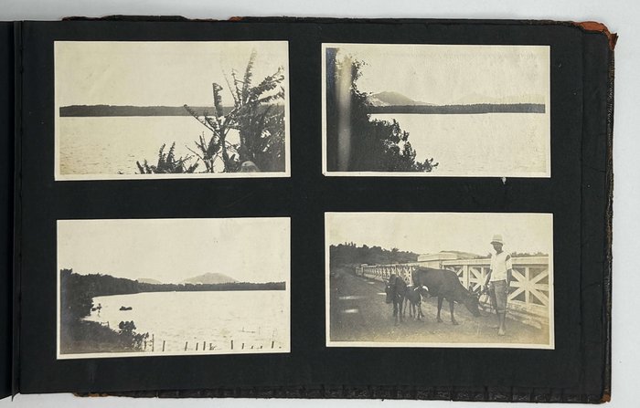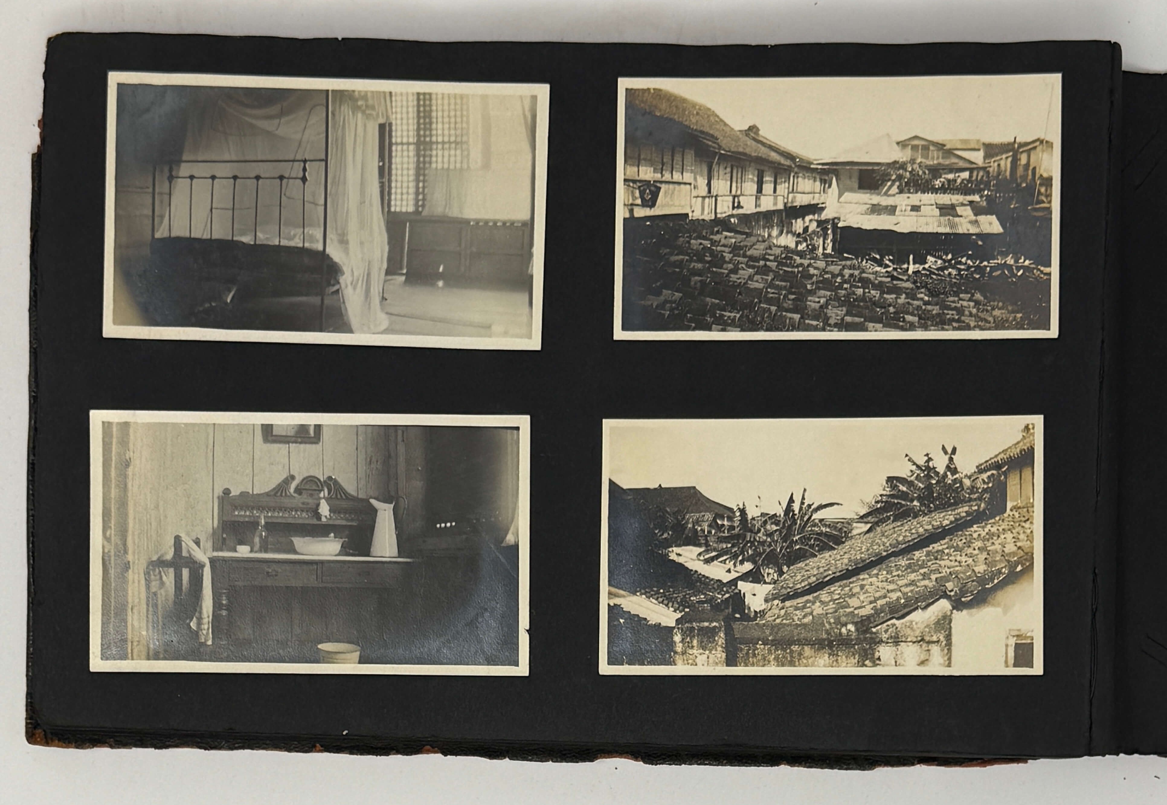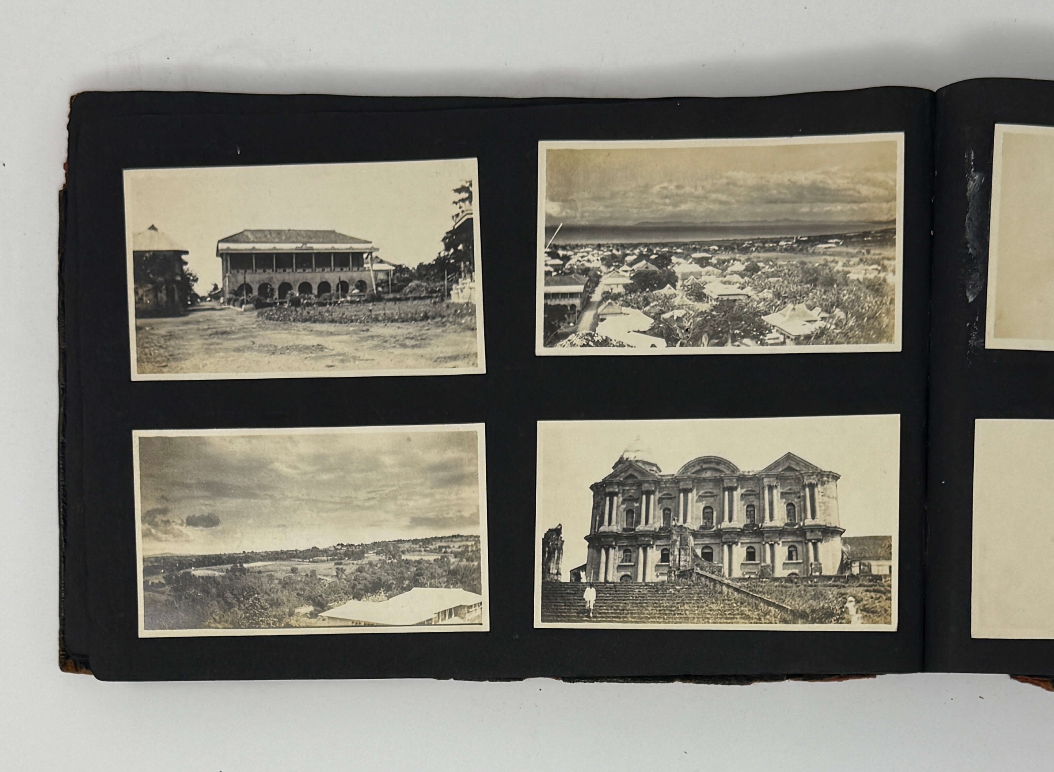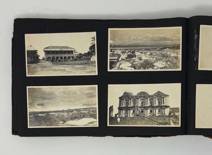 Oblong Quarto album (ca.18x29 cm). 38 paper album leaves (19 blank) . With ca. 90 mounted original gelatin silver photographs and 2 postcards from ca. 14x8,5 cm (5 ½x3¼ in) to ca. 10,9x6,5 cm (4 ¼ x 2½ in). Some photos with period caption in negative, citing ‘Banzon photos’, likely a local studio, the others without captions.