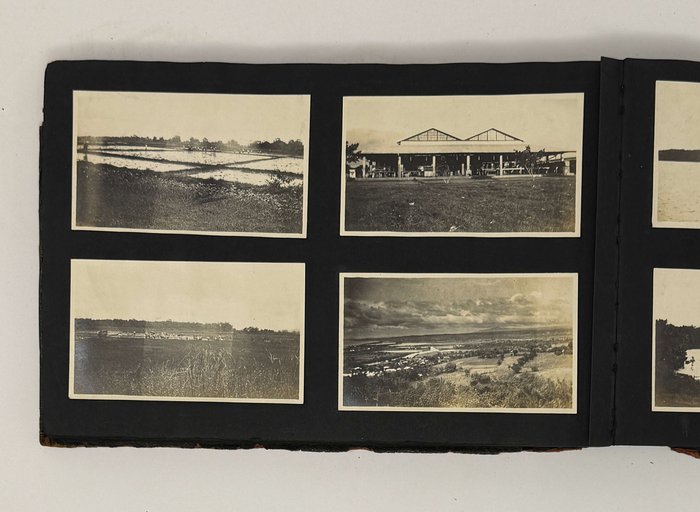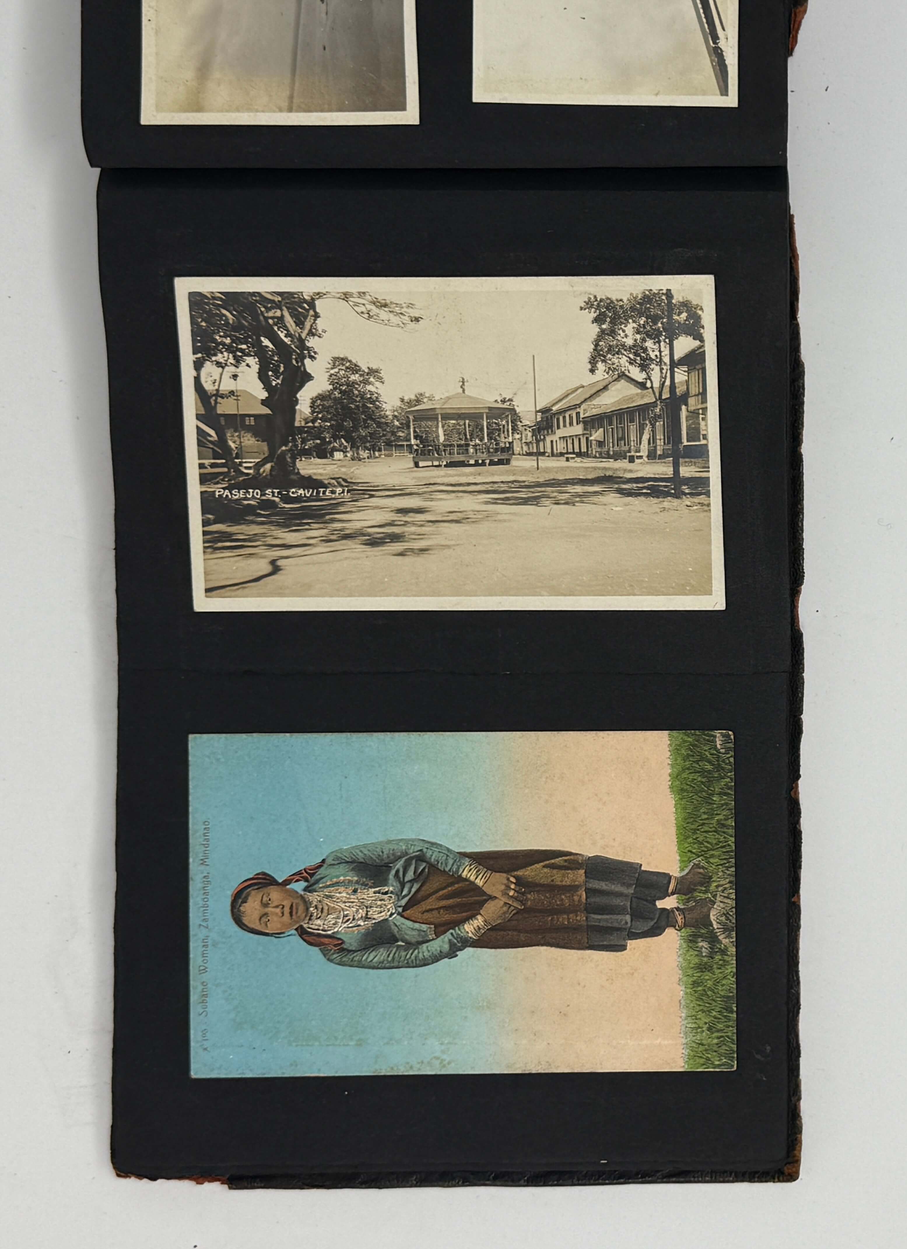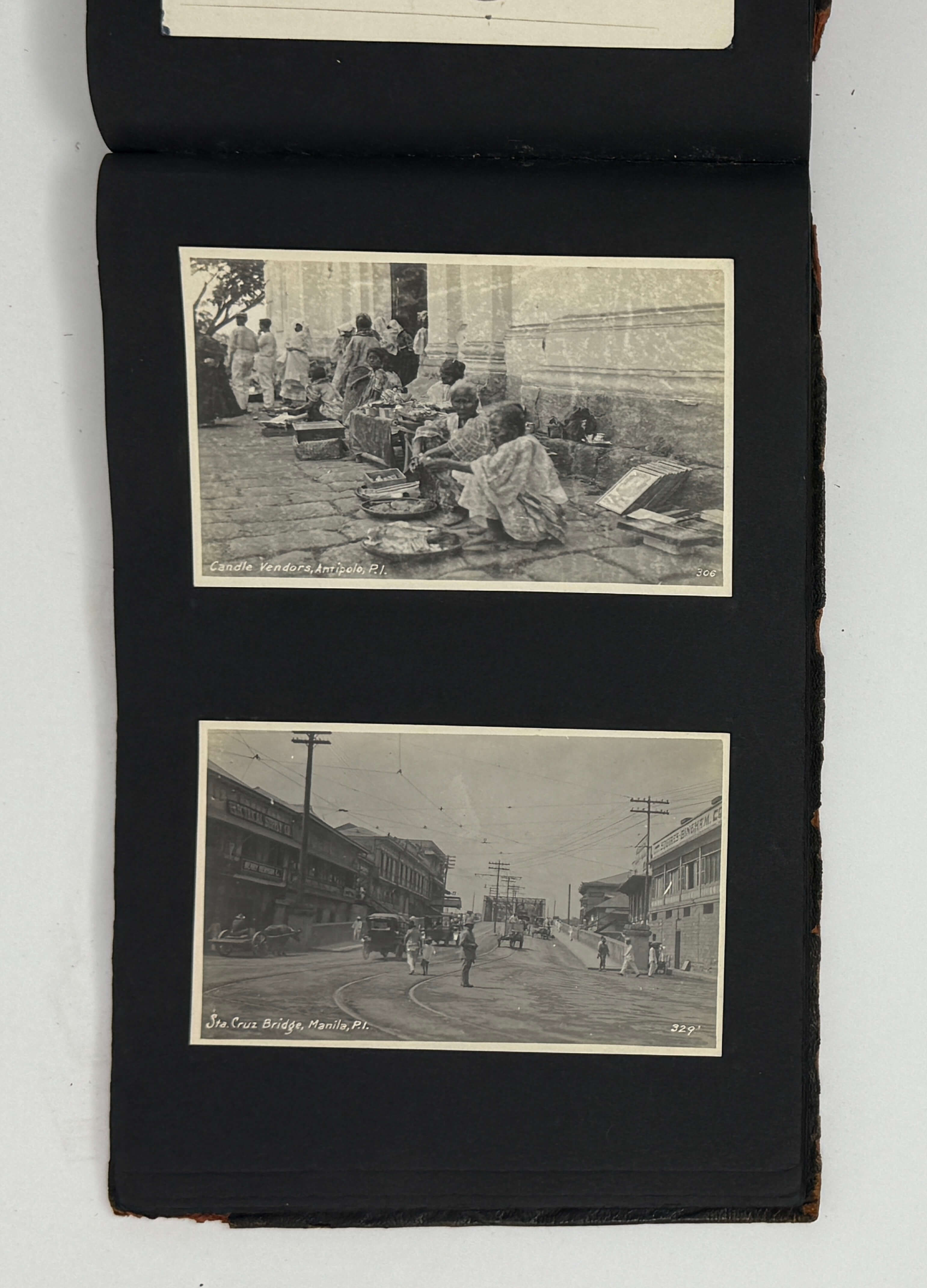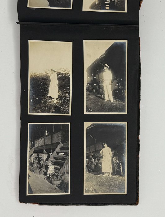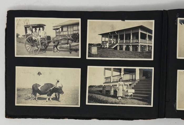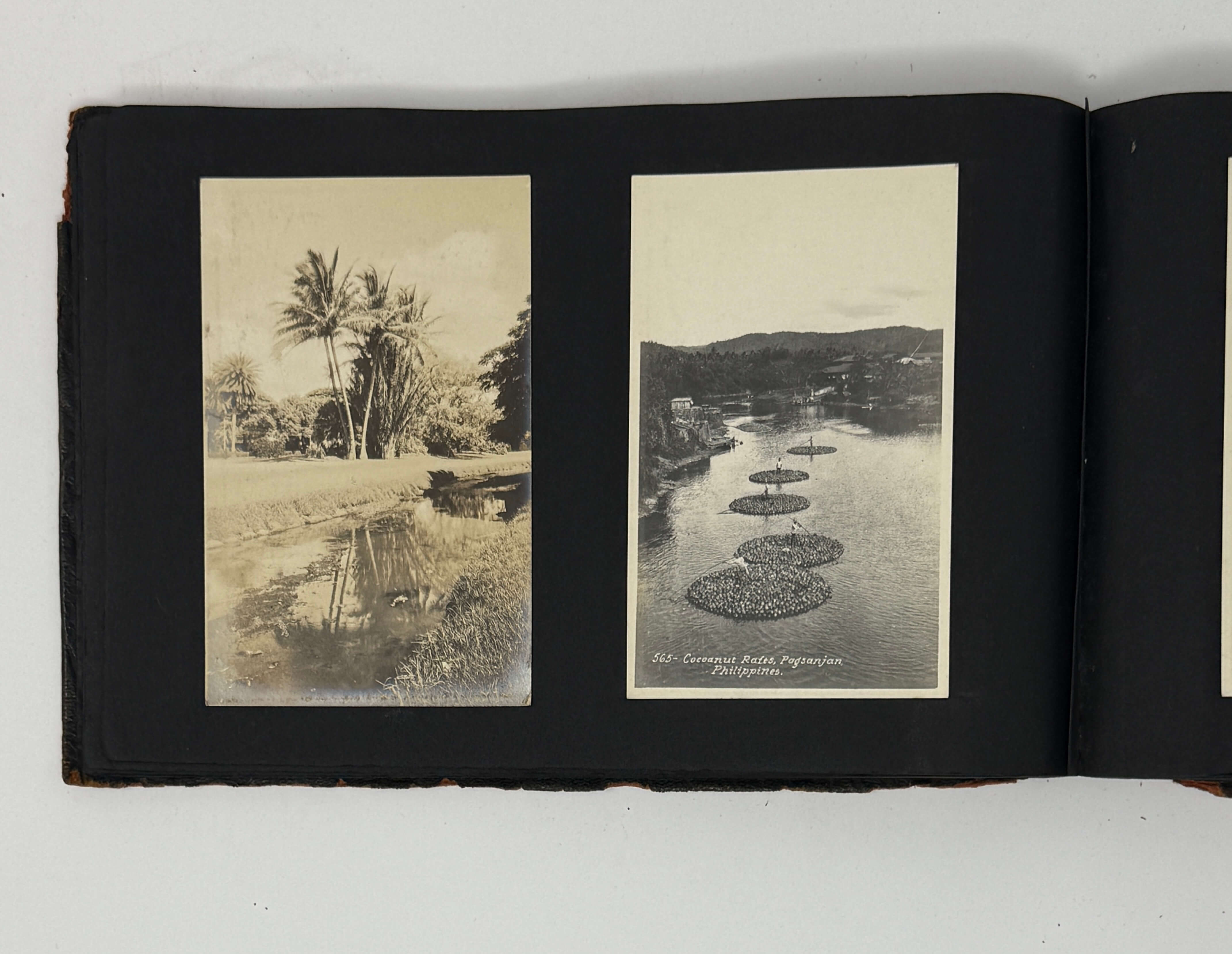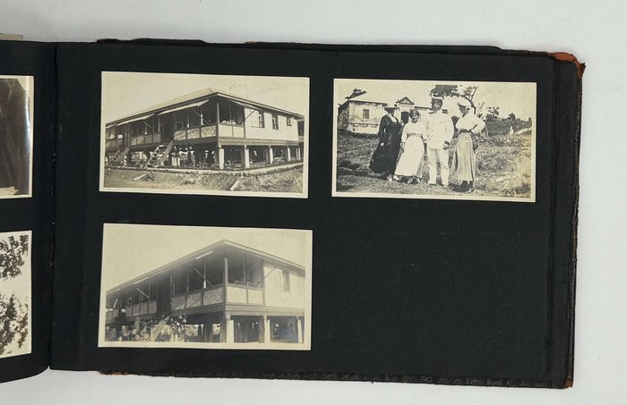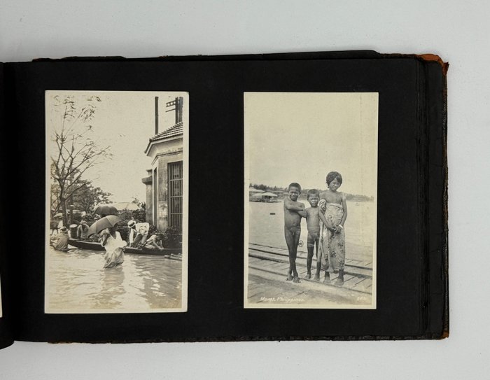 Oblong Quarto album (ca.18x29 cm). 38 paper album leaves (19 blank) . With ca. 90 mounted original gelatin silver photographs and 2 postcards from ca. 14x8,5 cm (5 ½x3¼ in) to ca. 10,9x6,5 cm (4 ¼ x 2½ in). Some photos with period caption in negative, citing ‘Banzon photos’, likely a local studio, the others without captions.